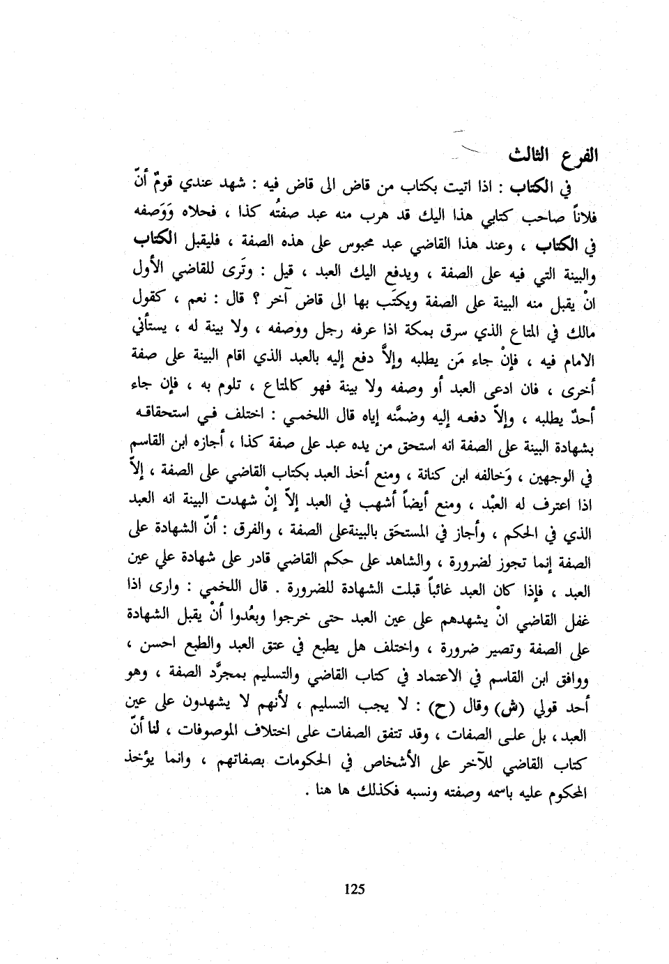 الْفَرْعُ الثَّالِثُ فِي الْكِتَابِ إِذَا أَتَيْتَ بِكِتَابٍ مِنْ قَاضٍ إِلَى قَاضٍ فِيهِ شَهِدَ عِنْدِي قَوْمٌ أَنَّ فُلَانًا صَاحِبُ كِتَابِي هَذَا إِلَيْكَ قَدْ هَرَبَ مِنْهُ عَبْدٌ صِفَتُهُ كَذَا فَحَلَاهُ وَوَصَفَهُ فِي الْكِتَابِ وَعِنْدَ هَذَا الْقَاضِي عَبْدٌ مَحْبُوسٌ عَلَى هَذِهِ الصِّفَةِ فَلْيَقْبَلِ الْكِتَابَ وَالْبَيِّنَةَ الَّتِي فِيهِ عَلَى الصِّفَةِ وَيَدْفَعُ إِلَيْكَ الْعَبْدَ قِيلَ وَتَرَى لِلْقَاضِي الْأَوَّلِ أَنْ يُقْبَلَ مِنْهُ الْبَيِّنَةُ عَلَى الصِّفَةِ وَيُكْتَبُ بِهَا إِلَى قَاضٍ آخَرَ قَالَ نَعَمْ كَقَوْلِ مَالِكٍ فِي الْمَتَاعِ الَّذِي سُرِقَ بِمَكَّةَ إِذَا عَرَفَهُ رَجُلٌ وَوَصَفَهُ وَلَا بَيِّنَةَ لَهُ يَسْتَأْنِي الْإِمَامُ فِيهِ فَإِنْ جَاءَ مَنْ يَطْلُبُهُ وَإِلَّا دَفَعَ إِلَيْهِ بِالْعَبْدِ الَّذِي أَقَامَ الْبَيِّنَةَ عَلَى صِفَةٍ أُخْرَى فَإِنِ ادَّعَى الْعَبْدَ أَوْ وَصَفَهُ وَلَا بَيِّنَةَ فَهُوَ كَالْمَتَاعِ تَلُومُ بِهِ فَإِنْ جَاءَ أَحَدٌ يَطْلُبُهُ وَإِلَّا دَفَعَهُ إِلَيْهِ وَضَمَّنَهُ إِيَّاهُ قَالَ اللَّخْمِيُّ اخْتُلِفَ فِي اسْتِحْقَاقِهِ بِشَهَادَةِ الْبَيِّنَةِ عَلَى الصِّفَةِ أَنَّهُ اسْتُحِقَّ مِنْ يَدِهِ عَبْدٌ عَلَى صِفَةِ كَذَا أَجَازَهُ ابْنُ الْقَاسِمِ فِي الْوَجْهَيْنِ وَخَالَفَهُ ابْنُ كِنَانَةَ وَمَنَعَ أَخْذَ الْعَبْدِ بِكِتَابِ الْقَاضِي عَلَى الصِّفَةِ إِلَّا إِذَا اعْتَرَفَ لَهُ الْعَبْدُ وَمَنَعَ أَيْضًا أَشْهَبُ فِي الْعَبْدِ إِلَّا إِنْ شَهِدَتِ الْبَيِّنَةُ أَنَّهُ الْعَبْدُ الَّذِي فِي الْحُكْمِ وَأَجَازَ فِي الْمُسْتَحَقِّ بِالْبَيِّنَةِ عَلَى الصِّفَةِ وَالْفَرْقُ أَنَّ الشَّهَادَةَ عَلَى الصِّفَةِ إِنَّمَا تَجُوزُ لِضَرُورَةٍ وَالشَّاهِدُ عَلَى حُكْمِ الْقَاضِي قَادِرٌ عَلَى شَهَادَةٍ عَليّ عين العَبْد فَإِن كَانَ الْعَبْدُ غَائِبًا قُبِلَتْ الشَّهَادَةُ لِلضَّرُورَةِ قَالَ اللَّخْمِيُّ وَأَرَى إِذَا غَفَلَ الْقَاضِي أَنْ يُشْهِدَهُمْ عَلَى عَيْنِ الْعَبْدِ حَتَّى خَرَجُوا وَبَعُدُوا أَنْ يَقْبَلَ الشَّهَادَةَ عَلَى الصِّفَةِ وَتَصِيرُ ضَرُورَةً وَاخْتُلِفَ هَلْ يُطْبَعُ فِي عِتْقِ الْعَبْدِ وَالطَّبْعُ أَحْسَنُ وَوَافَقَ ابْنُ الْقَاسِمِ فِي الِاعْتِمَادِ فِي كِتَابِ الْقَاضِي وَالتَّسْلِيمِ بِمُجَرَّدِ الصِّفَةِ وَهُوَ أَحَدُ قَوْلَيْ ش وَقَالَ ح لَا يَجِبُ التَّسْلِيمُ لِأَنَّهُمْ لَا يَشْهَدُونَ عَلَى عَيْنِ الْعَبْدِ بَلْ عَلَى الصِّفَاتِ وَقَدْ تَتَّفِقُ الصِّفَاتُ عَلَى اخْتِلَافِ الْمَوْصُوفَاتِ لَنَا أَنَّ كِتَابَ الْقَاضِي لِلْآخَرِ عَلَى الْأَشْخَاصِ فِي الحكومات بصفاتهم وَإِنَّمَا يَأْخُذ الْمَحْكُوم عَلَيْهِ باسمه وَصفته وَنسبه فَكَذَلِك هَا هُنَا