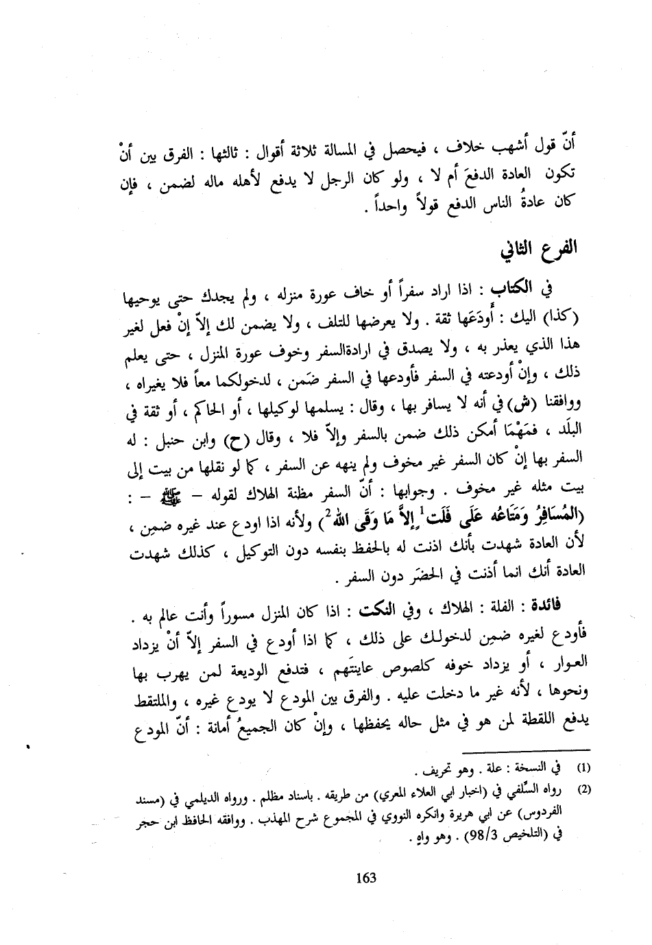 أَنَّ قَوْلَ أَشْهَبَ خِلَافٌ فَيَحْصُلُ فِي الْمَسْأَلَةِ ثَلَاثَةُ أَقْوَالٍ ثَالِثُهَا الْفَرْقُ بَيْنَ أَنْ تَكُونَ الْعَادَةُ الدَّفْعَ أَمْ لَا وَلَوْ كَانَ الرَّجُلُ لَا يَدْفَعُ لِأَهْلِهِ مَالَهُ لَضَمِنَ فَإِنْ كَانَ عَادَةُ النَّاسِ الدَّفْعَ قَوْلًا وَاحِدًا الْفَرْعُ الثَّانِي فِي الْكِتَابِ إِذَا أَرَادَ سَفَرًا أَوْ خَافَ عَورَة منزلَة وَلم يجدك حَتَّى يوحيها كَذَا إِلَيْكَ أَوْدَعَهَا ثِقَةً وَلَا يُعَرِّضُهَا لِلتَّلَفِ وَلَا يَضْمَنُ لَكَ إِلَّا إِنْ فَعَلَ لِغَيْرِ هَذَا الَّذِي يَعْذُرُ بِهِ وَلَا يَصْدُقُ فِي إِرَادَةِ السَّفَرِ وَخَوْفِ عَوْرَةِ الْمَنْزِلِ حَتَّى يَعْلَمَ ذَلِكَ وَإِنْ أَوْدَعْتَهُ فِي السَّفَرِ فَأَوْدَعَهَا فِي السَّفَرِ ضَمِنَ لِدُخُولِكُمَا مَعًا فَلَا يُغَيِّرَاهُ وَوَافَقَنَا ش فِي أَنَّهُ لَا يُسَافِرُ بِهَا وَقَالَ يُسَلِّمُهَا لِوَكِيلِهَا أَوِ الْحَاكِمِ أَوْ ثِقَةٍ فِي الْبَلَدِ فَمَهْمَا أَمْكَنَ ذَلِكَ ضَمِنَ بِالسَّفَرِ وَإِلَّا فَلَا وَقَالَ ح وَابْنُ حَنْبَلٍ لَهُ السَّفَرُ بِهَا إِنْ كَانَ السَّفَرُ غَيْرَ مُخَوِّفٍ وَلَمْ يَنْهَهُ عَنِ السَّفَرِ كَمَا لَوْ نَقَلَهَا مِنْ بَيْتٍ إِلَى بَيْتٍ مِثْلِهِ غَيْرِ مَخُوفٍ وَجَوَابُهَا أَنَّ السَّفَرَ مَظِنَّةُ الْهَلَاكِ لِقَوْلِهِ - صَلَّى اللَّهُ عَلَيْهِ وَسَلَّم َ -