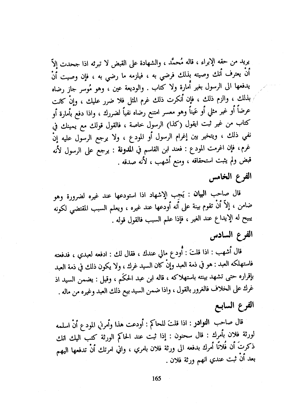 يُرِيدُ مِنْ حَقِّهِ الْإِبْرَاءَ قَالَهُ مُحَمَّدٌ وَالشَّهَادَةُ على الْقَبْض لَا تبرئه إِذا حجدت إِلَّا أَنْ يَعْتَرِفَ أَنَّكَ وَصَّيْتَهُ بِذَلِكَ فَرَضِيَ بِهِ فَيَلْزَمُهُ مَا رَضِيَ بِهِ فَإِنْ وَصَّيْتَ أَنْ يَدْفَعَهَا إِلَى الرَّسُولِ بِغَيْرِ أَمَارَةٍ وَلَا كِتَابٍ وَالْوَدِيعَةُ عَيْنٌ وَهُوَ مُوسِرٌ جَازَ رِضَاهُ بِذَلِكَ وَأُلْزِمَ ذَلِكَ فَإِنْ أَنْكَرْتَ ذَلِكَ غَرِمَ الْمِثْلَ فَلَا ضَرَرَ عَلَيْكَ وَإِنْ كَانَتْ عَرْضًا أَوْ غَيْرَ مِثْلِيٍّ أَوْ عَيْنًا وَهُوَ مُعْسِرٌ امْتَنَعَ رِضَاهُ نَفْيًا لِضَرَرِكَ وَإِذَا دَفَعَ بِأَمَارَةٍ أَو كتاب من غير ثَبت أيقول كَذَا الرَّسُولُ خَاصَّةً فَالْقَوْلُ قَوْلُكَ مَعَ يَمِينِكَ فِي نَفْيِ ذَلِكَ وَيَتَخَيَّرُ بَيْنَ إِغْرَامِ الرَّسُولِ أَوِ الْمُودِعِ وَلَا يَرْجِعُ الرَّسُولُ عَلَيْهِ إِنْ غَرِمَ فَإِنْ أَغْرَمْتَ الْمُودَعَ فَعِنْدَ ابْنِ الْقَاسِمِ فِي الْمُدَوَّنَةِ يَرْجِعُ عَلَى الرَّسُولِ لِأَنَّهُ قَبَضَ وَلَمْ يَثْبُتِ اسْتِحْقَاقُهُ وَمَنَعَ أَشْهَبُ لِأَنَّهُ صَدَّقَهُ الْفَرْعُ الْخَامِسُ قَالَ صَاحِبُ الْبَيَانِ يَجِبُ الْإِشْهَادُ إِذَا اسْتَوْدَعَهَا عِنْدَ غَيْرِهِ لِضَرُورَةٍ وَهُوَ ضَامِنٌ إِلَّا أَنْ تَقُومَ بَيِّنَةٌ عَلَى أَنَّهُ أَوْدَعَهَا عِنْدَ غَيْرِهِ وَيَعْلَمُ السَّبَبَ الْمُقْتَضِيَ لِكَوْنِهِ يُبِيحُ لَهُ الْإِيدَاعَ عِنْدَ الْغَيْرِ فَإِذَا عَلِمَ السَّبَبَ فَالْقَوْلُ قَوْلُهُ الْفَرْعُ السَّادِسُ قَالَ أَشْهَبُ إِذَا قُلْتَ أُودِعُ مَالِي عِنْدَكَ فَقَالَ لَكَ ادْفَعْهُ لِعَبْدِي فَدَفَعْتَهُ فَاسْتَهْلَكَهُ الْعَبْدُ هُوَ فِي ذِمَّةِ الْعَبْدِ وَإِنْ كَانَ السَّيِّدُ غَرَّكَ وَلَا يَكُونُ ذَلِكَ فِي ذمَّة العَبْد بِإِقْرَارِهِ حَتَّى تشهد بَينته بِاسْتِهْلَاكِهِ قَالَهُ ابْنُ عَبْدِ الْحَكَمِ وَقِيلَ يَضْمَنُ السَّيِّدُ إِذْ غَرَّكَ عَلَى الْخِلَافِ فَالْغُرُورُ بِالْقَوْلِ وَإِذَا ضَمِنَ السَّيِّدُ بيعَ ذَلِكَ الْعَبْدِ وَغَيْرَهُ مِنْ مَالِهِ الْفَرْعُ السَّابِعُ قَالَ صَاحِبُ النَّوَادِرِ إِذَا قُلْتَ لِلْحَاكِمِ أُودِعْتُ هَذَا وَأَمَرَنِي الْمُودِعُ أَنْ أُسَلِّمَهُ لِوَرَثَةِ فُلَانٍ بِأَمْرِكَ قَالَ سَحْنُونٌ إِذَا ثَبَتَ عِنْدَ الْحَاكِمِ الْوَرَثَةُ كَتَبَ إِلَيْكَ أَنَّكَ ذَكَرْتَ أَنَّ فُلَانًا أَمَرَكَ بِدَفْعِهِ إِلَى فُلَانٍ بِأَمْرِي وَإِنِّي أَمَرْتُكَ أَنْ تَدْفَعَهَا إِلَيْهِمْ بَعْدَ أَنْ ثَبَتَ عِنْدِي أَنَّهُمْ وَرَثَةُ فُلَانٍ