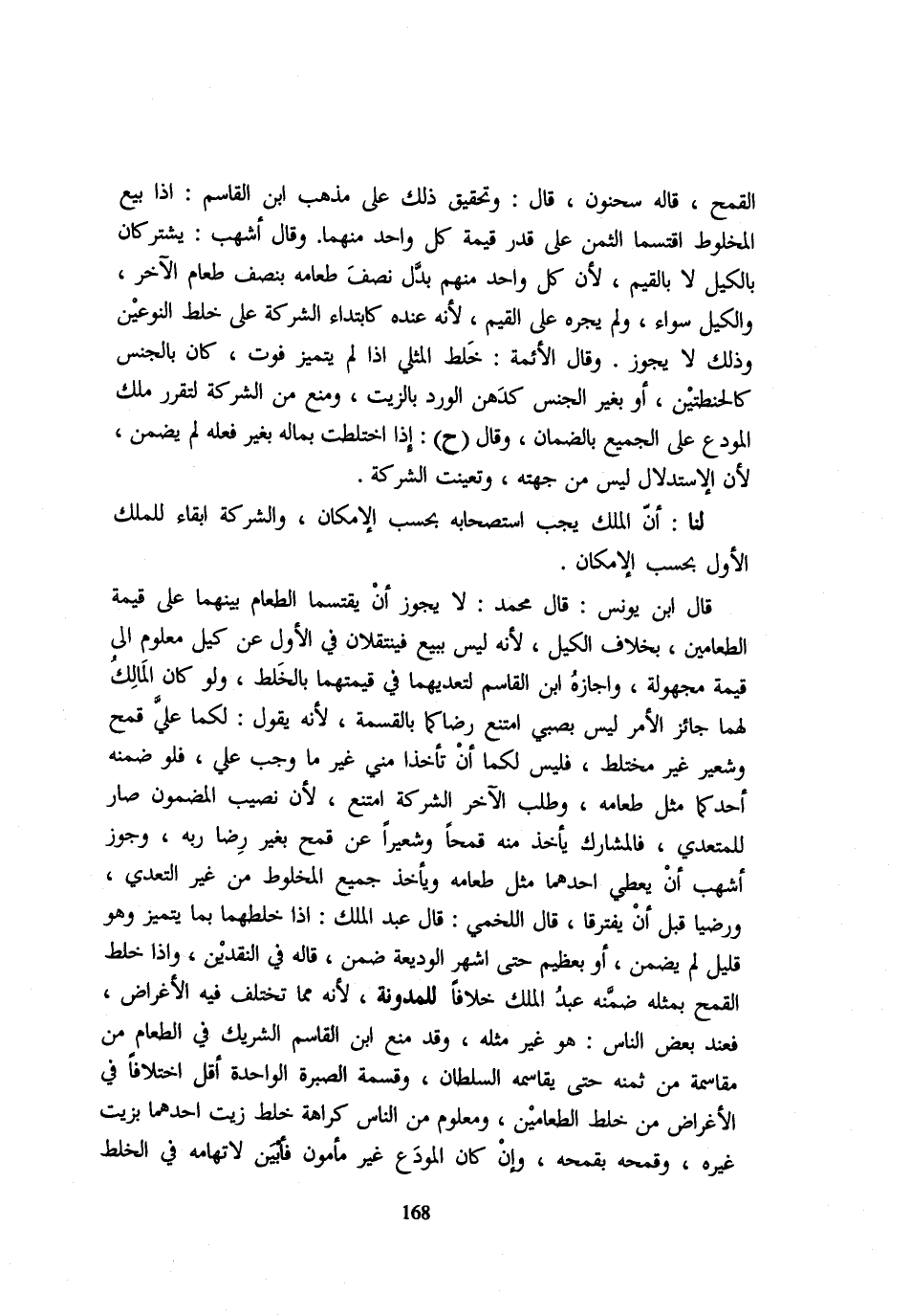 الْقَمْحُ قَالَهُ سَحْنُونٌ قَالَ وَتَحْقِيقُ ذَلِكَ عَلَى مَذْهَبِ ابْنِ الْقَاسِمِ إِذَا بِيعَ الْمَخْلُوطُ اقْتَسَمَا الثّمن على قدر قِيمَته كُلِّ وَاحِدٍ مِنْهُمَا وَقَالَ أَشْهَبُ يَشْتَرِكَانِ بِالْكَيْلِ لَا بِالْقِيَمِ لِأَنَّ كُلَّ وَاحِدٍ مِنْهُمْ بَدَّلَ نِصْفَ طَعَامِهِ بِنِصْفِ طَعَامِ الْآخَرِ وَالْكَيْلُ سَوَاءٌ وَلَمْ يُجْرِهِ عَلَى الْقِيَمِ لِأَنَّهُ عِنْدَهُ كَابْتِدَاءِ الشَّرِكَةِ عَلَى خَلْطِ النَّوْعَيْنِ وَذَلِكَ لَا يَجُوزُ وَقَالَ الْأَئِمَّةُ خَلْطُ الْمِثْلِيِّ إِذَا لَمْ يَتَمَيَّزْ فَوْتٌ كَانَ بِالْجِنْسِ كَالْحِنْطَتَيْنِ أَوْ بِغَيْرِ الْجِنْسِ كَدَهْنِ الْوَرْدِ بِالزَّيْتِ وَمُنِعَ مِنَ الشَّرِكَةِ لِتَقَرُّرِ مِلْكِ الْمُودَعِ عَلَى الْجَمِيعِ بِالضَّمَانِ وَقَالَ ح إِذَا اخْتَلَطَتْ بِمَالِهِ بِغَيْرِ فِعْلِهِ لَمْ يَضْمَنْ لِأَنَّ الِاسْتِدْلَالَ لَيْسَ مِنْ جِهَتِهِ وَتَعَيَّنَتِ الشَّرِكَةُ لَنَا أَنَّ الْمِلْكَ يَجِبُ اسْتِصْحَابُهُ بِحَسْبِ الْإِمْكَانِ وَالشَّرِكَةَ إِبْقَاءٌ لِلْمِلْكِ الْأَوَّلِ بِحَسْبِ الْإِمْكَانِ قَالَ ابْنُ يُونُسَ قَالَ مُحَمَّدٌ لَا يَجُوزُ أَنْ يقتسما الطَّعَام بَينهمَا على قِيمَته الطَّعَامَيْنِ بِخِلَافِ الْكَيْلِ لِأَنَّهُ لَيْسَ بِبَيْعٍ فَيَنْتَقِلَانِ فِي الأول عَن كيل مَعْلُوم إِلَى قِيمَته مَجْهُولَةٍ وَأَجَازَهُ ابْنُ الْقَاسِمِ لِتَعَدِّيهِمَا فِي قِيمَتِهِمَا بِالْخَلْطِ وَلَوْ كَانَ الْمَالِكُ لَهُمَا جَائِزَ الْأَمْرِ لَيْسَ بِصَبِيٍّ امْتَنَعَ رِضَاكُمَا بِالْقِسْمَةِ لِأَنَّهُ يَقُولُ لَكُمَا عَلَي قَمْح وَشَعِير غَيْر مُخْتَلِطٍ فَلَيْسَ لَكُمَا أَنْ تَأْخُذَا مِنِّي غَيْرَ مَا وَجَبَ عَلَيَّ فَلَوْ ضَمِنَهُ أَحَدُكُمَا مِثْلَ طَعَامِهِ وَطَلَبَ الْآخَرُ الشَّرِكَةَ امْتَنَعَ لِأَنَّ نَصِيبَ الْمَضْمُونِ صَارَ لِلْمُتَعَدِّي فَالْمُشَارِكُ يَأْخُذُ مِنْهُ قَمْحًا وَشَعِيرًا عَنْ قَمْحٍ بِغَيْرِ رِضَا رَبِّهِ وَجَوَّزَ أَشْهَبُ أَنْ يُعْطِيَ أَحَدَهُمَا مِثْلَ طَعَامِهِ وَيَأْخُذَ جَمِيعَ الْمَخْلُوطِ مِنْ غَيْرِ التَّعَدِّي وَرَضِيَا قَبْلَ أَنْ يَفْتَرِقَا قَالَ اللَّخْمِيُّ قَالَ عَبْدُ الْمَلِكِ إِذَا خَلَطَهُمَا بِمَا يَتَمَيَّزُ وَهُوَ قَلِيلٌ لَمْ يَضْمَنْ أَوْ بِعَظِيمٍ حَتَّى أَشْهَرَ الْوَدِيعَةَ ضَمِنَ قَالَهُ فِي النَّقْدَيْنِ وَإِذَا خَلَطَ الْقَمْحَ بِمِثْلِهِ ضمنه عَبْدُ الْمَلِكِ خِلَافًا لِلْمُدَوَّنَةِ لِأَنَّهُ مِمَّا تَخْتَلِفُ فِيهِ الْأَغْرَاضُ فَعِنْدَ بَعْضِ النَّاسِ هُوَ غَيْرُ مِثْلِهِ وَقَدْ مَنَعَ ابْنُ الْقَاسِمِ الشَّرِيكَ فِي الطَّعَامِ مِنْ مُقَاسَمَةِ مَنْ ثَمَّنَهُ حَتَّى يُقَاسِمَهُ السُّلْطَانُ وَقِسْمَةُ الصَّبْرَةِ الْوَاحِدَةِ أَقَلُّ اخْتِلَافًا فِي الْأَغْرَاضِ مِنْ خَلْطِ الطَّعَامَيْنِ وَمَعْلُومٌ مِنَ النَّاسِ كَرَاهَةُ خَلْطِ زَيْتِ أَحَدِهِمَا بِزَيْتِ غَيْرِهِ وَقَمْحِهِ بِقَمْحِهِ وَإِن كَانَ الْمُودع غير مَأْمُون فأبين لاتهمامه فِي الْخَلْط