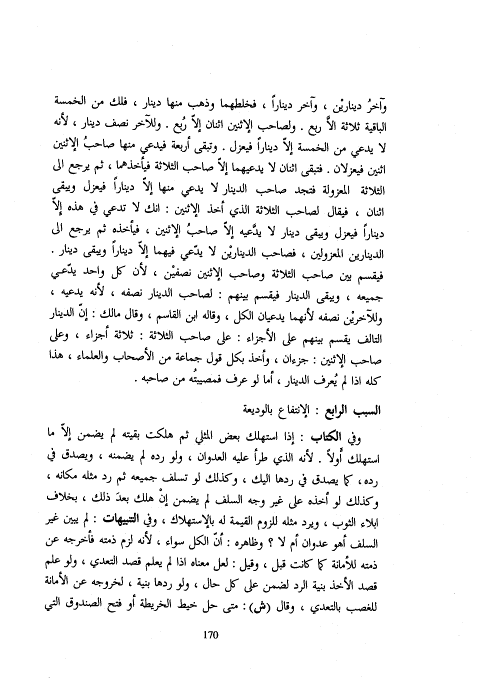 وَآخر دينارين وَآخر دِينَارا فخلطهما وَذَهَبَ مِنْهَا دِينَارٌ فَلَكَ مِنَ الْخَمْسَةِ الْبَاقِيَةِ ثَلَاثَةٌ إِلَّا رُبُعَ وَلِصَاحِبِ الِاثْنَيْنِ اثْنَانِ إِلَّا رُبُعَ وَلِلْآخَرِ نِصْفُ دِينَارٍ لِأَنَّهُ لَا يَدَّعِي مِنَ الْخَمْسَةِ إِلَّا دِينَارًا فَيُعْزَلُ وَتَبْقَى أَرْبَعَةٌ فَيَدَّعِي مِنْهَا صَاحِبُ الِاثْنَيْنِ اثْنَيْنِ فَيُعْزَلَانِ فَتَبْقَى اثْنَانِ لَا يَدَّعِيهِمَا إِلَّا صَاحِبُ الثَّلَاثَةِ فَيَأْخُذُهُمَا ثُمَّ يَرْجِعُ إِلَى الثَّلَاثَةِ الْمَعْزُولَةِ فَتَجِدُ صَاحِبَ الدِّينَارِ لَا يَدَّعِي مِنْهَا إِلَّا دِينَارًا فَيُعْزَلُ وَيَبْقَى اثْنَانِ فَيُقَالُ لِصَاحِبِ الثَّلَاثَةِ الَّذِي أَخَذَ الِاثْنَيْنِ إِنَّكَ لَا تَدَّعِي فِي هَذِهِ إِلَّا دِينَارًا فَيُعْزَلُ وَيَبْقَى دِينَارٌ لَا يَدَّعِيهِ إِلَّا صَاحِبُ الِاثْنَيْنِ فَيَأْخُذُهُ ثُمَّ يَرْجِعُ إِلَى الدِّينَارَيْنِ الْمَعْزُولَيْنِ فَصَاحِبُ الدِّينَارَيْنِ لَا يَدَّعِي فِيهِمَا إِلَّا دِينَارًا وَيَبْقَى دِينَارٌ فَيُقَسَّمُ بَيْنَ صَاحِبِ الثَّلَاثَةِ وَصَاحِبِ الِاثْنَيْنِ نِصْفَيْنِ لِأَنَّ كُلَّ وَاحِدٍ يَدَّعِي جَمِيعَهُ وَيَبْقَى الدِّينَارُ فَيُقَسَّمُ بَيْنَهُمْ لِصَاحِبِ الدِّينَارِ نِصْفُهُ لِأَنَّهُ يَدَّعِيهِ وَلِلْآخَرِينَ نَصِفُهُ لِأَنَّهُمَا يَدَّعِيَانِ الْكُلَّ وَقَالَهُ ابْنُ الْقَاسِمِ وَقَالَ مَالِكٌ إِنَّ الدِّينَارَ التَّالِفَ يُقَسَّمُ بَيْنَهُمْ عَلَى الْأَجْزَاءِ عَلَى صَاحِبِ الثَّلَاثَةِ ثَلَاثَةُ أَجْزَاءٍ وَعَلَى صَاحِبِ الِاثْنَيْنِ جُزْءَانِ وَأَخَذَ بِكُلِّ قَوْلٍ جَمَاعَةٌ مِنَ الْأَصْحَابِ وَالْعُلَمَاء وَهَذَا كُلُّهُ إِذَا لَمْ يُعْرَفِ الدِّينَارُ أَمَّا لَوْ عُرِفَ فَمُصِيبَتُهُ مَنْ صَاحِبُهُ السَّبَبُ الرَّابِعُ الِانْتِفَاعُ بِالْوَدِيعَةِ وَفِي الْكِتَابِ إِذَا اسْتُهْلِكَ بَعْضُ الْمِثْلِيِّ ثُمَّ هَلَكَتْ بَقِيَّتُهُ لَمْ يَضْمَنْ إِلَّا مَا اسْتَهْلَكَ أَوَّلًا لِأَنَّهُ الَّذِي طَرَأَ عَلَيْهِ الْعُدْوَانُ وَلَوْ رَدَّهُ لَمْ يَضْمَنْهُ وَيُصَدَّقُ فِي رَدِّهِ كَمَا يُصَدَّقُ فِي رَدِّهَا إِلَيْكَ وَكَذَلِكَ لَوْ تَسَلَّفَ جَمِيعَهُ ثُمَّ رَدَّ مِثْلَهُ مَكَانَهُ وَكَذَلِكَ لَوْ أَخَذَهُ عَلَى غَيْرِ وَجْهِ السَّلَفِ لَمْ يَضْمَنْ إِنْ هَلَكَ بَعْدَ ذَلِكَ بِخِلَافِ إِبْلَاءِ الثَّوَاب وَيَرُدُّ مِثْلَهُ لِلُزُومِ الْقِيمَةِ لَهُ بِالِاسْتِهْلَاكِ وَفِي التَّنْبِيهَاتِ لَمْ يُبَيِّنْ غَيْرَ السَّلَفِ أَهْوَ عُدْوَانٌ أَمْ لَا وَظَاهِرُهُ أَنَّ الْكُلَّ سَوَاءٌ لِأَنَّهُ لُزُوم ذِمَّتِهِ فَأَخْرَجَهُ عَنْ ذِمَّتِهِ لِلْأَمَانَةِ كَمَا كَانَتْ قبل وَقيل لَعَلَّ مَعْنَاهَا اذا لم يعلم قصدي التَّعَدِّي وَلَوْ عُلِمَ قَصْدُ الْأَخْذِ بِنِيَّةِ الرَّدِّ لَضَمِنَ عَلَى كُلِّ حَالٍ وَلَوْ رَدَّهَا بِنِيَّةٍ لِخُرُوجِهِ عَنِ الْأَمَانَةِ لِلْغَصْبِ بِالتَّعَدِّي وَقَالَ ش مَتَى حَلَّ خَيْطُ الْخَرِيطَةِ أَوْ فَتَحَ الصُّنْدُوقَ الَّتِي
