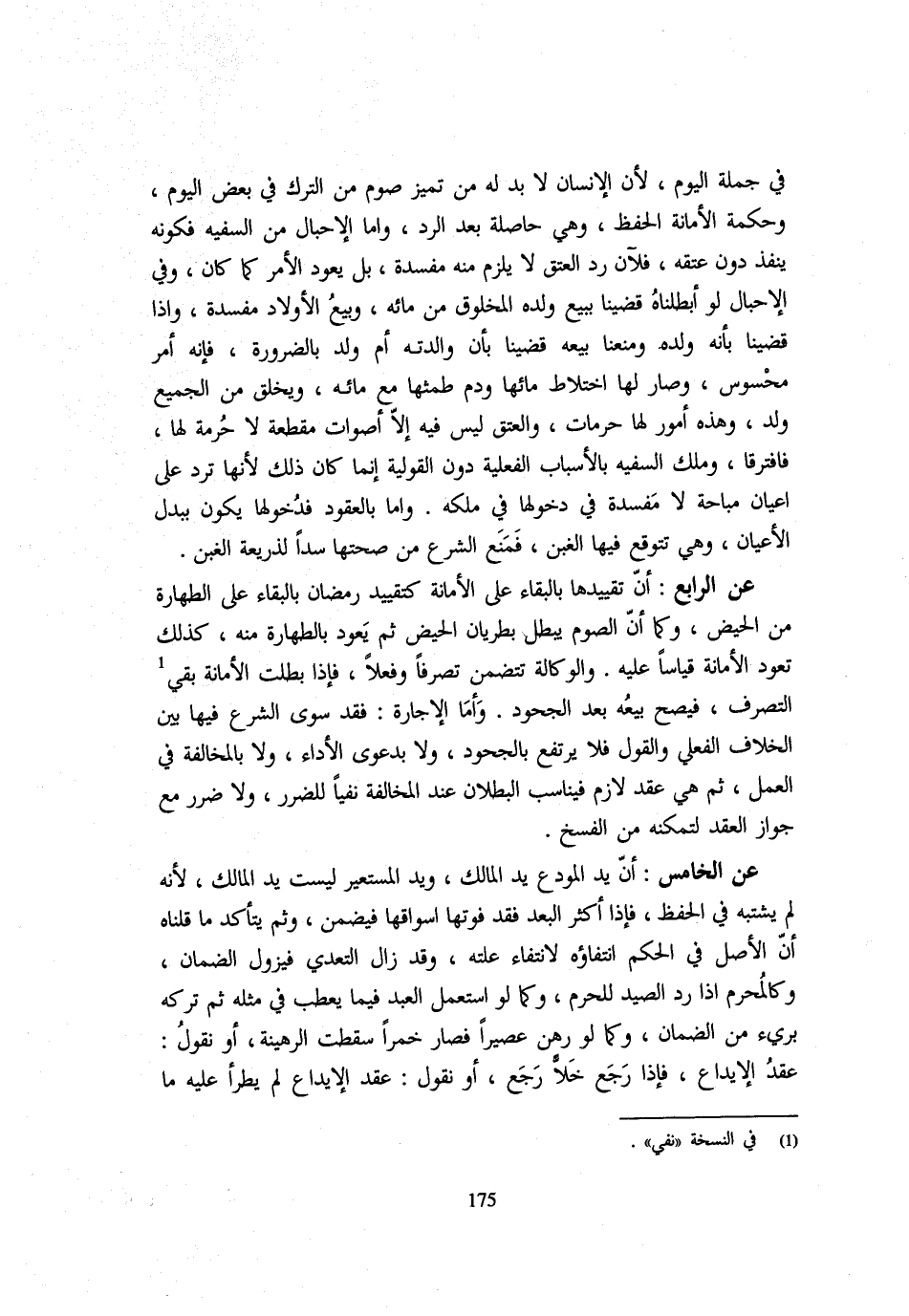 فِي جُمْلَةِ الْيَوْمِ لِأَنَّ الْإِنْسَانَ لَا بُدَّ لَهُ مِنْ تَمَيُّزِ صَوْمٍ مِنَ التَّرْكِ فِي بَعْضِ الْيَوْمِ وَحِكْمَةُ الْأَمَانَةِ الْحِفْظُ وَهِيَ حَاصِلَةٌ بَعْدَ الرَّدِّ وَأَمَّا الْإِحْبَالُ مِنَ السَّفِيهِ فَكَوْنُهُ يَنْفُذُ دُونَ عِتْقِهِ فَلِأَنَّ رَدَّ الْعِتْقِ لَا يَلْزَمُ مِنْهُ مَفْسَدَةٌ بَلْ يَعُودُ الْأَمْرُ كَمَا كَانَ وَفِي الْإِحْبَالِ لَوْ أَبْطَلْنَاهُ قَضَيْنَا بِبَيْعِ وَلَدِهِ الْمَخْلُوقِ مِنْ مَائِهِ وَبَيْعُ الْأَوْلَادِ مَفْسَدَةٌ وَإِذَا قَضَيْنَا بِأَنَّهُ وَلَدُهُ وَمَنَعْنَا بَيْعَهُ قَضَيْنَا بِأَنَّ وَالِدَتَهُ أُمُّ وَلَدٍ بِالضَّرُورَةِ فَإِنَّهُ أَمْرٌ مَحْسُوسٌ وَصَارَ لَهَا اخْتِلَاطُ مَائِهَا وَدَمِ طَمْثِهَا مَعَ مَائِهِ وَيُخْلَقُ مِنَ الْجَمِيعِ وَلَدٌ وَهَذِهِ أُمُورٌ لَهَا حُرُمَاتٌ وَالْعِتْقُ لَيْسَ فِيهِ إِلَّا أَصْوَاتٌ مُقَطَّعَةٌ لَا حُرْمَةَ لَهَا فَافْتَرَقَا وَمِلْكُ السَّفِيهِ بِالْأَسْبَابِ الْفِعْلِيَّةِ دُونَ الْقَوْلِيَّةِ إِنَّمَا كَانَ ذَلِكَ لِأَنَّهَا تُرَدُّ عَلَى أَعْيَانٍ مُبَاحَةٍ لَا مَفْسَدَةَ فِي دُخُولِهَا فِي مِلْكِهِ وَأَمَّا بِالْعُقُودِ فَدُخُولُهَا يَكُونُ بِبَدَلِ الْأَعْيَانِ وَهِيَ تَتَوَقَّعُ فِيهَا الْغَبْنَ فَمَنَعَ الشَّرْعُ مِنْ صِحَّتِهَا سَدًّا لِذَرِيعَةِ الْغَبْنِ عَنِ الرَّابِعِ أَنَّ تَقْيِيدَهَا بِالْبَقَاءِ عَلَى الْأَمَانَةِ كَتَقْيِيدِ رَمَضَانَ بِالْبَقَاءِ عَلَى الطَّهَارَةِ مِنَ الْحَيْضِ وَكَمَا أَنَّ الصَّوْمَ يَبْطُلُ بِطَرَيَانِ الْحَيْضِ ثُمَّ يَعُودُ بِالطَّهَارَةِ مِنْهُ كَذَلِكَ تَعُودُ الْأَمَانَةُ قِيَاسًا عَلَيْهِ وَالْوِكَالَةُ تَتَضَمَّنُ تَصَرُّفًا وَفِعْلًا فَإِذَا بَطَلَتِ الْأَمَانَةُ بَقِيَ التَصَرُّفُ فَيَصِحُّ بَيْعُهُ بَعْدَ الْجُحُودِ وَأَمَّا الْإِجَارَةُ فَقَدْ سَوَّى الشَّرْعُ فِيهَا بَين الْخلاف الْفعْلِيّ وَالْقَوْل فَلَا يَرْتَفِعُ بِالْجُحُودِ وَلَا بِدَعْوَى الْأَدَاءِ وَلَا بِالْمُخَالَفَةِ فِي الْعَمَلِ ثُمَّ هِيَ عَقْدٌ لَازِمٌ فَيُنَاسِبُ الْبُطْلَانَ عِنْدَ الْمُخَالَفَةِ نَفْيًا لِلضَّرَرِ وَلَا ضَرَرَ مَعَ جَوَازِ الْعَقْدِ لِتَمَكُّنِهِ مِنَ الْفَسْخِ عَنِ الْخَامِسِ أَنَّ يَدَ الْمُودَعِ يَدُ الْمَالِكِ وَيَدَ الْمُسْتَعِيرِ لَيْسَتْ يَدَ الْمَالِكِ لِأَنَّهُ لَمْ يَشْتَبِهْ فِي الْحِفْظِ فَإِذَا أَكْثَرَ الْبُعْدَ فَقَدْ فَوَّتَهَا أَسْوَاقَهَا فَيَضْمَنُ وَثَمَّ يَتَأَكَّدُ مَا قُلْنَاهُ أَنَّ الْأَصْلَ فِي الْحُكْمِ انْتِفَاؤُهُ لِانْتِفَاءِ عِلَّتِهِ وَقَدْ زَالَ التَّعَدِّي فَيَزُولُ الضَّمَانُ وَكَالْمُحْرِمِ إِذَا رَدَّ الصَّيْدَ لِلْحَرَمِ وَكَمَا لَوِ اسْتَعْمَلَ الْعَبْدَ فِيمَا يَعْطَبُ فِي مِثْلِهِ ثُمَّ تَرَكَهُ بَرِئَ مِنَ الضَّمَانِ وَكَمَا لَوْ رَهَنَ عَصِيرًا فَصَارَ خَمْرًا سَقَطَتِ الرَّهِينَةُ أَوْ نَقُولُ عَقْدُ الْإِيدَاعِ فَإِذَا رَجَعَ خَلًّا رَجَعَ أَوْ نَقُولُ عَقْدُ الْإِيدَاعِ لَمْ يَطْرَأْ عَلَيْهِ مَا