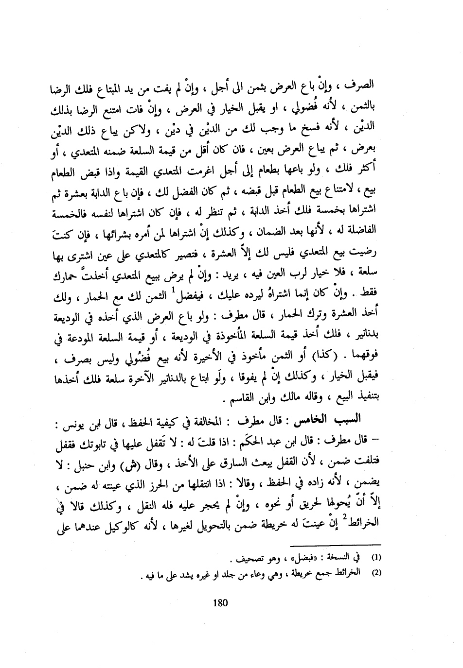 الصَّرْفِ وَإِنْ بَاعَ الْعَرْضَ بِثَمَنٍ إِلَى أَجَلٍ وَإِنْ لَمْ يَفُتْ مِنْ يَدِ الْمُبْتَاعِ فَلَكَ الرِّضَا بِالثَّمَنِ لِأَنَّهُ فُضُولِيٌّ أَوْ يَقْبَلُ الْخِيَارَ فِي الْعَرْضِ وَإِنْ فَاتَ امْتَنَعَ الرِّضَا بِذَلِكَ الدّين لِأَن فَسْخُ مَا وَجَبَ لَكَ مِنَ الدَّيْنِ فِي دين ولاكن يُبَاعُ ذَلِكَ الدَّيْنُ بِعَرْضٍ ثُمَّ يُبَاعُ الْعَرْضُ بِعَيْنٍ فَإِنْ كَانَ أَقَلَّ مِنْ قِيمَةِ السِّلْعَةِ ضَمِنَهُ الْمُتَعَدِّي أَوْ أَكْثَرَ فَلَكَ وَلَوْ بَاعَهَا بِطَعَامٍ إِلَى أَجَلٍ أَغْرَمْتَ الْمُتَعَدِّي الْقِيمَةَ وَإِذَا قَبَضَ الطَّعَامَ بِيعَ لِامْتِنَاعِ بَيْعِ الطَّعَامِ قَبْلَ قَبضه ثمَّ كَانَ الْفضل لَك فَإِن بَاعَ الدَّابَّةَ بِعَشْرَةٍ ثُمَّ اشْتَرَاهَا بِخَمْسَةٍ فَلَكَ أَخْذُ الدَّابَّةِ ثُمَّ تَنْظُرُ لَهُ فَإِنْ كَانَ اشْتَرَاهَا لِنَفْسِهِ فَالْخَمْسَةُ الْفَاضِلَةُ لَهُ لِأَنَّهَا بَعْدَ الضَّمَانِ وَكَذَلِكَ إِنِ اشْتَرَاهَا لِمَنْ أَمَرَهُ بِشِرَائِهَا فَإِنْ كُنْتَ رَضِيتَ بَيْعَ الْمُتَعَدِّي فَلَيْسَ لَكَ إِلَّا الْعَشَرَةُ فَتَصِيرُ كَالْمُتَعَدِّي عَلَى عَيْنٍ اشْتَرَى بِهَا سِلْعَةً فَلَا خِيَارَ لِرَبِّ الْعَيْنِ فِيهِ يُرِيدُ وَإِنْ لَمْ يَرْضَ بِبَيْعِ الْمُتَعَدِّي أَخَذْتَ حِمَارَكَ فَقَطْ وَإِنْ كَانَ إِنَّمَا اشْتَرَاهُ لِيَرُدَّهُ عَلَيْكَ فَيُفَضَّلُ الثَّمَنُ لَكَ مَعَ الْحِمَارِ وَلَكَ أَخْذُ الْعَشَرَةِ وَتَرْكُ الْحِمَارِ قَالَ مُطَرِّفٌ وَلَوْ بَاعَ الْعَرْضَ الَّذِي أَخَذَهُ فِي الْوَدِيعَةِ بِدَنَانِيرَ فَلَكَ أَخْذُ قِيمَةِ السِّلْعَةِ الْمَأْخُوذَةِ فِي الْوَدِيعَةِ أَو قيمَة السّلْعَة المودعة فِي فَوْقهمَا كَذَا أَوِ الثَّمَنُ مَأْخُوذٌ فِي الْأَخِيرَةِ لِأَنَّهُ بَيْعٌ فُضُولِيٌّ وَلَيْسَ بِصَرْفٍ فَيُقْبَلُ الْخِيَارُ وَكَذَلِكَ إِنْ لم يفوقا وَلَو ابْتَاعَ فِي بِالدَّنَانِيرِ الْآخِرَة سلْعَة فلك أَخذ بِتَنْفِيذِ الْبَيْعِ وَقَالَهُ مَالِكٌ وَابْنُ الْقَاسِمِ السَّبَبُ الْخَامِسُ قَالَ مُطَرِّفٌ الْمُخَالَفَةُ فِي كَيْفِيَّةِ الْحِفْظِ قَالَ ابْنُ يُونُسَ قَالَ مُطَرِّفٌ قَالَ ابْنُ عَبْدِ الْحَكَمِ إِذَا قُلْتَ لَهُ لَا تَقْفِلْ عَلَيْهَا فِي تَابُوتِكَ فَقَفَلَ فَتَلَفَتْ ضَمِنَ لِأَنَّ الْقُفْلَ يَبْعَثُ السَّارِقَ عَلَى الْأَخْذِ وَقَالَ ش وَابْنُ حَنْبَلٍ لَا يَضْمَنُ لِأَنَّهُ زَادَهُ فِي الْحِفْظِ وَقَالَا إِذَا انْتَقَلَهَا مِنَ الْحِرْزِ الَّذِي عَيَّنْتَهُ لَهُ ضَمِنَ إِلَّا أَنْ يُحَوِّلَهَا لِحَرِيقٍ أَوْ نَحْوِهِ وَإِنْ لَمْ يَحْجُرْ عَلَيْهِ فَلَهُ النَّقْلُ وَكَذَلِكَ قَالَا فِي الْخَرَائِطِ إِنْ عُيِّنَتْ لَهُ خَرِيطَةٌ ضَمِنَ بِالتَّحْوِيلِ لِغَيْرِهَا لِأَنَّهُ كَالْوَكِيلِ عِنْدهمَا على