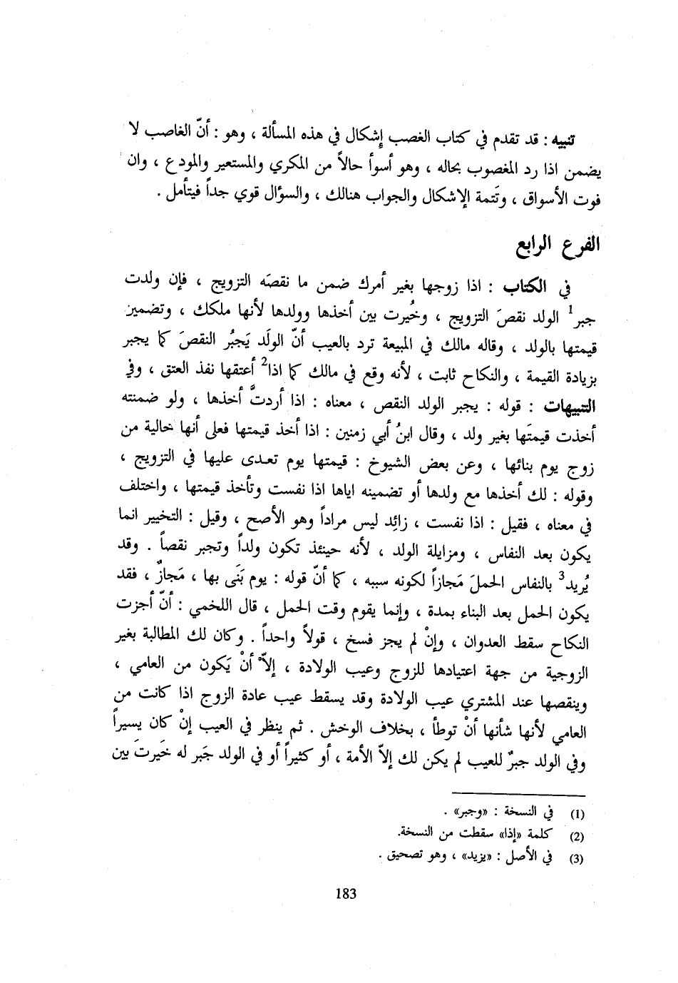 تَنْبِيهٌ قَدْ تَقَدَّمَ فِي كِتَابِ الْغَصْبِ إِشْكَالٌ فِي هَذِهِ الْمَسْأَلَةِ وَهُوَ أَنَّ الْغَاصِبَ لَا يَضْمَنُ إِذَا رَدَّ الْمَغْصُوبَ بِحَالِهِ وَهُوَ أَسْوَأُ حَالًا مِنَ الْمَكْرِي وَالْمُسْتَعِيرِ وَالْمُودِعِ وَإِنْ فَوَّتَ الْأَسْوَاقَ وَتَتِمَّةُ الْإِشْكَالِ وَالْجَوَابُ هُنَالِكَ وَالسُّؤَالُ قَوِيٌّ جدا فيتأمل الْفَرْع الرَّابِع فِي الْكتاب إِذَا زَوَّجَهَا بِغَيْرِ أَمْرِكَ ضَمِنَ مَا نَقَصَهُ التَّزْوِيجُ فَإِنْ ولدَتْ جَبَرَ الْوَلَدُ نَقْصَ التَّزْوِيجِ وخيرت بَين أَخذهَا وَوَلدهَا لِأَنَّهَا ملكت وتضمين قيمتهَا بِالْوَلَدِ وَقَالَ مَالِكٌ فِي الْمَبِيعَةِ تُرَّدُّ بِالْعَيْبِ أَنَّ الْوَلَدَ يَجْبُرُ النَّقْصَ كَمَا يَجْبُرُ بِزِيَادَةِ الْقِيمَةِ وَالنِّكَاحُ ثَابِتٌ لِأَنَّهُ وَقَعَ فِي مَالِكَ كَمَا إِذَا اعتقها نفذ الْعتْق وَفِي التبيهات قَوْلُهُ يَجْبُرُ الْوَلَدُ النَّقْصَ مَعْنَاهُ إِذَا أَرَدْتَ أَخْذَهَا وَلَوْ ضَمِنْتَهُ أَخَذْتَ قِيمَتَهَا بِغَيْرِ وَلَدٍ وَقَالَ ابْنُ أَبِي زَمِنِينَ إِذَا أَخَذَ قِيمَتَهَا فَعَلَى أَنَّهَا خَالِيَةٌ مِنْ زَوْج يَوْمِ بِنَائِهَا وَعَنْ بَعْضِ الشُّيُوخِ قِيمَتُهَا يَوْمَ تَعَدَّى عَلَيْهَا فِي التَّزْوِيجِ وَقَوْلُهُ لَكَ أَخْذُهَا مَعَ وَلَدِهَا أَوْ تَضْمِينُهُ إِيَّاهَا إِذَا نَفَسَتْ وَتَأْخُذُ قِيمَتَهَا وَاخْتُلِفَ فِي مَعْنَاهُ فَقِيلَ إِذَا نَفَسَتْ زَائِدٌ لَيْسَ مُرَادًا وَهُوَ الْأَصَحُّ وَقِيلَ التَّخْيِيرُ إِنَّمَا يَكُونُ بَعْدَ النِّفَاسِ وَمُزَايَلَةِ الْوَلَدِ لِأَنَّهُ حِينَئِذٍ تَكُونُ وَلَدًا وَتَجْبُرُ نَقْصًا وَقَدْ يُرِيدُ بِالنِّفَاسِ الْحَمْلَ مَجَازًا لِكَوْنِهِ سَبَبَهُ كَمَا أَنَّ قَوْلَهُ يَوْمَ بَنَى بِهَا مَجَازٌ فَقَدْ يَكُونُ الْحَمْلُ بَعْدَ الْبِنَاءِ بِمُدَّةٍ وَإِنَّمَا يَقُومُ وَقْتَ الْحَمْلِ قَالَ اللَّخْمِيُّ إِنْ أَجَزْتَ النِّكَاحَ سَقَطَ الْعُدْوَانُ وَإِنْ لَمْ يَجُزْ فُسِخَ قَوْلًا وَاحِدًا وَكَانَ لَكَ الْمُطَالَبَةُ بِغَيْرِ الزَّوْجِيَّةِ مِنْ جِهَةِ اعْتِيَادِهَا لِلزَّوْجِ وَعَيْبِ الْوِلَادَةِ إِلَّا أَنْ يَكُونَ مِنَ الْعَامِّيِّ وَيَنْقُصُهَا عِنْدَ الْمُشْتَرِي عَيْبُ الْوِلَادَةِ وَقَدْ يُسْقَطُ عَيْبُ عَادَةِ الزَّوْجِ إِذَا كَانَتْ مِنَ الْعَامِّيِّ لِأَنَّهَا شَأْنُهَا أَنْ تُوطَأَ بِخِلَافِ الْوَخْشِ ثُمَّ يَنْظُرُ فِي الْعَيْبِ إِنْ كَانَ يَسِيرًا وَفِي الْوَلَدِ جَبْرٌ لِلْعَيْبِ لَمْ يَكُنْ لَكَ إِلَّا الْأمة أَو كثيرا أَو فِي الْوَلَدِ جَبْرٌ لَهُ خُيِّرْتَ بَيْنَ
