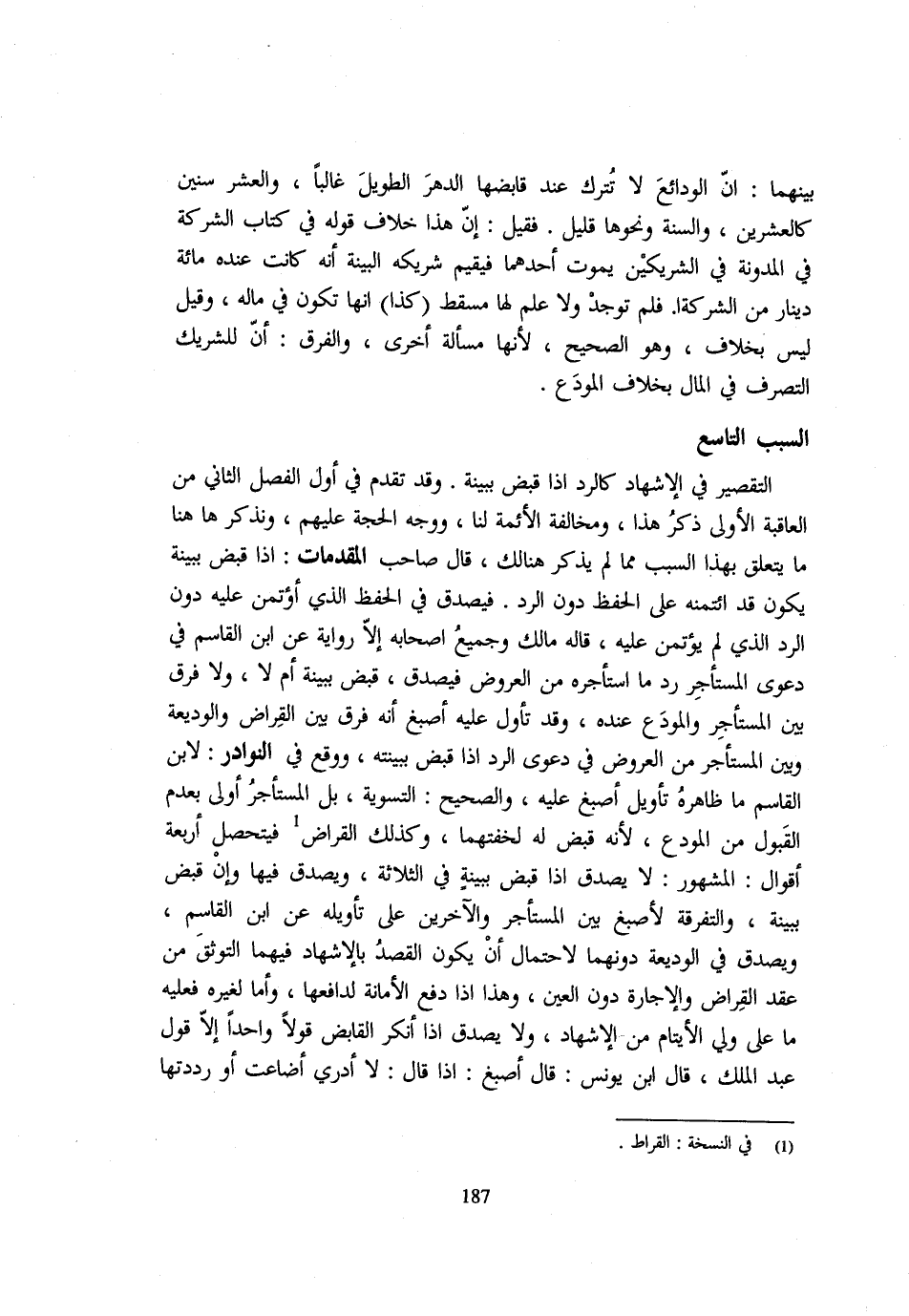 بَيْنَهُمَا أَنَّ الْوَدَائِعَ لَا تُتْرَكُ عِنْدَ قَابِضِهَا الدَّهْرَ الطَّوِيلَ غَالِبًا وَالْعَشْرُ سِنِينَ كَالْعِشْرِينَ وَالسَّنَةُ وَنَحْوَهَا قَلِيلٌ فَقِيلَ إِنَّ هَذَا خِلَافُ قَوْلِهِ فِي كِتَابِ الشَّرِكَةِ فِي الْمُدَوَّنَةِ فِي الشَّرِيكَيْنِ يَمُوتُ أَحَدُهُمَا فَيُقِيمُ شَرِيكَه الْبَيِّنَةِ أَنَّهُ كَانَ عِنْده مائَة دِينَار من الشّركَة افلم تُوجد وَلَا علم لَهَا مسْقط كَذَا إنَّهَا تَكُونُ فِي مَالِهِ وَقِيلَ لَيْسَ بِخِلَافٍ وَهُوَ الصَّحِيحُ لِأَنَّهَا مَسْأَلَةٌ أُخْرَى وَالْفَرْقُ أَنَّ لِلشَّرِيكِ التَصَرُّفَ فِي الْمَالِ بِخِلَافِ الْمُودَعِ السَّبَبُ التَّاسِعُ التَّقْصِيرُ فِي الْإِشْهَادِ كَالرَّدِّ إِذَا قَبَضَ بِبَيِّنَةٍ وَقَدْ تَقَدَّمَ فِي أَوَّلِ الْفَصْلِ الثَّانِي مِنَ الْعَاقِبَةِ الْأُولَى ذِكْرُ هَذَا وَمُخَالَفَةُ الْأَئِمَّةِ لنا وَوجه الْحجَّة عَلَيْهِم وَنَذْكُر هَا هُنَا مَا يَتَعَلَّقُ بِهَذَا السَّبَبِ مِمَّا لَمْ يُذْكَرْ هُنَالِكَ قَالَ صَاحِبُ الْمُقَدِّمَاتِ إِذَا قَبَضَ بِبَيِّنَةٍ يَكُونُ قَدْ ائْتَمَنَهُ عَلَى الْحِفْظِ دُونَ الرَّدِّ فَيصدق فِي الْحِفْظ الَّذِي أوئتمن عَلَيْهِ دُونَ الرَّدِّ الَّذِي لَمْ يُؤْتَمَنْ عَلَيْهِ قَالَهُ مَالِكٌ وَجَمِيعُ أَصْحَابِهِ إِلَّا رِوَايَةً عَنِ ابْنِ الْقَاسِمِ فِي دَعْوَى الْمُسْتَأْجِرِ رَدَّ مَا اسْتَأْجَرَهُ مِنَ الْعُرُوضِ فَيُصَدَّقُ قَبَضَ بِبَيِّنَةٍ أَمْ لَا وَلَا فَرْقَ بَيْنَ الْمُسْتَأْجِرِ وَالْمُودِعِ عِنْدَهُ وَقَدْ تَأَوَّلَ عَلَيْهِ أَصْبَغُ أَنَّهُ فَرَّقَ بَيْنَ الْقِرَاضِ وَالْوَدِيعَةِ وَبَيْنَ الْمُسْتَأْجِرِ مِنَ الْعُرُوضِ فِي دَعْوَى الرَّدِّ إِذَا قَبَضَ بِبَيِّنَتِهِ وَوَقَعَ فِي النَّوَادِرِ لِابْنِ الْقَاسِمِ مَا ظَاهِرُهُ تَأْوِيلُ أَصْبَغَ عَلَيْهِ وَالصَّحِيحُ التَّسْوِيَةُ بَلِ الْمُسْتَأْجِرُ أَوْلَى بِعَدَمِ الْقَبُولِ مِنَ الْمُودِعِ لِأَنَّهُ قَبَضَ لَهُ لِخِفَّتِهِمَا وَكَذَلِكَ الْقِرَاضُ فَيَتَحَصَّلُ أَرْبَعَةُ أَقْوَالٍ الْمَشْهُورُ لَا يُصَدَّقُ إِذَا قَبَضَ بِبَيِّنَةٍ فِي الثَّلَاثَةِ وَيُصَدَّقُ فِيهَا وَإِنْ قَبَضَ بِبَيِّنَةٍ وَالتَّفْرِقَةُ لِأَصْبَغَ بَيْنَ الْمُسْتَأْجِرِ وَالْآخَرِينَ عَلَى تَأْوِيلِهِ عَنِ ابْنِ الْقَاسِمِ وَيُصَدَّقُ فِي الْوَدِيعَةِ دُونَهُمَا لِاحْتِمَالِ أَنْ يَكُونَ الْقَصْدُ بِالْإِشْهَادِ فِيهِمَا التَّوَثُّقَ مِنْ عَقْدِ الْقِرَاضِ وَالْإِجَارَةِ دُونَ الْعَيْنِ وَهَذَا إِذَا دَفَعَ الْأَمَانَةَ لِدَافِعِهَا وَأَمَّا لِغَيْرِهِ فَعَلَيْهِ مَا عَلَى وَلِيِّ الْأَيْتَامِ مِنَ الْإِشْهَادِ وَلَا يُصَدَّقُ إِذَا أَنْكَرَ الْقَابِضُ قَوْلًا وَاحِدًا إِلَّا قَوْل عَبْدِ الْمَلِكِ قَالَ ابْنُ يُونُسَ قَالَ أَصْبَغُ إِذَا قَالَ لَا أَدْرِي أَضَاعَتْ أَوْ رَدَّدْتُهَا
