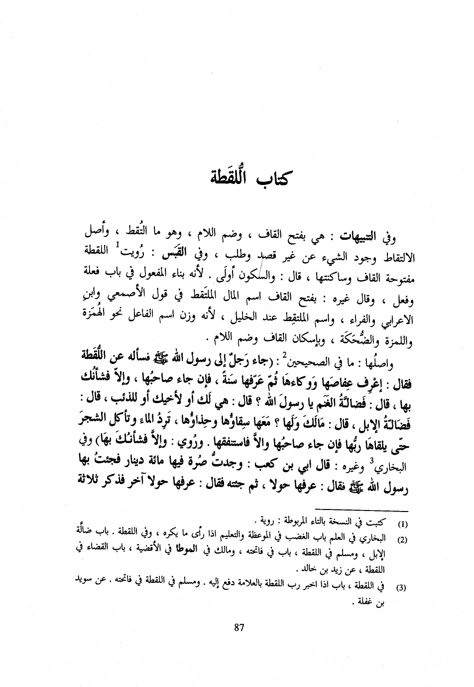 وَفِي التَّنْبِيهَاتِ هِيَ بِفَتْحِ الْقَافِ وَضَمِّ اللَّامِ وَهُوَ مَا الْتُقِطَ وَأَصْلُ الِالْتِقَاطِ وُجُودُ الشَّيْءِ عَنْ غَيْرِ قَصْدٍ وَطَلَبٍ وَفِي الْقَبَسِ رُوِيَتِ اللُّقَطَةُ مَفْتُوحَةَ الْقَافِ وَسَاكِنَتَهَا قَالَ وَسُكُون أَوْلَى لِأَنَّهُ بِنَاءُ الْمَفْعُولِ فِي بَابِ فُعْلَةٍ وَفُعْلٍ وَقَالَ غَيْرُهُ بِفَتْحِ الْقَافِ اسْمُ الْمَالِ الْمُلْتَقَطِ فِي قَوْلِ الْأَصْمَعِيِّ وَابْنِ الْأَعْرَابِيِّ وَالْفَرَّاءِ وَاسْمُ الْمُلْتَقَطِ عِنْدَ الْخَلِيلِ لِأَنَّهُ وَزْنُ اسْمِ الْفَاعِلِ نَحْوَ الْهُمَزَةِ وَاللُّمَزَةِ وَالضُّحَكَةِ وَبِإِسْكَانِ الْقَافِ وَضَمِّ اللَّامِ وَأَصْلُهَا مَا فِي الصَّحِيحَيْنِ جَاءَ رَجُلٌ إِلَى رَسُولِ اللَّهِ - صَلَّى اللَّهُ عَلَيْهِ وَسَلَّم َ - فَسَأَلَهُ عَنِ اللُّقَطَةِ فَقَالَ اعْرِفْ عِفَاصَهَا وَوِكَاءَهَا ثُمَّ عَرِّفْهَا سَنَةً فَإِنْ جَاءَ صَاحِبُهَا وَإِلَّا فَشَأْنُكَ بِهَا قَالَ فَضَالَّةُ الْغَنَمِ يَا رَسُولَ اللَّهِ قَالَ هِيَ لَكَ أَوْ لِأَخِيكَ أَوْ للذئب قَالَ فضَالة الْإِبِل قَالَ مَالك وَلَهَا مَعَهَا سِقَاؤُهَا وَحِذَاؤُهَا تَرِدُ الْمَاءَ وَتَأْكُلُ الشَّجَرَ حَتَّى يَلْقَاهَا رَبُّهَا فَإِنْ جَاءَ صَاحِبُهَا وَإِلَّا فَاسْتَنْفِقَهَا وَرُوِيَ وَإِلَّا فَشَأْنُكَ بِهَا وَفِي الْبُخَارِيِّ وَغَيْرِهِ قَالَ أُبَيُّ بْنُ كَعْبٍ وَجَدْتُ صُرَّةً فِيهَا مِائَةُ دِينَارٍ فَجِئْتُ بِهَا رَسُولَ الله - صَلَّى اللَّهُ عَلَيْهِ وَسَلَّم َ - فَقَالَ عَرِّفْهَا حَوْلًا ثُمَّ جِئْتُهُ فَقَالَ عَرِّفْهَا حَوْلًا آخَرَ فَذَكَرَ ثَلَاثَةَ