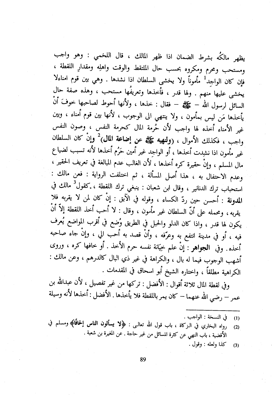 يَظْهَرْ مَالِكُهُ بِشَرْطِ الضَّمَانِ إِذَا ظَهَرَ الْمَالِكُ قَالَ اللَّخْمِيّ وَهُوَ وَاجِب ومستجبومحرم وَمَكْرُوهٌ بِحَسَبِ حَالِ الْمُلْتَقَطِ وَالْوَقْتِ وَأَهْلِهِ وَمِقْدَارِ اللُّقَطَةِ فَإِنْ كَانَ الْوَاجِدُ مَأْمُونًا وَلَا يَخْشَى السُّلْطَانَ إِذَا نَشَدَهَا وَهِيَ بَيْنَ قَوْمٍ أُمَنَاءٍ لَا يخْشَى عَلَيْهِم مِنْهُمْ وَلَهَا قَدْرٌ فَأَخْذُهَا وَتَعْرِيفُهَا مُسْتَحَبٌّ وَهَذَا صِفَةُ حَالِ السَّائِلِ لِرَسُولِ اللَّهِ - صَلَّى اللَّهُ عَلَيْهِ وَسَلَّم َ - فَقَالَ خُذْهَا وَلِأَنَّهَا أحوط لصَاحِبهَا خوفًا أَنْ يَأْخُذَهَا مَنْ لَيْسَ بِمَأْمُونٍ وَلَا يَنْتَهِي إِلَى الْوُجُوبِ لِأَنَّهَا بَيْنَ قَوْمٍ أُمَنَاءٍ وَبَيْنَ غَيْرِ الْأُمَنَاءِ أَخَذُهُ لَهَا وَاجِبٌ لِأَنَّ حُرْمَةَ الْمَالِ كَحُرْمَةِ النَّفْسِ وَصَوْنُ النَّفْسِ وَاجِبٌ فَكَذَلِكَ الْأَمْوَال ولنهيه - صَلَّى اللَّهُ عَلَيْهِ وَسَلَّم َ - عَنْ إِضَاعَةِ الْمَالِ وَإِنْ كَانَ السُّلْطَانُ غَيْرَ مَأْمُونٍ إِذَا نُشِدَتْ أَخَذَهَا أَوِ الْوَاجِدُ غَيْرُ أَمِينٍ حَرُمَ أَخْذُهَا لِأَنَّهُ تَسَبُّبٌ لِضَيَاعِ مَالِ الْمُسلم وَإِن حَقِيرَةً كُرِهَ أَخْذُهَا لِأَنَّ الْغَالِبَ عَدَمُ الْمُبَالَغَةِ فِي تَعْرِيفِ الْحَقِيرِ وَعَدَمِ الِاحْتِفَالِ بِهِ هَذَا أَصْلُ الْمَسْأَلَةِ ثُمَّ اخْتَلَفَتِ الرِّوَايَةُ فَعَنْ مَالِكٍ اسْتِحْبَابُ تَرْكِ الدَّنَانِيرِ وَقَالَ ابْنُ شَعْبَانَ يَنْبَغِي تَرْكُ اللُّقَطَةِ كَقَوْلِ مَالِكٍ فِي الْمُدَوَّنَةِ أَحْسَنَ حِينَ رَدَّ الْكِسَاءَ وَقَوْلِهِ فِي الْآبِقِ إِنْ كَانَ لِمَنْ لَا يَقْرُبُهُ فَلَا يَقْرُبُهُ وَمَحْمَلُهُ عَلَى أَنَّ السُّلْطَانَ غَيْرُ مَأْمُونٍ وَقَالَ لَا أُحِبُّ أَخْذَ اللُّقَطَةِ إِلَّا أَنْ يَكُونَ لَهَا قَدْرٌ وَإِذَا كَانَ الدَّلْوُ وَالْحَبْلُ فِي الطَّرِيقِ وُضِعَ فِي أَقْرَبِ الْمَوَاضِعِ يُعْرَفُ فِيهِ أَوْ فِي مَدِينَةٍ انْتَفَعَ بِهِ وَعَرَّفَهُ وَإِنْ قَصَدَ بِهِ أَحَبُّ إِلَيَّ وَإِنْ جَاءَ صَاحِبُهُ أَخَذَهُ وَفِي الْجَوَاهِرِ إِنْ عَلِمَ خِيَانَةَ نَفْسِهِ حَرُمَ الْأَخْذ أَو خافها كره وروى أَشهب الْوُجُوه فِيهَا لَهُ بَالٌ وَالْكَرَاهَةَ فِي غَيْرِ ذِي الْبَالِ كَالدِّرْهَمِ وَعَنْ مَالِكٍ الْكَرَاهِيَّةُ مُطْلَقًا وَاخْتَارَهُ الشَّيْخُ أَبُو إِسْحَاقَ فِي الْمُقَدِّمَاتِ وَفِي لُقَطَةِ الْمَالِ ثَلَاثَةُ أَقْوَالٍ الْأَفْضَلُ تَرْكُهَا مِنْ غَيْرِ تَفْصِيلٍ لِأَنَّ عَبْدَ اللَّهِ بْنَ عُمَرَ رَضِيَ اللَّهُ عَنْهُمَا كَانَ يَمُرُّ بِاللُّقَطَةِ فَلَا يَأْخُذُهَا الْأَفْضَلُ أَخذهَا لِأَنَّهَا وَسِيلَة