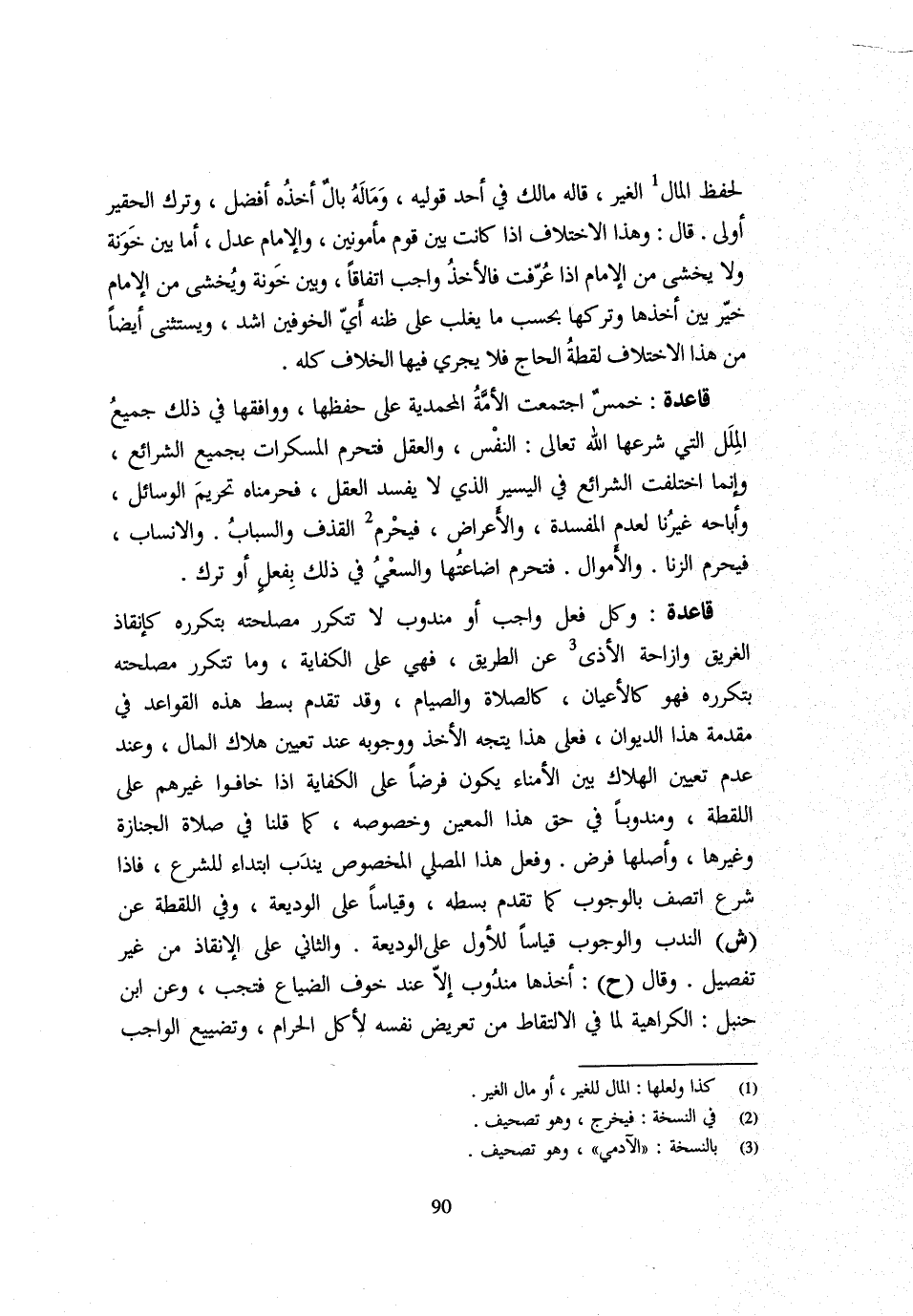 لحفظ المَال الْغَيْر قَالَه مَالك فِي أحد قوليه وَمَاله بَالٌ أَخْذُهُ أَفْضَلُ وَتَرْكُ الْحَقِيرِ أَوْلَى قَالَ وَهَذَا الِاخْتِلَافُ إِذَا كَانَتْ بَيْنَ قَوْمٍ مَأْمُونِينَ وَالْإِمَامُ عَدْلٌ أَمَّا بَيْنَ خَوَنَةٍ وَلَا يُخْشَى مِنَ الْإِمَامِ إِذَا عُرِّفَتْ فَالْأَخْذُ وَاجِبٌ اتِّفَاقًا وَبَيْنَ خَوَنَةٍ وَيُخْشَى مِنَ الْإِمَامِ خُيِّرَ بَيْنَ أَخْذِهَا وَتَرْكِهَا بِحَسْبَ مَا يَغْلِبُ عَلَى ظَنِّهِ أَيُّ الْخَوْفَيْنِ أَشَدُّ وَيُسْتَثْنَى أَيْضًا مِنْ هَذَا الِاخْتِلَافِ لُقَطَةُ الْحَاجِّ فَلَا يَجْرِي فِيهَا الْخِلَافُ كُلُّهُ قَاعِدَةٌ خَمْسٌ اجْتَمَعَتِ الْأُمَّةُ الْمُحَمَّدِيَّةُ عَلَى حِفْظِهَا وَوَافَقَهَا فِي ذَلِكَ جَمِيعُ الْمِلَلِ الَّتِي شَرَعَهَا اللَّهُ تَعَالَى النَّفْسُ وَالْعَقْلُ فَتَحْرُمُ الْمُسْكِرَاتُ بِجَمِيعِ الشَّرَائِعِ وَإِنَّمَا اخْتَلَفَتِ الشَّرَائِعُ فِي الْيَسِيرِ الَّذِي لَا يُفْسِدُ الْعَقْلَ فَحَرَّمْنَاهُ تَحْرِيمَ الْوَسَائِلِ وأباحة غَيرنَا لعدم الْمفْسدَة والأغراض فَيَحْرُمُ الْقَذْفُ وَالسِّبَابُ وَالْأَنْسَابُ فَيَحْرُمُ الزِّنَا وَالْأَمْوَالُ فَتَحْرُمُ إِضَاعَتُهَا وَالسَّعْيُ فِي ذَلِكَ بِفِعْلٍ أَوْ تَرْكٍ قَاعِدَةٌ وَكُلُّ فِعْلٍ وَاجِبٍ أَوْ مَنْدُوبٍ لَا تَتَكَرَّرُ مَصْلَحَتُهُ بِتَكَرُّرِهِ كَإِنْقَاذِ الْغَرِيقِ وَإِزَاحَةِ الْأَذَى عَن الطَّرِيق فَهِيَ عَلَى الْكِفَايَةِ وَمَا تَتَكَرَّرُ مَصْلَحَتُهُ بِتَكَرُّرِهِ فَهُوَ كَالْأَعْيَانِ كَالصَّلَاةِ وَالصِّيَامِ وَقَدْ تَقَدَّمَ بَسْطُ هَذِهِ الْقَوَاعِدِ فِي مُقَدِّمَةِ هَذَا الدِّيوَانِ فَعَلَى هَذَا يَتَّجِهُ الْأَخْذُ وَوُجُوبُهُ عِنْدَ تَعْيِينِ هَلَاكِ الْمَالِ وَعِنْدَ عَدَمِ تَعْيِينِ الْهَلَاكِ بَيْنَ الْأُمَنَاءِ يَكُونُ فَرْضًا عَلَى الْكِفَايَةِ إِذَا خَافُوا غَيْرَهُمْ عَلَى اللُّقَطَةِ وَمَنْدُوبًا فِي حَقِّ هَذَا الْمُعَيَّنِ وَخُصُوصِهِ كَمَا قُلْنَا فِي صَلَاةِ الْجَنَازَةِ وَغَيْرِهَا وَأَصْلُهَا فَرْضٌ وَفِعْلُ هَذَا الْمُصَلِّي الْمَخْصُوصُ يُنْدَبُ ابْتِدَاءً لِلشَّرْعِ فَإِذَا شَرَعَ اتَّصَفَ بِالْوُجُوبِ كَمَا تَقَدَّمَ بَسْطُهُ وَقِيَاسًا عَلَى الْوَدِيعَةِ وَفِي اللُّقَطَةِ عَنْ ش النَّدْبُ وَالْوُجُوبُ قِيَاسًا لِلْأَوَّلِ عَلَى الْوَدِيعَةِ وَالثَّانِي عَلَى الْإِنْقَاذِ مِنْ غَيْرِ تَفْصِيلٍ وَقَالَ ح أَخْذُهَا مَنْدُوبٌ إِلَّا عِنْدَ خَوْفِ الضَّيَاعِ فَتَجِبُ وَعَنِ ابْنِ حَنْبَلٍ الْكَرَاهِيَّةُ لِمَا فِي الِالْتِقَاطِ مِنْ تَعْرِيضِ نَفْسِهِ لِأَكْلِ الْحَرَامِ وَتَضْيِيعِ الْوَاجِب