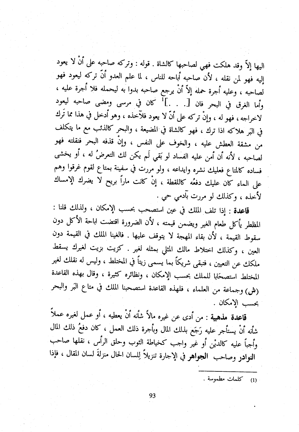 إِلَيْهَا إِلَّا وَقَدْ هَلَكَتْ فَهِيَ لِصَاحِبِهَا كَالشَّاةِ قَوْله وَتَركه صَاحبه على أَن لَا يَعُودَ إِلَيْهِ فَهُوَ لِمَنْ نَقَلَهُ لِأَنَّ صَاحِبَهُ أَبَاحَهُ لِلنَّاسِ لِمَا عَلِمَ الْعَدُوُّ أَنَّ تَرْكَهُ لِيَعُودَ فَهُوَ لِصَاحِبِهِ وَعَلَيْهِ أُجْرَةُ حَمْلِهِ إِلَّا أَنْ يَرْجِعَ صَاحِبُهُ بَدْوًا بِهِ لِيَحْمِلَهُ فَلَا أُجْرَةَ عَلَيْهِ وَأَمَّا الْغَرَقُ فِي الْبَحْرِ فَإِنَّ كَانَ فِي مَرْسَى وَمَضَى صَاحِبُهُ لِيَعُودَ لِإِخْرَاجِهِ فَهُوَ لَهُ وَإِن تَركه على أَن لَا يَعُودَ فَلِآخِذِهِ وَهُوَ أَدْخُلُ فِي هَذَا مِمَّا تَرَكَ فِي الْبَرِّ هَلَاكَهُ إِذَا تَرَكَ فَهُوَ كَالشَّاةِ فِي الْمَضْيَعَةِ وَالْبَحْرُ كَالذِّئْبِ مَعَ مَا يَتَكَلَّفُ مِنْ مَشَقَّةِ الْعَطَشِ عَلَيْهِ وَالْخَوْفُ عَلَى النَّفْسِ وَإِنْ قَذَفَهُ الْبَحْرُ فَنَقَلْتَهُ فَهُوَ لِصَاحِبِهِ لِأَنَّهُ إِنْ أَمِنَ عَلَيْهِ الْفَسَادَ لَوْ بَقِيَ لَمْ يَكُنْ لَكَ التَّعَرُّضُ لَهُ أَوْ يُخْشَى فَسَادُهُ كَالْمَتَاعِ فَعَلَيْكَ نَشْرُهُ وَإِيدَاعُهُ وَلَوْ مَرَرْتَ فِي سَفِينَةٍ بِمَتَاعٍ لِقَوْمٍ غَرِقُوا وَهُمْ عَلَى المَاء كَانَ عَلَيْك دَفعه كاللقطة إِن كَانَت مارا بِرِبْح لَا يَضُرُّكَ الْإِمْسَاكُ لِأَخْذِهِ وَكَذَلِكَ لَوْ مَرَرْتَ بِآدَمِيٍّ حَيٍّ قَاعِدَةٌ إِذَا تَلِفَ الْمِلْكُ فِي عين استصحب بِحَسب الْإِمْكَان وَلذَلِك قُلْنَا المظطر يَأْكُلُ طَعَامَ الْغَيْرِ وَيَضْمَنُ قِيمَتَهُ لِأَنَّ الضَّرُورَةَ اقْتَضَتْ إِبَاحَةُ الْأَكْلِ دُونَ سُقُوطِ الْقِيمَةِ لِأَنَّ بَقَاءَ الْمُهْجَةِ لَا يَتَوَقَّفُ عَلَيْهَا فَأَلْغَيْنَا الْمِلْكَ فِي الْقِيمَةِ دُونَ الْعَيْنِ وَكَذَلِكَ اخْتِلَاطُ مَالِكَ الْمثْلِيّ بِمثلِهِ لغير كَزَيْتٍ بِزَيْتٍ لِغَيْرِكَ يُسْقَطُ مِلْكُكَ عَنِ التَّعْيِينِ فَتَبْقَى شَرِيكًا بِمَا يُسَمَّى زَيْتًا فِي الْمُخْتَلَطِ وَلَيْسَ لَهُ نَقْلُكَ لِغَيْرِ الْمُخْتَلَطِ اسْتِصْحَابًا لِلْمِلْكِ بِحَسْبِ الْإِمْكَانِ وَنَظَائِرُهُ كَثِيرَةٌ وَقَالَ بِهَذِهِ الْقَاعِدَةِ ش وَجَمَاعَةٌ مِنَ الْعُلَمَاءِ فَلِهَذِهِ الْقَاعِدَةِ اسْتَصْحَبْنَا الْمِلْكَ فِي مَتَاعِ الْبَرِّ وَالْبَحْرِ بِحَسْبِ الْإِمْكَانِ قَاعِدَةٌ مَذْهَبِيَّةٌ مَنْ أَدَّى عَنْ غَيْرِهِ مَالًا شَأْنُهُ أَنْ يُعْطِيَهُ أَوْ عَمِلَ لِغَيْرِهِ عَمَلًا شَأْنُهُ أَنْ يُسْتَأْجَرَ عَلَيْهِ رَجَعَ بِذَلِكَ الْمَالِ وَبِأُجْرَةِ ذَلِكَ الْعَمَلِ كَانَ دَفْعُ ذَلِكَ الْمَالِ وَاجِبًا عَلَيْهِ كَالدَّيْنِ أَوْ غَيْرَ وَاجِبٍ كَخِيَاطَةِ الثَّوْبِ وَحَلْقِ الرَّأْسِ نَقَلَهَا صَاحِبُ النَّوَادِرِ وَصَاحِبُ الْجَوَاهِر فِي الْإِجَازَة تَنْزِيلًا لِلِسَانِ الْحَالِ مَنْزِلَةَ لِسَانِ الْمَقَالِ فَإِذَا