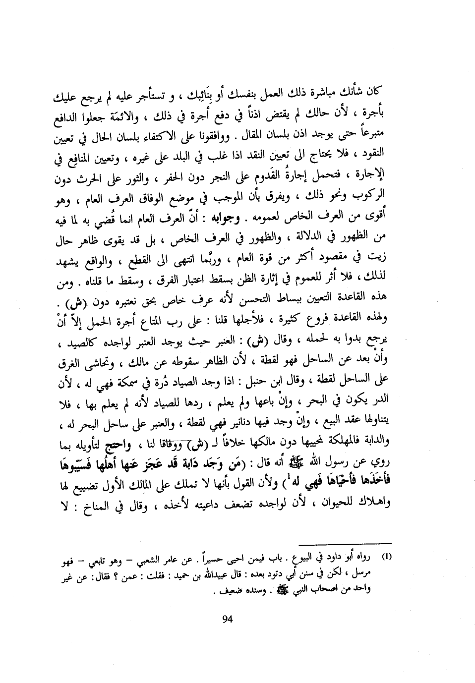 كَانَ شَأْنُكَ مُبَاشَرَةَ ذَلِكَ الْعَمَلِ بِنَفْسِكَ أَوْ بنائبك وتستأجر عَلَيْهِ لَمْ يَرْجِعْ عَلَيْكَ بِأُجْرَةٍ لِأَنَّ حَالَكَ لَمْ يَقْتَضِ إِذْنًا فِي دَفْعِ أُجْرَةٍ فِي ذَلِكَ وَالْأَئِمَّةُ جَعَلُوا الدَّافِعَ مُتَبَرِّعًا حَتَّى يُوجَدَ إِذْنٌ بِلِسَانِ الْمَقَالِ وَوَافَقُونَا عَلَى الِاكْتِفَاءِ بِلِسَانِ الْحَالِ فِي تَعْيِينِ النُّقُودِ فَلَا يَحْتَاجُ إِلَى تَعْيِينِ النَّقْدِ إِذَا غَلَبَ فِي الْبَلَدِ عَلَى غَيْرِهِ وَتَعْيِينِ الْمَنَافِعِ فِي الْإِجَارَةِ فَتُحْمَلُ إِجَارَةُ الْقُدُومِ عَلَى النَّجْرِ دُونَ الْحَفْرِ وَالثَّوْرِ عَلَى الْحَرْثِ دُونَ الرُّكُوبِ وَنَحْوِ ذَلِكَ وَيُفَرِّقُ بِأَنَّ الْمُوجِبَ فِي مَوْضِعِ الْوِفَاقِ الْعُرْفُ الْعَامُّ وَهُوَ أَقْوَى مِنَ الْعُرْفِ الْخَاصِّ لِعُمُومِهِ وَجَوَابُهُ أَنَّ الْعُرْفَ الْعَامَّ إِنَّمَا قُضِيَ بِهِ لِمَا فِيهِ مِنَ الظُّهُورِ فِي الدَّلَالَةِ وَالظُّهُورِ فِي الْعُرْفِ الْخَاصِّ بَلْ قَدْ يَقْوَى ظَاهِرُ حَالِ زَيْتٍ فِي مَقْصُودٍ أَكْثَرَ مِنْ قُوَّةِ الْعَامِ وَرُبَّمَا انْتَهَى إِلَى الْقَطْعِ وَالْوَاقِعُ يَشْهَدُ لِذَلِكَ فَلَا أَثَرَ لِلْعُمُومِ فِي إِثَارَةِ الظَّنِّ بِسَقْطِ اعْتِبَارِ الْفَرْقِ وَسَقْطِ مَا قُلْنَاهُ وَمِنْ هَذِهِ الْقَاعِدَةِ التَّعْيِينُ بِبِسَاطِ التَّحَسُّنِ لِأَنَّهُ عُرْفٌ خَاصٌّ بِحَقٍّ نَعْتَبِرُهُ دُونَ ش وَلِهَذِهِ الْقَاعِدَةِ فُرُوعٌ كَثِيرَةٌ فَلِأَجْلِهَا قُلْنَا عَلَى رَبِّ الْمَتَاعِ أُجْرَةُ الْحَمْلِ إِلَّا أَن يرجع بدوا بِهِ لِحَمْلِهِ وَقَالَ ش الْعَنْبَرُ حَيْثُ يُوجَدُ الْعَنْبَرُ لِوَاجِدِهِ كَالصَّيْدِ وَإِنْ بَعُدَ عَنِ السَّاحِلِ فَهُوَ لُقَطَةٌ لِأَنَّ الظَّاهِرَ سُقُوطُهُ عَنْ مَالِكٍ وَتَحَاشِي الْغَرَقِ عَلَى السَّاحِلِ لُقَطَةٌ وَقَالَ ابْنُ حَنْبَلٍ إِذَا وَجَدَ الصَّيَّادُ دُرَّةً فِي سَمَكَةٍ فَهِيَ لَهُ لِأَنَّ الدُّرَّ يَكُونُ فِي الْبَحْرِ وَإِنْ بَاعَهَا وَلَمْ يَعْلَمْ رَدَّهَا لِلصَّيَّادِ لِأَنَّهُ لَمْ يَعْلَمْ بِهَا فَلَا يَتَنَاوَلُهَا عَقْدُ الْبَيْعِ وَإِنْ وُجِدَ فِيهَا دَنَانِيرُ فَهِيَ لُقَطَةٌ وَالْعَنْبَرُ على سَاحل الْبَحْر لَهُ وَالدَّابَّة فالمهلكة لِمُحْيِيهَا دُونَ مَالِكِهَا خِلَافًا لِ ش وَوِفَاقًا لَنَا وَاحْتَجَّ لِتَأْوِيلِهِ بِمَا رُوِيَ عَنْ رَسُولِ اللَّهِ - صَلَّى اللَّهُ عَلَيْهِ وَسَلَّم َ - أَنَّهُ قَالَ