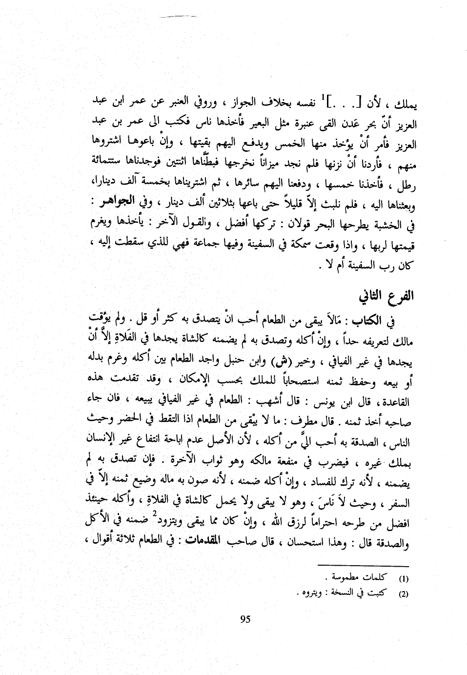 يملك لِأَن نَفسه بِخِلَاف الْجَوَاز وروفي العنبر عَن عمر ابْن عَبْدِ الْعَزِيزِ أَنَّ بَحْرَ عَدَنٍ أَلْقَى عَنْبَرَةً مِثْلَ الْبَعِيرِ فَأَخَذَهَا نَاسٌ فَكُتِبَ إِلَى عُمَرَ بْنِ عَبْدِ الْعَزِيزِ فَأَمَرَ أَنْ يُؤْخَذَ مِنْهَا الْخمس وَيدْفَع إِلَيْهِم بِقِيمَتِهَا وَإِنْ بَاعُوهَا اشْتَرَوْهَا مِنْهُمْ فَأَرَدْنَا أَنْ نَزِنَهَا فَلم نجد ميزانا نخرجها فبطناها اثْنَتَيْنِ فَوَجَدْنَاهَا ستتمائة رَطْلٍ فَأَخَذْنَا خُمُسَهَا وَدَفَعْنَا إِلَيْهِمْ سَائِرَهَا ثُمَّ اشتريناها بِخَمْسَة آلف دِينَارا وَبَعَثْنَاهَا إِلَيْهِ فَلَمْ نَلْبَثْ إِلَّا قَلِيلًا حَتَّى بَاعَهَا بِثَلَاثِينَ أَلْفِ دِينَارٍ وَفِي الْجَوَاهِرِ فِي الْخَشَبَةِ يَطْرَحُهَا الْبَحْرُ قَوْلَانِ تَرْكُهَا أَفْضَلُ وَالْقَوْلُ الْآخَرُ يَأْخُذُهَا وَيَغْرَمُ قِيمَتَهَا لِرَبِّهَا وَإِذَا وَقَعَتْ سَمَكَةٌ فِي السَّفِينَةِ وَفِيهَا جَمَاعَةٌ فَهِيَ لِلَّذِي سَقَطَتْ إِلَيْهِ كَانَ رَبَّ السَّفِينَةِ أَمْ لَا الْفَرْع الثَّانِي فِي الْكتاب مَالا يَبْقَى مِنَ الطَّعَامِ أُحِبُّ أَنْ يُتَصَدَّقَ بِهِ كَثُرَ أَوْ قَلَّ وَلَمْ يُؤَقِّتْ مَالِكٌ لِتَعْرِيفِهِ حَدًا وَإِنْ أَكَلَهُ وَتَصَدَّقَ بِهِ لَمْ يُضَمَّنْهُ كالشاة يجدهَا فِي الفلاة إِلَّا أَن بجدها فِي غَيْرِ الْفَيَافِي وَخَيَّرَ ش وَابْنُ حَنْبَلٍ وَاجِدَ الطَّعَامِ بَيْنَ أَكْلِهِ وَغُرْمِ بَدَلِهِ أَوْ بَيْعِهِ وَحِفْظِ ثَمَنِهِ اسْتِصْحَابًا لِلْمِلْكِ بِحَسْبِ الْإِمْكَانِ وَقَدْ تَقَدَّمَتْ هَذِهِ الْقَاعِدَةُ قَالَ ابْنُ يُونُسَ قَالَ أَشْهَبُ الطَّعَامُ فِي غَيْرِ الْفَيَافِي يَبِيعُهُ فَإِنْ جَاءَ صَاحِبُهُ أَخَذَ ثَمَنَهُ قَالَ مُطَرِّفٌ مَا لَا يَبْقَى مِنَ الطَّعَامِ إِذَا الْتُقِطَ فِي الْحَضَرِ وَحَيْثُ النَّاسُ الصَّدَقَةُ بِهِ أَحَبُّ إِلَيَّ مِنْ أَكْلِهِ لِأَنَّ الْأَصْلَ عَدَمُ إِبَاحَةِ انْتِفَاعِ غَيْرِ الْإِنْسَانِ بِمِلْكِ غَيْرِهِ فَيُضْرَبُ فِي مَنْفَعَةِ مَالِكِهِ وَهُوَ ثَوَابُ الْآخِرَةِ فَإِنْ تَصَدَّقَ بِهِ لَمْ يَضْمَنْهُ لِأَنَّهُ تُرِكَ لِلْفَسَادِ وَإِنْ أكله ضمنه لِأَنَّهُ صون بِهِ مَالهُ وَضِيعَ ثَمَنُهُ إِلَّا فِي السَّفَرِ وَحَيْثُ لَا نَاسَ وَهُوَ لَا يَبْقَى وَلَا يُحْمَلُ كَالشَّاةِ فِي الْفَلَاةِ وَأَكْلُهُ حِينَئِذٍ أَفْضَلُ مِنْ طَرْحِهِ احْتِرَامًا لِرِزْقِ اللَّهِ وَإِنْ كَانَ مِمَّا يَبْقَى وَيَتَزَوَّدُ ضَمِنَهُ فِي الْأَكْلِ وَالصَّدَقَةِ قَالَ وَهَذَا اسْتِحْسَانٌ قَالَ صَاحِبُ الْمُقَدِّمَاتِ فِي الطَّعَامِ ثَلَاثَةُ أَقْوَالٍ
