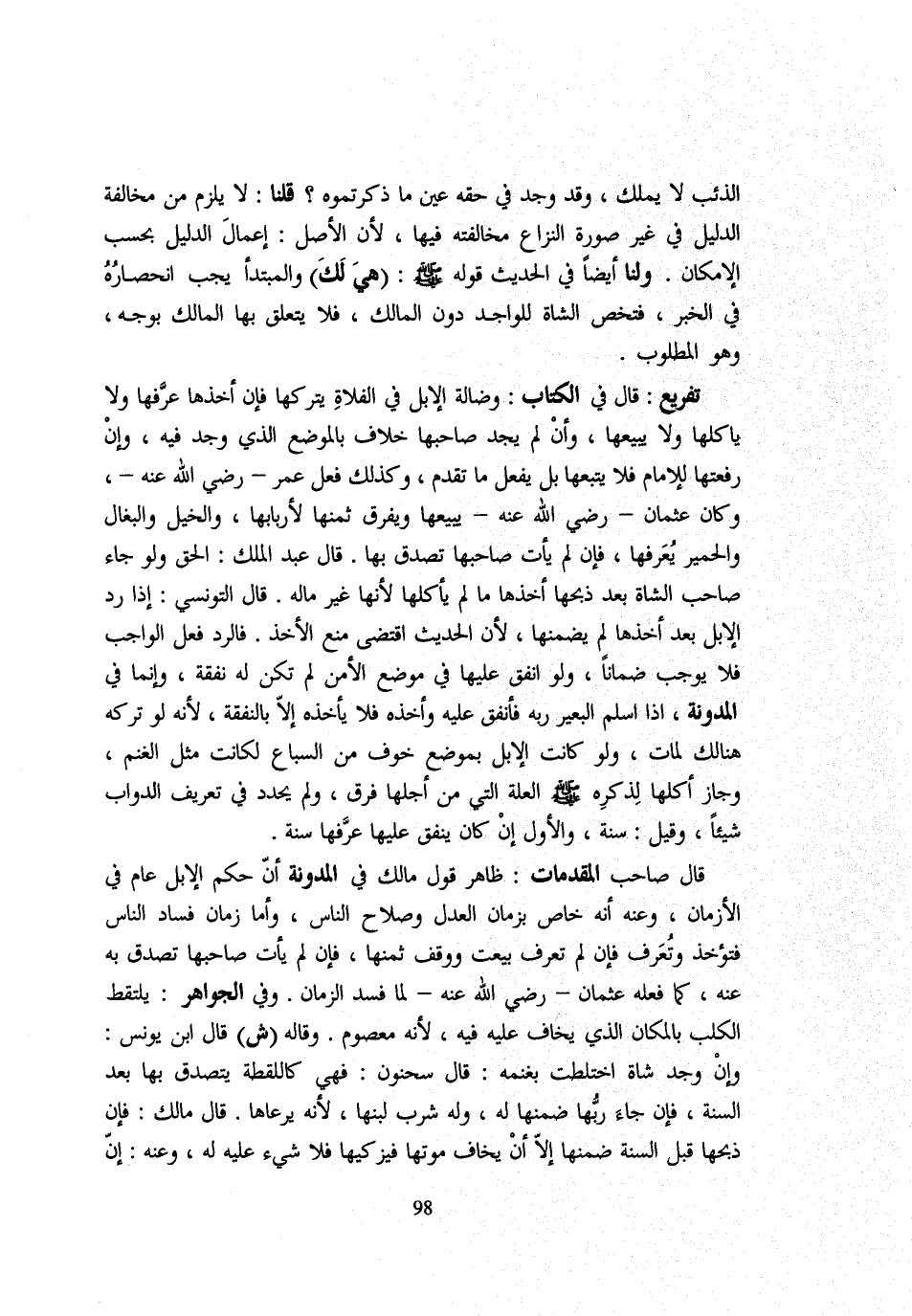 هِيَ لَكَ وَالْمُبْتَدَأُ يَجِبُ انْحِصَارُهُ فِي الْخَبَرِ فَتُخَصُّ الشَّاةُ لِلْوَاجِدِ دُونَ الْمَالِكِ فَلَا يَتَعَلَّقُ بِهَا الْمَالِكُ بِوَجْهٍ وَهُوَ الْمَطْلُوبُ تَفْرِيعٌ قَالَ فِي الْكِتَابِ وَضَالَّةُ الْإِبِلِ فِي الْفَلَاةِ يَتْرُكُهَا فَإِنْ أَخَذَهَا عَرَّفَهَا وَلَا يَأْكُلُهَا وَلَا يَبِيعُهَا وَأَن لم يجد صَاحبهَا خلاف بِالْمَوْضِعِ الَّذِي وُجِدَ فِيهِ وَإِنْ رَفَعْتَهَا لِلْإِمَامِ فَلَا يَتْبَعُهَا بَلْ يَفْعَلُ مَا تَقَدَّمَ وَكَذَلِكَ فَعَلَ عُمَرُ رَضِيَ اللَّهُ عَنْهُ وَكَانَ عُثْمَانُ رَضِيَ اللَّهُ عَنْهُ يَبِيعُهَا وَيُفَرِّقُ ثَمَنَهَا لِأَرْبَابِهَا وَالْخَيْلُ وَالْبِغَالُ وَالْحَمِيرُ يُعَرِّفُهَا فَإِنْ لَمْ يَأْتِ صَاحِبُهَا تَصَدَّقَ بِهَا قَالَ عَبْدُ الْمَلِكِ الْحَقُّ وَلَوْ جَاءَ صَاحِبُ الشَّاةِ بَعْدَ ذَبْحِهَا أَخَذَهَا مَا لَمْ يَأْكُلْهَا لِأَنَّهَا غَيْرُ مَالِهِ قَالَ التُّونِسِيُّ إِذَا رَدَّ الْإِبِلَ بَعْدَ أَخْذِهَا لَمْ يَضْمَنْهَا لِأَنَّ الْحَدِيثَ اقْتَضَى مَنْعَ الْأَخْذِ فَالرَّدُّ فِعْلُ الْوَاجِبِ فَلَا يُوجِبُ ضَمَانًا وَلَوْ أَنْفَقَ عَلَيْهَا فِي مَوْضِعِ الْأَمْنِ لَمْ تَكُنْ لَهُ نَفَقَةٌ وَإِنَّمَا فِي الْمُدَوَّنَةِ إِذَا أَسْلَمَ الْبَعِيرَ رَبَّهُ فَأَنْفَقَ عَلَيْهِ وَأَخَذَهُ فَلَا يَأْخُذُهُ إِلَّا بِالنَّفَقَةِ لِأَنَّهُ لَوْ تَرَكَهُ هُنَالِكَ لَمَاتَ وَلَوْ كَانَتِ الْإِبِلُ بِمَوْضِعِ خَوْفٍ مِنَ السِّبَاعِ لَكَانَتْ مِثْلَ الْغَنَمِ وَجَازَ أَكْلُهَا لِذِكْرِهِ - صَلَّى اللَّهُ عَلَيْهِ وَسَلَّم َ - الْعِلَّةَ الَّتِي مِنْ أَجْلِهَا فَرَّقَ وَلَمْ يُحَدِّدْ فِي تَعْرِيف الدَّوَابّ شَيْئا وَقيل سنة وَالْأول إِنْ كَانَ يُنْفِقُ عَلَيْهَا عَرَّفَهَا سَنَةً قَالَ صَاحِبُ الْمُقَدِّمَاتِ ظَاهِرُ قَوْلِ مَالِكٍ فِي الْمُدَوَّنَةِ أَنَّ حُكْمَ الْإِبِلِ عَامٌ فِي الْأَزْمَانِ وَعَنْهُ أَنَّهُ خَاصٌّ بِزَمَانِ الْعَدْلِ وَصَلَاحِ النَّاسِ وَأَمَّا زَمَانُ فَسَادِ النَّاسِ فَتُؤْخَذُ وَتُعْرَفُ فَإِنْ لَمْ تُعْرَفْ بِيعَتْ وَوُقِفَ ثَمَنُهَا فَإِنْ لَمْ يَأْتِ صَاحِبُهَا تُصُدِّقَ بِهِ عَنْهُ كَمَا فَعَلَهُ عُثْمَانُ رَضِيَ اللَّهُ عَنْهُ لَمَّا فَسَدَ الزَّمَانُ وَفِي الْجَوَاهِرِ يُلْتَقَطُ الْكَلْبُ بِالْمَكَانِ الَّذِي يُخَافُ عَلَيْهِ فِيهِ لِأَنَّهُ مَعْصُومٌ وَقَالَهُ ش قَالَ ابْنُ يُونُسَ وَإِنْ وَجَدَ شَاةً اخْتَلَطَتْ بِغَنَمِهِ قَالَ سَحْنُونٌ فَهِيَ كَاللُّقَطَةِ يُتَصَدَّقُ بِهَا بَعْدَ السَّنَةِ فَإِنْ جَاءَ رَبُّهَا ضَمِنَهَا لَهُ وَلَهُ شُرْبُ لَبَنِهَا لِأَنَّهُ يَرْعَاهَا قَالَ مَالِكٌ فَإِنْ ذَبَحَهَا قَبْلَ السَّنَةِ ضَمِنَهَا إِلَّا أَنْ يَخَافَ مَوْتَهَا فَيُزَكِّيهَا فَلَا شَيْءَ عَلَيْهِ لَهُ وَعَنْهُ إِنْ