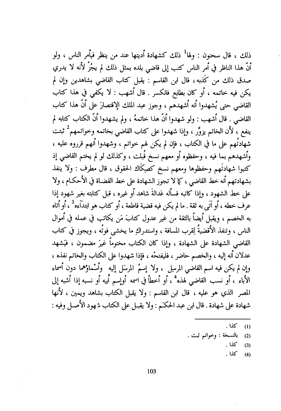 ذَلِك قَالَ سَحْنُون وَلها ذَلِك كَشَهَادَة أديتها عِنْد من ينظر فيأمر النَّاسِ وَلَوْ أَنَّ هَذَا النَّاظِرَ فِي أَمْرِ النَّاسِ كَتَبَ إِلَى قَاضِي بَلَدِهِ بِمِثْلِ ذَلِكَ لَمْ يَجُزْ لِأَنَّهُ لَا يَدْرِي صِدْقَ ذَلِكَ مِنْ كَذِبِهِ قَالَ ابْنُ الْقَاسِمِ يَقْبَلُ كِتَابَ القَاضِي بِشَاهِدين وَإِن لم يكن فِي خَاتَمُهُ أَوْ كَانَ بِطَابَعٍ فَانْكَسَرَ قَالَ أَشْهَبُ لَا يَكْفِي فِي هَذَا كِتَابُ الْقَاضِي حَتَّى يَشْهَدُوا أَنَّهُ أَشْهَدَهُمْ وَجَوَّزَ عَبْدُ الْمَلِكِ الِاقْتِصَارَ عَلَى أَنَّ هَذَا كِتَابُ الْقَاضِي قَالَ أَشْهَبُ وَلَوْ شَهِدُوا أَنَّ هَذَا خَاتَمُهُ وَلَمْ يَشْهَدُوا أَنَّ الْكِتَابَ كِتَابُهُ لَمْ يَنْفَعْ لِأَنَّ الْخَاتَمَ يُزَوَّرُ وَإِذَا شَهِدُوا عَلَى كِتَابِ الْقَاضِي بِخَاتَمِهِ وَخَوَاتِمِهِمْ ثَبَتَتْ شَهَادَتُهُمْ عَلَى مَا فِي الْكِتَابِ فَإِنْ لَمْ يَكُنْ لَهُمْ خَوَاتِمُ وَشَهِدُوا أَنَّهُمْ قرروه عَلَيْهِ وأشهدهم بِمَا فِيهِ وحفظوه أَو مَعَهم نُسَخٌ قُبِلَتْ وَكَذَلِكَ لَوْ لَمْ يَخْتِمِ الْقَاضِي إِذْ كَتَبُوا شَهَادَتَهُمْ وَحَفِظُوهَا وَمَعَهُمْ نُسَخٌ كِصِكَاكِ الْحُقُوقِ قَالَ مُطَرِّفٌ وَلَا يُنَفِّذُ بِشَهَادَتِهِمْ أَنَّهُ خَطُّ الْقَاضِي كَمَا لَا تَجُوزُ الشَّهَادَةُ عَلَى خَطِّ الْقُضَاةِ فِي الْأَحْكَامِ وَلَا عَلَى خَطِّ الشُّهُودِ وَإِذَا كَاتَبَهُ فَسَأَلَهُ عَدَالَةَ شَاهِدٍ أَوْ غَيْرِهِ قَبِلَ كِتَابَتَهُ بِغَيْرِ شُهُودٍ إِذَا عَرَفَ خَطَّهُ أَوْ أَتَى بِهِ ثِقَةٌ مَا لَمْ يَكُنْ فِيهِ قَضِيَّة قَاطِعَة أَو كتاب هُوَ ابتداءه أَوْ أَتَاهُ بِهِ الْخَصْمُ وَيُقْبَلُ أَيْضًا بِالثِّقَةِ مِنْ غَيْرِ عُدُولٍ كِتَابُ مَنْ يُكَاتِبُ فِي عَمَلِهِ فِي أَمْوَالِ النَّاسِ وَتُنَفَّذُ الْأَقْضِيَةُ لِقُرْبِ الْمَسَافَةِ وَاسْتِدْرَاكِ مَا يُخْشَى فَوْتُهُ وَيَجُوزُ فِي كِتَابِ الْقَاضِي الشَّهَادَةُ عَلَى الشَّهَادَةِ وَإِذَا كَانَ الْكِتَابُ مَخْتُومًا غَيْرَ مَضْمُونٍ فَيَشْهَدُ عَدْلَانِ أَنَّهُ إِلَيْهِ وَالْخَصْمُ حَاضِرٌ فَلْيَفْتَحْهُ فَإِذَا شَهِدُوا عَلَى الْكِتَابِ وَالْخَاتَمِ نَفَّذَهُ وَإِنْ لَمْ يَكُنْ فِيهِ اسْمُ الْقَاضِي الْمُرْسِلِ وَلَا اسْمُ الْمُرْسَلِ إِلَيْهِ وَأَسْمَاؤُهُمَا دُونَ أَسْمَاءِ الْآبَاءِ أَوْ نَسَبُ الْقَاضِي لِهَذِهِ أَوْ أَخْطَأَ فِي اسْمِهِ أَوِ اسْمِ أَبِيهِ أَوْ نَسَبِهِ إِذَا أَشْبَهَ إِلَى الْمِصْرِ الَّذِي هُوَ عَلَيْهِ قَالَ ابْنُ الْقَاسِمِ وَلَا يُقْبَلُ الْكِتَابُ بِشَاهِدٍ وَيَمِينٍ لِأَنَّهَا شَهَادَةٌ عَلَى شَهَادَةٍ قَالَ ابْنُ عَبْدِ الْحَكَمِ وَلَا يُقْبَلُ عَلَى الْكِتَابِ شُهُودُ الْأَصْلِ وَفِيهِ