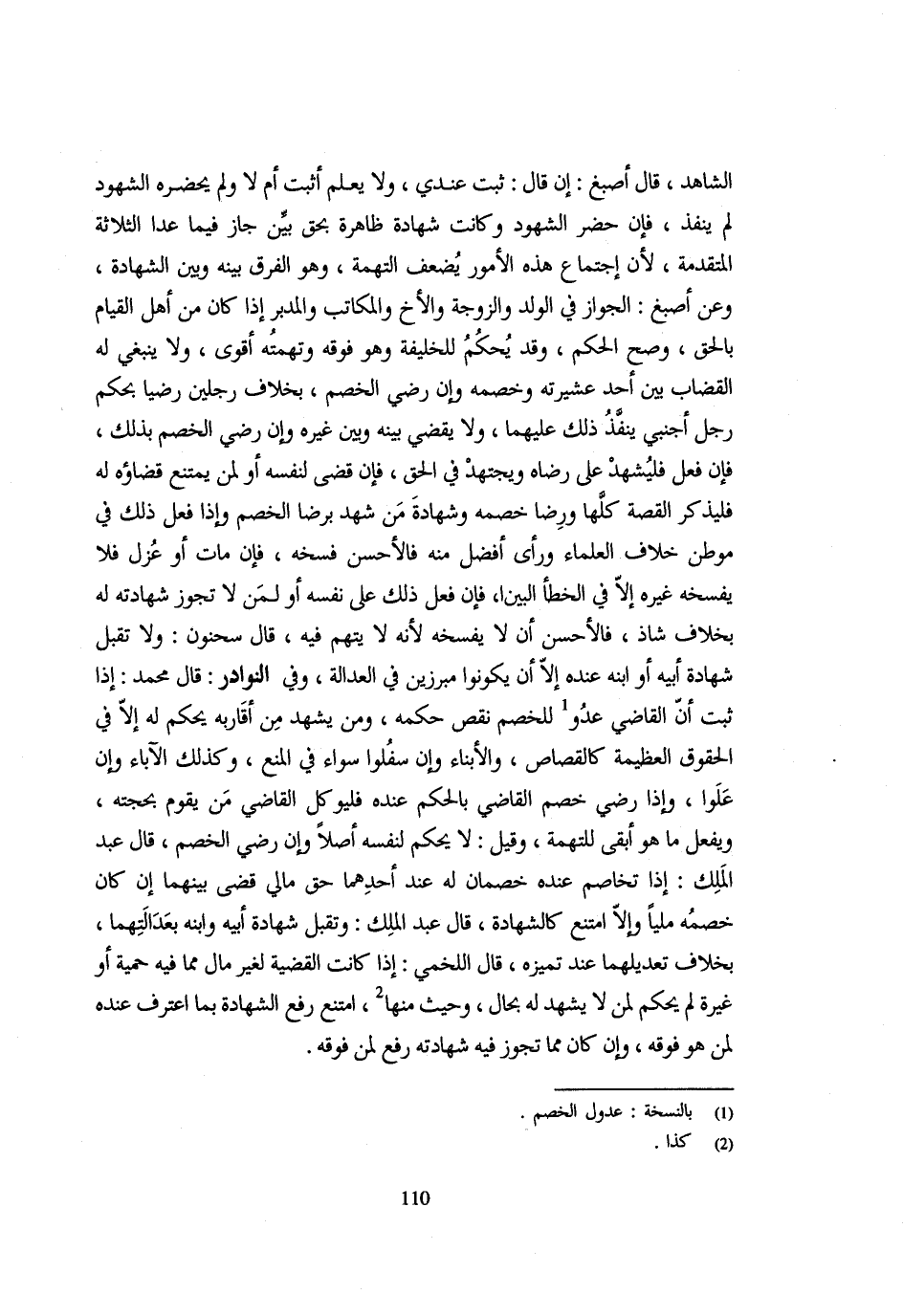 الشَّاهِدِ قَالَ أَصْبَغُ إِنْ قَالَ ثَبَتَ عِنْدِي وَلَا يُعْلَمُ أَثَبَتَ أَمْ لَا وَلَمْ يَحْضُرْهُ الشُّهُود لم ينْفد فَإِنْ حَضَرَ الشُّهُودُ وَكَانَتْ شَهَادَةً ظَاهِرَةً بِحَقٍّ بَيِّنٍ جَازَ فِيمَا عَدَا الثَّلَاثَةَ الْمُتَقَدِّمَةَ لِأَنَّ اجْتِمَاعَ هَذِهِ الْأُمُورِ يُضَعِّفُ التُّهْمَةَ وَهُوَ الْفَرْقُ بَيْنَهُ وَبَيْنَ الشَّهَادَةِ وَعَنْ أَصْبَغَ الْجَوَازُ فِي الْوَلَدِ وَالزَّوْجَةِ وَالْأَخِ وَالْمُكَاتَبِ وَالْمُدَبَّرِ إِذَا كَانَ مِنْ أَهْلِ الْقِيَامِ بِالْحَقِّ وَصَحَّ الْحُكْمُ وَقَدْ يَحْكُمُ لِلْخَلِيفَةِ وَهُوَ فَوْقَهُ وَتُهْمَتُهُ أَقْوَى وَلَا يَنْبَغِي لَهُ القضاب بَيْنَ أَحَدِ عَشِيرَتِهِ وَخَصْمِهِ وَإِنْ رَضِيَ الْخَصْمُ بِخِلَاف رجلَيْنِ رَضِيا بِحكم رجل أَجْنَبِي ينْفد ذَلِكَ عَلَيْهِمَا وَلَا يَقْضِي بَيْنَهُ وَبَيْنَ غَيْرِهِ وَإِنْ رَضِيَ الْخَصْمُ بِذَلِكَ فَإِنْ فَعَلَ فَلْيُشْهِدْ عَلَى رِضَاهُ وَيَجْتَهِدْ فِي الْحَقِّ فَإِنْ قَضَى لِنَفْسِهِ أَوْ لِمَنْ يَمْتَنِعُ قَضَاؤُهُ لَهُ فَلْيَذْكُرِ الْقِصَّةَ كُلَّهَا وَرِضَا خَصْمِهِ وَشَهَادَةَ مَنْ شَهِدَ بِرِضَا الْخَصْمِ وَإِذَا فَعَلَ ذَلِكَ فِي مَوْطِنِ خِلَافِ الْعُلَمَاءِ وَرَأَى أَفْضَلَ مِنْهُ فَالْأَحْسَنُ فَسْخُهُ فَإِنْ مَاتَ أَوْ عُزِلَ فَلَا يَفْسَخُهُ غَيْرُهُ إِلَّا فِي الْخَطَأِ الْبَيِّنِ فَإِنْ فَعَلَ ذَلِكَ عَلَى نَفْسِهِ أَوْ لِمَنْ لَا تَجُوزُ شَهَادَتُهُ لَهُ بِخِلَاف شَاذ فَالْأَحْسَن أَن لَا يَفْسَخَهُ لِأَنَّهُ لَا يُتَّهَمُ فِيهِ قَالَ سَحْنُونٌ وَلَا تُقْبَلُ شَهَادَةُ أَبِيهِ أَوِ ابْنِهِ عِنْدَهُ إِلَّا أَنْ يَكُونُوا مُبَرَّزِينَ فِي الْعَدَالَةِ وَفِي النَّوَادِرِ قَالَ مُحَمَّدٌ إِذَا ثَبَتَ أَنَّ الْقَاضِيَ عَدو للخصم نقص حُكْمُهُ وَمَنْ يَشْهَدُ مِنْ أَقَارِبِهِ يَحْكُمُ لَهُ إِلَّا فِي الْحُقُوق العضيمة كَالْقِصَاصِ وَالْأَبْنَاءُ وَإِنْ سَفُلُوا سَوَاءٌ فِي الْمَنْعِ وَكَذَلِكَ الْآبَاءُ وَإِنْ عَلَوْا وَإِذَا رَضِيَ خَصْمُ القَاضِي بالحكم عِنْده فليو كل الْقَاضِي مَنْ يَقُومُ بِحُجَّتِهِ وَيَفْعَلُ مَا هُوَ أبقى لِلتُّهْمَةِ وَقِيلَ لَا يَحْكُمُ لِنَفْسِهِ أَصْلًا وَإِنْ رَضِيَ الْخَصْمُ قَالَ عَبْدُ الْمَلِكِ إِذَا تَخَاصَمَ عِنْدَهُ خَصْمَانِ لَهُ عِنْدَ أَحَدِهِمَا حَقٌّ مَالِيٌّ قضى بَينهمَا إِن كَانَ خَصمه مَلِيًّا وَإِلَّا امْتَنَعَ كَالشَّهَادَةِ قَالَ عَبْدُ الْمَلِكِ وَتُقْبَلُ شَهَادَةُ أَبِيهِ وَابْنِهِ بِعَدَالَتِهِمَا بِخِلَافِ تَعْدِيلِهِمَا عِنْدَ تميزه قَالَ اللَّخْمِيُّ إِذَا كَانَتِ الْقَضِيَّةُ لِغَيْرِ مَالٍ مِمَّا فِيهِ حَمِيَّةٌ أَوْ غَيْرَةٌ لَمْ يَحْكُمْ لمن لَا يشْهد لَهُ بِحَال وَحَيْثُ مِنْهَا امْتَنَعَ رَفْعُ الشَّهَادَةِ بِمَا اعْتَرَفَ عِنْدَهُ لِمَنْ هُوَ فَوْقَهُ وَإِنْ كَانَ مِمَّا تَجُوزُ فِيهِ شَهَادَته رفع لمن فَوْقه