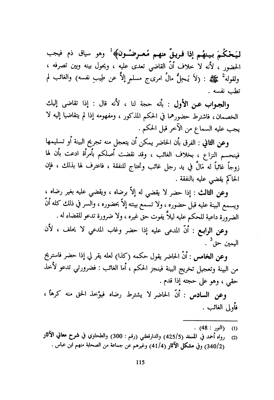 ليحكم بَينهم اذا فريق مِنْهُم معرضون} وَهُوَ سِيَاق ذمّ فَيجب الْحُضُور لِأَنَّهُ لَا خِلَافَ أَنَّ الْقَاضِيَ تَعَدَّى عَلَيْهِ وَيَحُولُ بَيْنَهُ وَبَيْنَ تَصَرُّفِهِ وَلِقَوْلِهِ - صَلَّى اللَّهُ عَلَيْهِ وَسَلَّم َ - لَا يحل مَال أمرى ج مُسْلِمٍ إِلَّا عَنْ طِيبِ نَفْسِهِ وَالْغَائِبُ لَمْ تَطُبْ نَفْسُهُ وَالْجَوَابُ عَنِ الْأَوَّلِ بِأَنَّهُ حُجَّةٌ لَنَا لِأَنَّهُ قَالَ إِذَا تَقَاضَى إِلَيْكَ الْخَصْمَانِ فأشترط حضورهما فِي الحكم الْمَذْكُور وَمَفْهُوم إِذَا لَمْ يَتَقَاضَيَا إِلَيْهِ لَا يَجِبُ عَلَيْهِ السَّمَاعُ مِنَ الْآخَرِ قَبْلَ الْحُكْمِ وَعَنِ الثَّانِي الْفَرْقُ بِأَنَّ الْحَاضِرَ يُمْكِنُ أَنْ يَتَعَجَّلَ مِنْهُ تَجْرِيحُ الْبَيِّنَةِ أَوْ تَسْلِيمِهَا فَيَنْحَسِمُ النِّزَاعُ بِخِلَافِ الْغَائِب وَقد نقضت أَصْلُكُمْ بِامْرَأَةٍ ادَّعَتْ بِأَنَّ لَهَا زَوْجًا غَائِبًا لَهُ مَالٌ فِي يَدِ رَجُلٍ غَائِبٍ وَتَحْتَاجُ لِلنَّفَقَةِ فَاعْتَرَفَ لَهَا بِذَلِكَ فَإِنَّ الْحَاكِمَ يَقْضِي عَلَيْهِ بِالنَّفَقَةِ وَعَنِ الثَّالِثِ إِذَا حَضَرَ لَا يَقْضِي لَهُ إِلَّا بِرِضَاهُ وَيَقْضِي عَلَيْهِ بِغَيْرِ رِضَاهُ وَيَسْمَعُ الْبَيِّنَةَ عَلَيْهِ قَبْلَ حُضُورِهِ وَلَا تُسْمَعُ بَيِّنَتُهُ إِلَّا بِحُضُورِهِ وَالسِّرُّ فِي ذَلِكَ كُله ان الضَّرُورَة دَاعِيَة للْحكم عَلَيْهِ لَيْلًا يُفَوِّتَ حَقَّ غَيْرِهِ وَلَا ضَرُورَةَ تَدْعُو لِلْقَضَاءِ لَهُ وَعَنِ الرَّابِعِ أَنَّ الْمُدَّعَى عَلَيْهِ إِذَا حَضَرَ وَغَابَ الْمُدَّعِي لَا يَحْلِفُ لِأَنَّ الْيَمِينَ حق وَعَن الْخَامِس ان الْحَاضِر يَقُول حكمه كَذَا لَعَلَّهُ يُقِرُّ لِيَ إِذَا حَضَرَ فَأَسْتَرِيحُ مِنَ الْبَيِّنَة وتعجيل تَخْرِيج الْبَيِّنَة فينجز الحكم اما الْغَائِب فضرورتي تدعوا لِأَخْذِ حَقِّي وَهُوَ عَلَى حُجَّتِهِ إِذَا قَدِمَ وَعَنِ السَّادِسِ أَنَّ الْحَاضِرَ لَا يَشْتَرِطُ رِضَاهُ فَيُؤْخَذُ الْحَقُّ مِنْهُ كَرْهًا فَأَوْلَى الْغَائِبِ