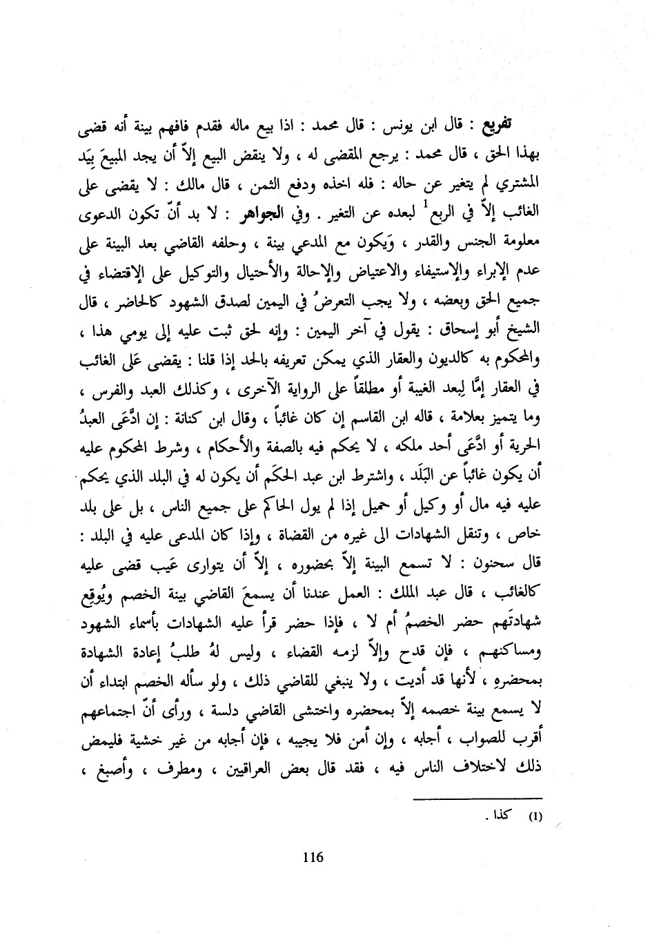 تَفْرِيعٌ قَالَ ابْنُ يُونُسَ قَالَ مُحَمَّدٌ إِذَا بيع مَاله فَقدم فَافْهَم بَيِّنَة أَنه قضى بِهَذَا الْحق قَالَ مُحَمَّد يرجع الْمَقْضِيِّ لَهُ وَلَا يَنْقُضُ الْبَيْعَ إِلَّا أَنْ يَجِدَ الْمَبِيعَ بِيَدِ الْمُشْتَرِي لَمْ يَتَغَيَّرْ عَنْ حَالِهِ فَلَهُ أَخْذُهُ وَدَفَعُ الثَّمَنِ قَالَ مَالِكٌ لَا يُقْضَى عَلَى الْغَائِبِ إِلَّا فِي الرُّبْعِ لِبُعْدِهِ عَنِ التَّغَيُّرِ وَفِي الْجَوَاهِرِ لَا بُدَّ أَنْ تَكُونَ الدَّعْوَى مَعْلُومَةَ الْجِنْسِ وَالْقَدْرِ وَيَكُونَ مَعَ الْمُدَّعِي بَيِّنَةٌ وَحَلَّفَهُ الْقَاضِيَ بَعْدَ الْبَيِّنَةِ عَلَى عَدَمِ الْإِبْرَاءِ وَالِاسْتِيفَاءِ وَالِاعْتِيَاضِ وَالْإِحَالَةِ وَالِاحْتِيَالِ وَالتَّوْكِيلِ عَلَى الِاقْتِضَاءِ فِي جَمِيعِ الْحَقِّ وَبَعْضِهِ وَلَا يَجِبُ التَّعَرُّضُ فِي الْيَمِينِ لِصِدْقِ الشُّهُودِ كَالْحَاضِرِ قَالَ الشَّيْخُ أَبُو إِسْحَاقَ يَقُولُ فِي آخر الْيَمين وَأَنه لحق ثَبت عَلَيْهِ الْحق إِلَى يَوْمِي هَذَا وَالْمَحْكُومُ بِهِ كَالدُّيُونِ وَالْعَقَارِ الَّذِي يُمْكِنُ تَعْرِيفُهُ بِالْحَدِّ إِذَا قُلْنَا يُقْضَى عَلَى الْغَائِبِ فِي الْعَقَارِ إِمَّا لِبُعْدِ الْغَيْبَةِ أَوْ مُطْلَقًا عَلَى الرِّوَايَةِ الْأُخَرَى وَكَذَلِكَ الْعَبْدُ وَالْفَرَسُ وَمَا يَتَمَيَّزُ بِعَلَامَةٍ قَالَهُ ابْنُ الْقَاسِمِ إِنْ كَانَ غَائِبًا وَقَالَ ابْنُ كِنَانَةَ إِنِ ادَّعَى الْعَبْدُ الْحَرِيَّةَ أَوِ ادَّعَى أَحَدٌ مِلْكَهُ لَا يحكم فِيهِ بِالصّفةِ والاحكام وَشَرْطُ الْمَحْكُومِ عَلَيْهِ أَنْ يَكُونَ غَائِبًا عَنِ الْبَلَدِ وَاشْتَرَطَ ابْنُ عَبْدِ الْحَكَمِ أَنْ يَكُونَ لَهُ فِي الْبَلَدِ الَّذِي يَحْكُمُ عَلَيْهِ فِيهِ مَالٌ أَوْ وَكِيلٌ أَوْ حَمِيلٌ إِذَا لَمْ يُوَلِّ الْحَاكِمَ عَلَى جَمِيعِ النَّاسِ بَلْ عَلَى بَلَدٍ خَاصٍّ وَتُنْقَلُ الشَّهَادَاتُ إِلَى غَيْرِهِ مِنَ الْقُضَاةِ وَإِذَا كَانَ الْمُدَّعَى عَلَيْهِ فِي الْبَلَدِ قَالَ سَحْنُونٌ لَا تُسْمَعُ الْبَيِّنَةُ إِلَّا بِحُضُورِهِ الا ان يتَوَارَى غيب قضى عَلَيْهِ كَالْغَائِبِ قَالَ عَبْدُ الْمَلِكِ الْعَمَلُ عِنْدَنَا أَنْ يَسْمَعَ الْقَاضِي بَيِّنَةَ الْخَصْمِ وَيُوقِّعَ شَهَادَتَهُمْ حَضَرَ الْخَصْمُ أَمْ لَا فَإِذَا حَضَرَ قَرَأَ عَلَيْهِ الشَّهَادَاتِ بِأَسْمَاءِ الشُّهُودِ وَمَسَاكِنِهِمْ فَإِنْ قَدَحَ وَإِلَّا لَزِمَهُ الْقَضَاءُ وَلَيْسَ لَهُ طَلَبُ إِعَادَةِ الشَّهَادَةِ بِمَحْضَرِهِ لِأَنَّهَا قَدْ أُدِّيَتْ وَلَا يَنْبَغِي للْقَاضِي ذَلِك وَلَو ساله الْخصم ابْتِدَاء ان لَا يسمع بَيِّنَة خَصمه الا بمحضره واختشى الْقَاضِي دَلَّسَهُ وَرَأَى أَنَّ اجْتِمَاعَهُمْ أَقْرَبُ لِلصَّوَابِ أَجَابَهُ وَإِنْ أَمِنَ فَلَا يُجِيبْهُ فَإِنْ أَجَابَهُ مِنْ غَيْرِ خَشْيَةٍ فَلْيُمْضِ ذَلِكَ لِاخْتِلَافِ النَّاسِ فِيهِ فَقَدْ قَالَ بَعْضُ الْعِرَاقِيِّينَ وَمُطْرِّفٌ وَأَصْبَغُ
