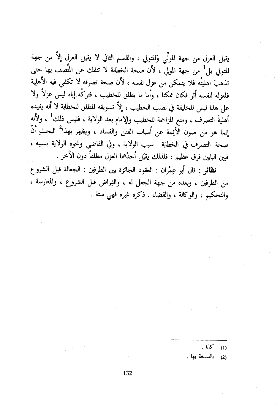 يَقْبَلُ الْعَزْلَ مِنْ جِهَةِ الْمُوَلِّي وَالْمُتَوَلِّي وَالْقِسْمُ الثَّانِي لَا يقبل الْعَزْل الا مِنْ جِهَةِ الْمُتَوَلِّي بَلْ مِنْ جِهَةِ الْمُوَلِّي لَان صِحَة الْخَطَابَةِ لَا تَنْفَكُّ عَنِ الْمُتَّصِفِ بِهَا حَتَّى تَذْهَبَ أَهْلِيَّتُهُ فَلَا يَتَمَكَّنُ مِنْ عَزْلِ نَفْسِهِ لِأَنَّ صِحَّةَ تَصَرُّفِهِ لَا تَكْفِي فِيهِ الْأَهْلِيَّةُ فَلِعَزْلِهِ لِنَفْسِهِ أَثَرٌ فَكَانَ مُمْكِنًا وَأَمَّا مَا يُطلق للخطيب فَتَركه اياه لَيْسَ عزلا وَلَا على هَذَا لَيْسَ لِلْخَلِيفَةِ فِي نَصْبِ الْخَطِيبِ إِلَّا تسويقه الْمُطْلَقُ لِلْخَطَابَةِ لَا أَنَّهُ يُفِيدُهُ أَهْلِيَّةَ التَّصَرُّفِ وَمَنْعَ الْمُزَاحَمَةِ لِلْخَطِيبِ وَالْإِمَامِ بَعْدَ الْوِلَايَةِ فَلَيْسَ ذَلِك وَلِأَنَّهُ إِنَّمَا هُوَ مِنْ صَوْنِ الْأَئِمَّةِ عَنْ أَسْبَابِ الْفِتَنِ وَالْفَسَادِ وَيَظْهَرُ بِهَذَا الْبَحْثِ أَنَّ صِحَّةَ التَّصَرُّفِ فِي الْخَطَابَةِ سَبَبُ الْوِلَايَةِ وَفِي الْقَاضِي وَنَحْوِهِ الْوِلَايَةُ بِسَبَبِهِ فَبَيْنَ الْبَابَيْنِ فَرْقٌ عَظِيمٌ فَلِذَلِكَ يَقْبَلُ أَحَدُهُمَا الْعَزْلَ مُطْلَقًا دُونَ الْآخَرِ نَظَائِرُ قَالَ أَبُو عِمْرَانَ الْعُقُودُ الْجَائِزَةُ بَيْنَ الطَّرَفَيْنِ الْجَعَالَةُ قَبْلَ الشُّرُوعِ مِنَ الطَّرَفَيْنِ وَبَعْدَهُ من جِهَة الْجعل لَهُ وَالْقِرَاضُ قَبْلَ الشُّرُوعِ وَالْمُغَارَسَةُ وَالتَّحْكِيمُ وَالْوَكَالَةُ وَالْقَضَاءُ ذَكَرَهُ غَيْرُهُ فَهِيَ سِتَّةٌ