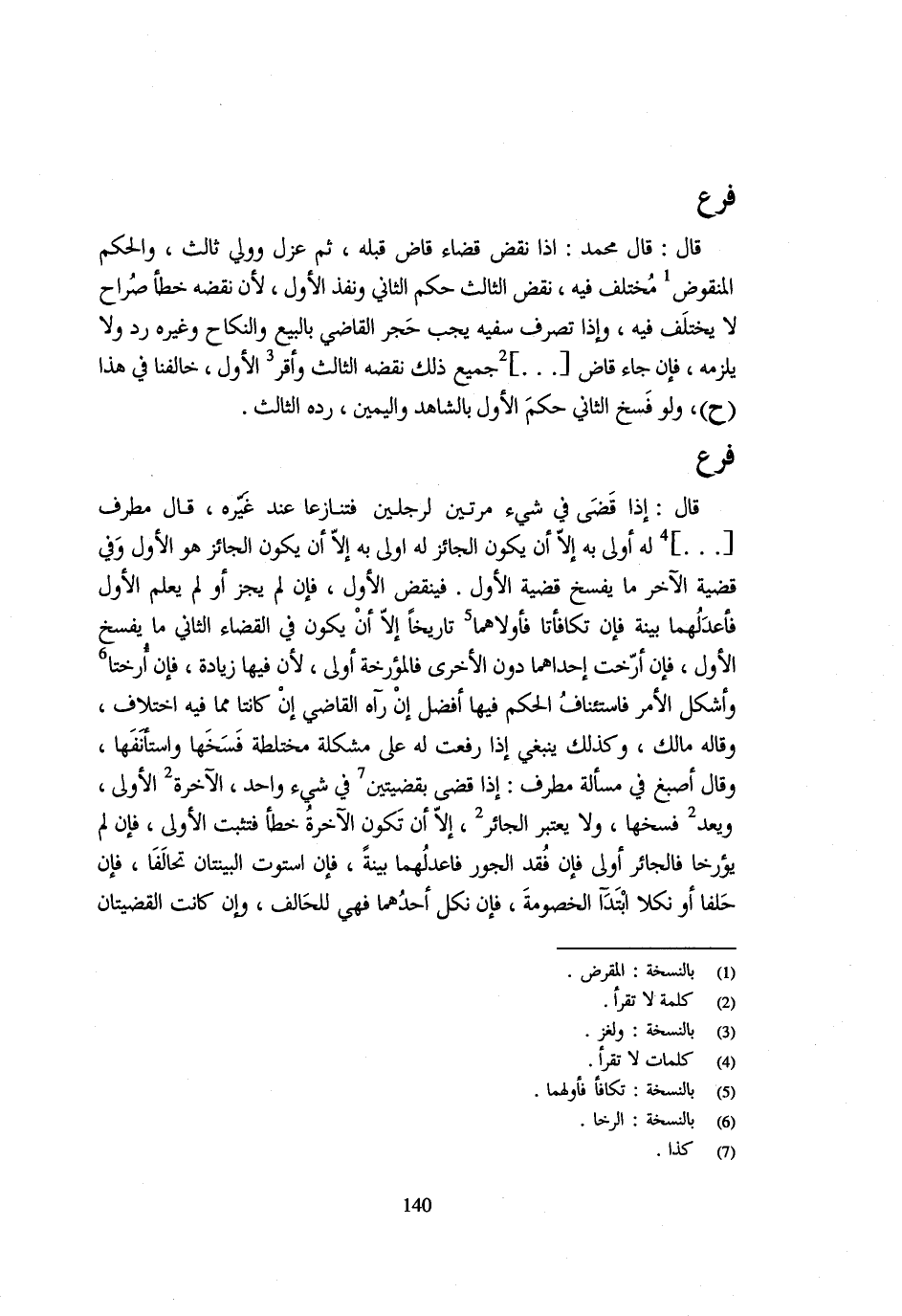 قَالَ قَالَ مُحَمَّدٌ إِذَا نَقَضَ قَضَاءَ قَاضٍ قَبْلَهُ ثُمَّ عُزِلَ وَوُلِّيَ ثَالِثٌ وَالْحُكْمُ الْمَنْقُوضُ مُخْتَلَفٌ فِيهِ نَقَضَ الثَّالِثُ حُكْمَ الثَّانِي وَنَفَّذَ الْأَوَّلَ لِأَنَّ نَقَضَهُ خَطَأٌ صُرَاحٌ لَا يُخْتَلَفُ فِيهِ وَإِذَا تَصَرَّفَ سَفِيهٌ يَجِبُ حَجْرُ القَاضِي بِالْبَيْعِ وَالنِّكَاحِ وَغَيْرِهِ رُدَّ وَلَا يَلْزَمُهُ فَإِنْ جَاءَ قَاض جَمِيعَ ذَلِكَ نَقَضَهُ الثَّالِثُ وَأَقَرَّ الْأَوَّلَ خَالَفَنَا فِي هَذَا ح وَلَوْ فَسَخَ الثَّانِي حُكْمَ الْأَوَّلِ بِالشَّاهِدِ وَالْيَمِينِ رَدَّهُ الثَّالِثُ