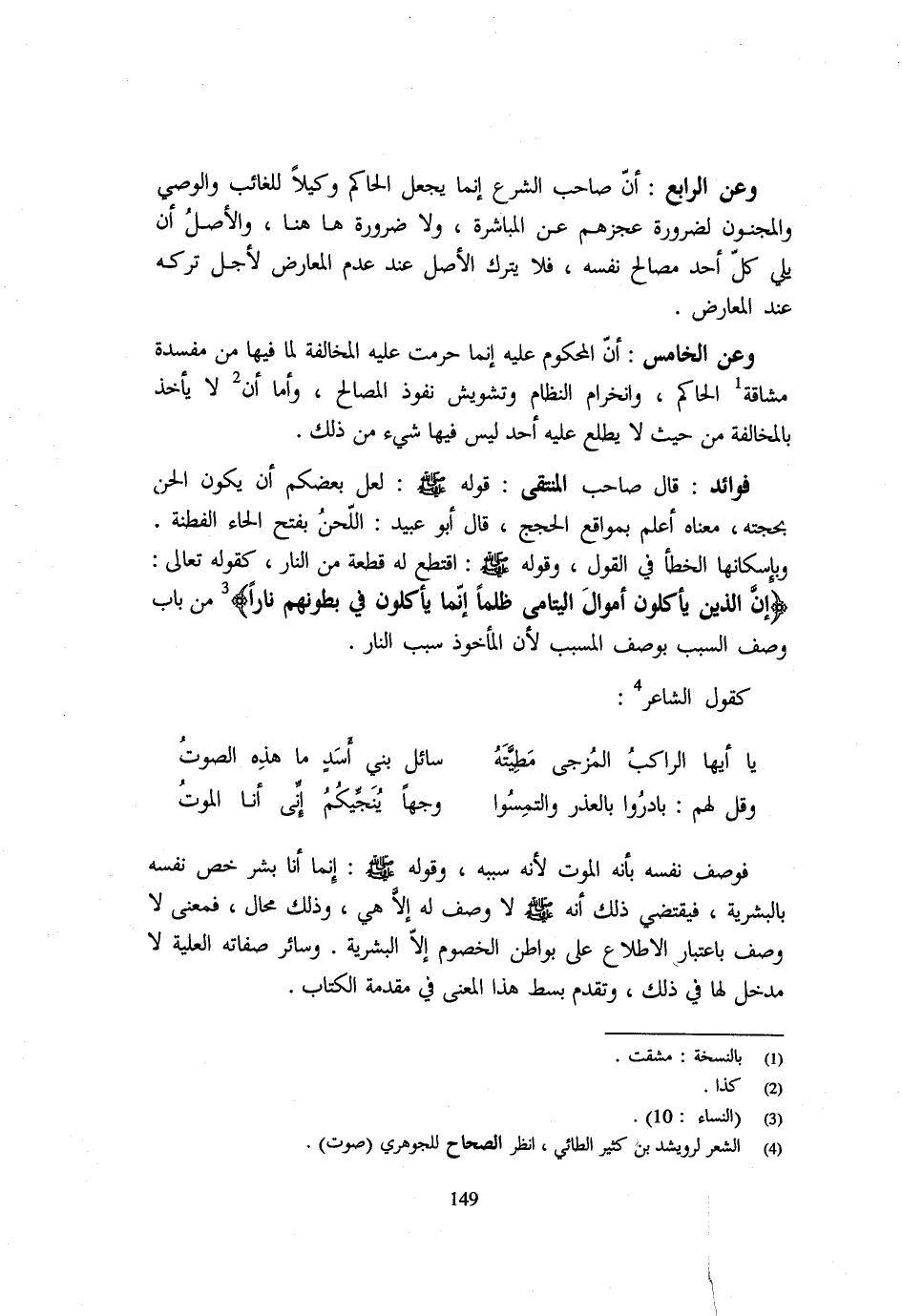 وَعَنِ الرَّابِعِ أَنَّ صَاحِبَ الشَّرْعِ إِنَّمَا يَجْعَلُ الْحَاكِمَ وَكِيلًا لِلْغَائِبِ وَالْوَصِيِّ وَالْمَجْنُونِ لِضَرُورَةِ عَجْزِهِمْ عَن الْمُبَاشرَة وَلَا ضَرُورَة هَاهُنَا وَالْأَصْلُ أَنْ يَلِيَ كُلُّ أَحَدٍ مَصَالِحَ نَفْسِهِ فَلَا يُتْرَكُ الْأَصْلُ عِنْدَ عَدَمِ الْمُعَارِضِ لِأَجْلِ تَرْكِهِ عِنْدَ الْمُعَارِضِ وَعَنِ الْخَامِسِ أَنَّ الْمَحْكُومَ عَلَيْهِ إِنَّمَا حَرُمَتْ عَلَيْهِ الْمُخَالَفَةُ لِمَا فِيهَا مِنْ مَفْسَدَةِ مُشَاقَّةِ الْحَاكِمِ وَانْخِرَامِ النِّظَامِ وَتَشْوِيشِ نُفُوذ الْمصَالح واما ان لَا يَأْخُذَ بِالْمُخَالَفَةِ مِنْ حَيْثُ لَا يَطَّلِعُ عَلَيْهِ أحد لَيْسَ فِيهَا شَيْءٌ مِنْ ذَلِكَ فَوَائِدُ قَالَ صَاحِبُ المنتقي قَوْله - صَلَّى اللَّهُ عَلَيْهِ وَسَلَّم َ - لَعَلَّ بَعْضَكُمْ أَنْ يَكُونَ أَلْحَنَ بِحُجَّتِهِ مَعْنَاهُ أَعْلَمُ بِمَوَاقِعِ الْحُجَجِ قَالَ أَبُو عُبَيْدٍ اللَّحَنُ بِفَتْحِ الْحَاءِ الْفِطْنَةُ وَبِإِسْكَانِهَا الْخَطَأُ فِي الْقَوْلِ وَقَوله - صَلَّى اللَّهُ عَلَيْهِ وَسَلَّم َ - أَقْتَطِعُ لَهُ قِطْعَةً مِنَ النَّارِ كَقَوْلِهِ تَعَالَى {ان اللَّذين يَأْكُلُونَ أَمْوَالَ الْيَتَامَى ظُلْمًا إِنَّمَا يَأْكُلُونَ فِي بطونهم نَارا} مِنْ بَابِ وَصْفِ السَّبَبِ بِوَصْفِ الْمُسَبَّبِ لِأَنَّ الْمَأْخُوذَ سَبَبُ النَّارِ كَقَوْلِ الشَّاعِرِ