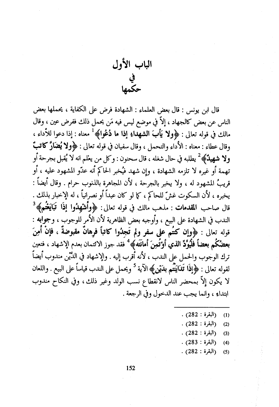 قَالَ ابْنُ يُونُسَ قَالَ بَعْضُ الْعُلَمَاءِ الشَّهَادَةُ فَرْضٌ عَلَى الْكِفَايَةِ يَحْمِلُهَا بَعْضُ النَّاسِ عَنْ بَعْضٍ كَالْجِهَادِ إِلَّا فِي مَوْضِعٍ لَيْسَ فِيهِ مَنْ يَحْمِلُ ذَلِكَ فَفَرْضُ عَيْنٍ وَقَالَ مَالِكٌ فِي قَوْله تَعَالَى {وَلَا يأب الشُّهَدَاء إِذا مَا دعوا} مَعْنَاهُ إِذَا دُعُوا لِلْأَدَاءِ وَقَالَ عَطَاءٌ مَعْنَاهُ الْأَدَاءُ وَالتَّحَمُّلُ وَقَالَ سُفْيَانُ فِي قَوْله تَعَالَى {وَلَا يضار كَاتب وَلَا شَهِيد} يَطْلُبُهُ فِي حَالِ شُغْلِهِ قَالَ سَحْنُونٌ وَكُلُّ مَنْ يُعْلَمُ أَنَّهُ لَا يُقْبَلُ بِجُرْحَةٍ أَوْ تُهْمَةٍ أَوْ غَيْرِهِ لَا تَلْزَمُهُ الشَّهَادَةُ وَإِنْ شَهِدَ فَيُخْبِرُ الْحَاكِمَ أَنَّهُ عَدُوُّ الْمَشْهُودِ عَلَيْهِ أَوْ قَرِيبُ الْمَشْهُودِ لَهُ وَلَا يُخْبِرُ بِالْجُرْحَةِ لِأَنَّ الْمُجَاهَرَةَ بِالذُّنُوبِ حَرَامٌ وَقَالَ أَيْضًا يُخْبِرُهُ لِأَنَّ السُّكُوتَ غِشٌّ لِلْحَاكِمِ كَمَا لَوْ كَانَ عَبْدًا أَوْ نَصْرَانِيًّا لَهُ الْإِخْبَارُ بِذَلِكَ قَالَ صَاحِبُ الْمُقَدِّمَاتِ مَذْهَبُ مَالِكٍ فِي قَوْله تَعَالَى {واشهدوا اذا تبايعنم} النَّدْبُ فِي الشَّهَادَةِ عَلَى الْبَيْعِ وَأَوْجَبَهُ بَعْضُ الظَّاهِرِيَّةِ لِأَنَّ الْأَمْرَ لِلْوُجُوبِ وَجَوَابُهُ قَوْله تَعَالَى {وَإِنْ كُنْتُمْ عَلَى سَفَرٍ وَلَمْ تَجِدُوا كَاتِبًا فَرِهَانٌ مَقْبُوضَةٌ فَإِنْ أَمِنَ بَعْضُكُمْ بَعْضًا فَلْيُؤَدِّ الَّذِي اؤْتُمِنَ أَمَانَته} فَقَدَ جَوَّزَ الِائْتِمَانَ بِعَدَمِ الْإِشْهَادِ فَتَعَيَّنَ تَرْكُ الْوُجُوبِ وَالْحَمْلُ عَلَى النَّدْبِ لِأَنَّهُ أَقْرَبُ إِلَيْهِ وَالْإِشْهَادُ فِي الدَّيْنِ مَنْدُوبٌ أَيْضًا لِقَوْلِهِ تَعَالَى {إِذا تداينتم بدين} الْآيَةَ وَيُحْمَلُ عَلَى النَّدْبِ قِيَاسًا عَلَى الْبَيْعِ وَاللِّعَانُ لَا يَكُونُ إِلَّا بِمَحْضِرِ النَّاسِ لِانْقِطَاعِ نَسَبِ الْوَلَدِ وَغَيْرِ ذَلِكَ وَفِي النِّكَاحِ مَنْدُوبٌ ابْتِدَاءً وَإِنَّمَا يَجِبُ عِنْدَ الدُّخُولِ وَفِي الرَّجْعَةِ