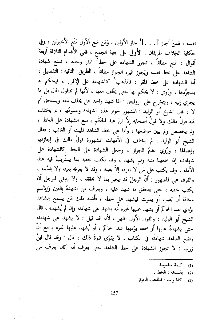 نَفسه فَمن اجاز جَازَ الْأَوَّلَيْنَ وَمَنْ مَنَعَ الْأَوَّلَ مَنَعَ الْأَخِيرَيْنِ وَفِي حِكَايَة الْخلاف طَرِيقَانِ الأولى عَلَى جِهَةِ الْجَمْعِ فَفِي الْأَقْسَامِ الثَّلَاثَةِ أَرْبَعَةُ أَقْوَالٍ الْمَنْعُ مُطْلَقًا تَجُوزُ الشَّهَادَةُ عَلَى خَطِّ الْمُقِرِّ وَحْدَهُ تُمْنَعُ شَهَادَةُ الشَّاهِدِ عَلَى خَطِّ نَفسه وَيجوز غَيره الْجَوَاز مُطلقًا الطَّرِيق الثَّانِيَة التَّفْصِيلُ أَمَّا الشَّهَادَةُ عَلَى خَطِّ الْمُقِرِّ فَالْمَذْهَبُ كَالشَّهَادَةِ عَلَى الْإِقْرَارِ فَيَحْكُمُ لَهُ بِمَجْرَّدِهَا وَرُوِيَ لَا يَحْكُمُ بِهَا حَتَّى يَحْلِفَ مَعَهَا لِأَنَّهَا لَمْ تَتَنَاوَلِ الْمَالَ بَلْ مَا يَجْرِي إِلَيْهِ وَيَتَخَرَّجُ عَلَى الرِّوَايَتَيْنِ إِذَا شَهِدَ وَاحِدٌ هَلْ يَحْلِفُ مَعَهُ وَيَسْتَحِقُّ أَمْ لَا قَالَ الشَّيْخُ ابو الْوَلِيد الْمَشْهُور جَوَاز هَذِه الشَّهَادَة وعمومها لَمْ يَخْتَلِفْ فِيهِ قَوْلُ مَالِكٍ وَلَا قَوْلُ أَصْحَابِهِ إِلَّا ابْنُ عَبْدِ الْحَكَمِ مَنَعَ الشَّهَادَةَ عَلَى الْخَطِّ وَلَمْ يُخَصِّصْ وَلَمْ يُبَيِّنْ مَوْضِعَهَا وَأَمَّا عَلَى خَطِّ الشَّاهِدِ الْمَيِّتِ أَوِ الْغَائِبِ فَقَالَ الشَّيْخُ أَبُو الْوَلِيدِ لَمْ يَخْتَلِفْ فِي الْأُمَّهَاتِ الْمَشْهُورَةِ قَوْلُ مَالِكٍ فِي إِجَازَتِهَا وَإِعْمَالِهَا وَرُوِيَ عَدَمُ الْجَوَازِ وَجَعَلَ الشَّهَادَةَ عَلَى الْخَطِّ كَالشَّهَادَةِ عَلَى شَهَادَتِهِ إِذَا سَمِعَهَا مِنْهُ وَلَمْ يَشْهَدْ وَقَدْ يَكْتُبُ خَطَّهُ بِمَا يَسْتَرِيبُ فِيهِ عِنْدَ الْأَدَاءِ وَقَدْ يَكْتُبُ عَلَى مَنْ لَا يعرفهُ الا بِعَيْنِه وَقد لَا يَعْرِفُهُ إِلَّا بِعَيْنِهِ وَقَدْ لَا يَعْرِفُهُ بِعَيْنِهِ وَلَا بِاسْمِهِ وَالْفَرْقُ عَلَى الْمَشْهُورِ أَنَّ الرَّجُلَ قَدْ يُخْبِرُ بِمَا لَا يُحَقِّقُهُ وَلَا يَنْبَغِي لِلرَّجُلِ أَنْ يَكْتُبَ خَطَّهُ حَتَّى يَتَحَقَّقَ مَا شَهِدَ عَلَيْهِ وَيَعْرِفَ مَنِ أَشْهَدَهُ بِالْعَيْنِ وبالاسم مُخَالفَة أَنْ يَغِيبَ أَوْ يَمُوتَ فَيَشْهَدَ عَلَى خَطِّهِ فَأَشْبَهَ ذَلِكَ مَنْ يَسْمَعُ الشَّاهِدَ يُؤَدِّي عِنْدَ الْحَاكِمِ أَوْ يُشْهِدُ عَلَيْهَا غَيْرَهُ أَنَّهُ يَشْهَدُ عَلَى شَهَادَتِهِ وَإِنْ لَمْ يُشْهِدْهُ قَالَ الشَّيْخُ أَبُو الْوَلِيدِ وَالْقَوْلُ الْأَوَّلُ أَظْهَرُ لِأَنَّهُ قَدْ قِيلَ لَا يَشْهَدُ عَلَى شَهَادَتِهِ حَتَّى يُشْهِدَهُ عَلَيْهَا أَوْ سَمِعَهُ يُؤَدِّيهَا عِنْدَ الْحَاكِمِ أَوْ يُشْهِدُ عَلَيْهَا غَيْرَهُ مَعَ أَنَّ وَضْعَ الشَّاهِدِ شَهَادَتَهُ فِي الْكِتَابِ لَا يَقْوَى قُوَّةَ ذَلِكَ قَالَ وَقد قَالَ ابْن زرب لاتجوز الشَّهَادَةُ عَلَى خَطِّ الشَّاهِدِ حَتَّى يَعْرِفَ أَنَّهُ كَانَ يَعْرِفُ مَنْ