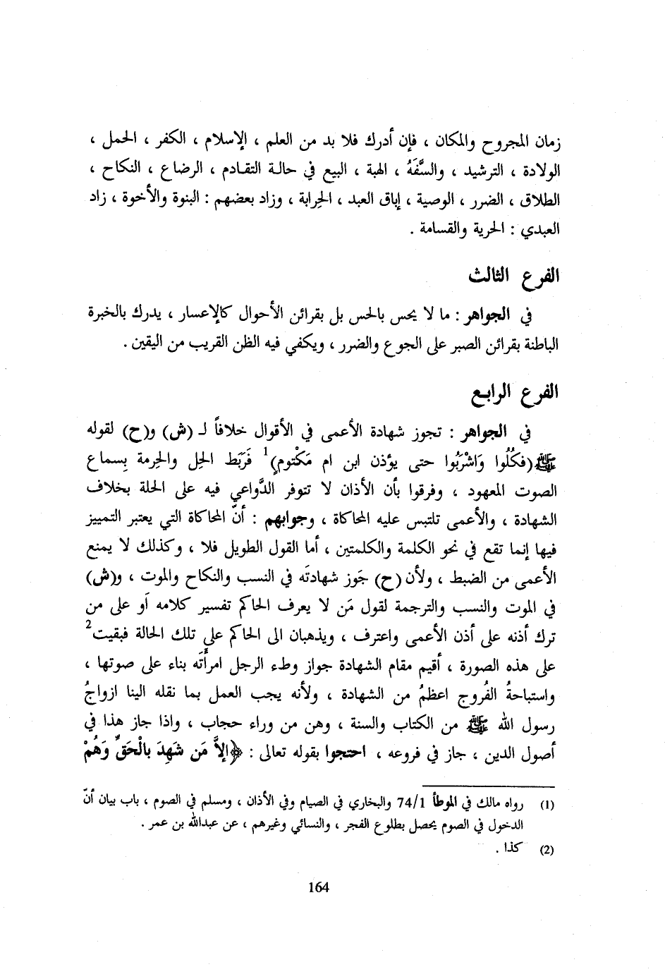 فِي الْجَوَاهِرِ تَجُوزُ شَهَادَةُ الاعمى فِي الاقوال خلافًا ل ش وح لقَوْله - صَلَّى اللَّهُ عَلَيْهِ وَسَلَّم َ - فَكُلُوا وَاشْرَبُوا حَتَّى يُؤَذِّنَ ابْنُ أُمِّ مَكْتُومٍ فرط الْحِلَّ وَالْحُرْمَةَ بِسَمَاعِ الصَّوْتِ الْمَعْهُودِ وَفَرَّقُوا بِأَنَّ الاذان لَا تتوفر الدَّوَاعِي فِيهِ على الْحلَّة بِخِلَافِ الشَّهَادَةِ وَالْأَعْمَى تَلْتَبِسُ عَلَيْهِ الْمُحَاكَاةُ وَجَوَابُهُمْ ان المحاكاة الَّتِي يعْتَبر التَّمْيِيزُ فِيهَا إِنَّمَا تَقَعُ فِي نَحْوِ الْكَلِمَةِ وَالْكَلِمَتَيْنِ أَمَّا الْقَوْلُ الطَّوِيلُ فَلَا وَكَذَلِكَ لَا يُمْنَعُ الْأَعْمَى مِنَ الضَّبْطِ وَلِأَنَّ ح جَوَّزَ شَهَادَته فِي النّسَب وَالنِّكَاح وَالْمَوْت وش فِي الْمَوْتِ وَالنَّسَبِ وَالتَّرْجَمَةِ لِقَوْلِ مَنْ لَا يَعْرِفُ الْحَاكِمُ تَفْسِيرَ كَلَامِهِ أَوْ عَلَى مَنْ تَرَكَ أُذُنَهُ عَلَى أُذُنِ الْأَعْمَى وَاعْتَرَفَ وَيَذْهَبَانِ إِلَى الْحَاكِمِ عَلَى تِلْكَ الْحَالَةِ فَبَقِيَتْ عَلَى هَذِهِ الصُّورَةِ أُقِيمَ مَقَامَ الشَّهَادَةِ جَوَازُ وَطْءِ الرَّجُلِ امْرَأَتَهُ بِنَاءً عَلَى صَوْتِهَا وَاسْتِبَاحَةُ الْفُرُوجِ أَعْظَمُ مِنَ الشَّهَادَةِ وَلِأَنَّهُ يَجِبُ الْعَمَلُ بِمَا نَقَلَهُ إِلَيْنَا أَزْوَاجُ رَسُولِ اللَّهِ - صَلَّى اللَّهُ عَلَيْهِ وَسَلَّم َ - مِنَ الْكِتَابِ وَالسُّنَّةِ وَهُنَّ مِنْ وَرَاءِ حِجَابٍ وَإِذَا جَازَ هَذَا فِي أُصُولِ الدِّينِ جَازَ فِي فُرُوعِهِ احْتَجُّوا بِقَوْلِهِ تَعَالَى {إِلا مَنْ شهد بِالْحَقِّ وهم