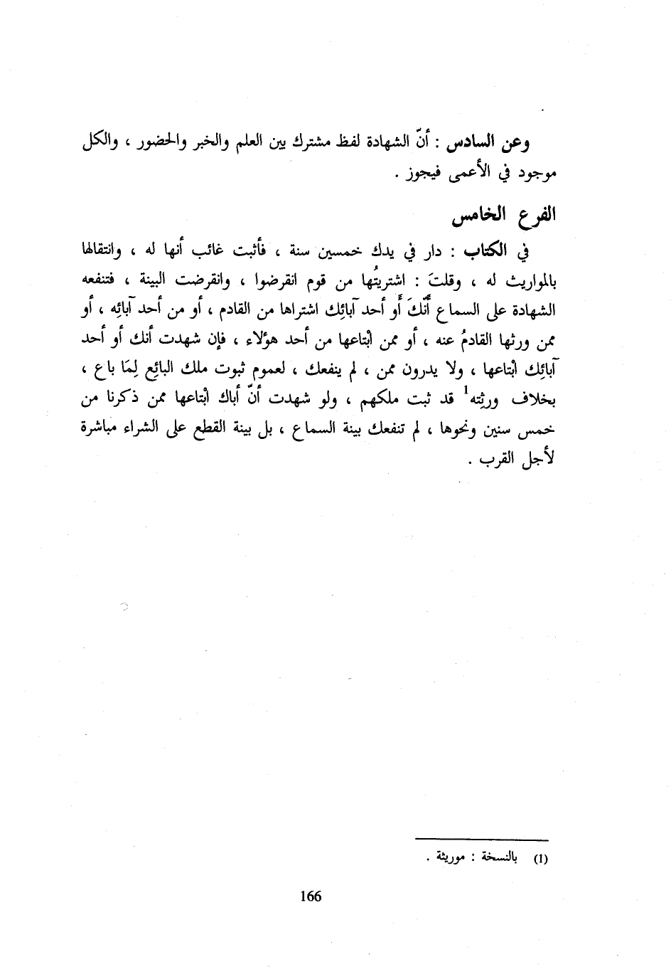 فِي الْكِتَابِ دَارٌ فِي يَدِكَ خَمْسِينَ سَنَةً فَأَثْبَتَ غَائِبٌ أَنَّهَا لَهُ وَانْتِقَالُهَا بِالْمَوَارِيثِ لَهُ وَقُلْتَ اشْتَرَيْتُهَا مِنْ قَوْمٍ انْقَرَضُوا وانقرضت الْبَيِّنَة فتنفعه الشَّهَادَةُ عَلَى السَّمَاعِ أَنَّكَ أَوْ أَحَدَ آبَائِكَ اشْتَرَاهَا مِنَ الْقَادِمِ أَوْ مِنْ أَحَدِ آبَائِهِ أَوْ مِمَّنْ وَرِثَهَا الْقَادِمُ عَنْهُ أَوْ مِمَّنِ ابْتَاعَهَا مِنْ أَحَدِ هَؤُلَاءِ فَإِنْ شَهِدَتْ أَنَّكَ أَوْ أَحَدَ آبَائِكَ ابْتَاعَهَا وَلَا يَدْرُونَ مِمَّنْ لَمْ يَنْفَعْكَ لِعُمُومِ ثُبُوتِ مِلْكِ الْبَائِعِ لِمَا بَاعَ بِخِلَافِ وَرَثَتِهِ قَدْ ثَبَتَ مِلْكُهُمْ وَلَوْ شَهِدَتْ أَنَّ أَبَاكَ ابْتَاعَهَا مِمَّنْ ذَكَرْنَا مِنْ خَمْسِ سِنِينَ وَنَحْوِهَا لَمْ تَنْفَعْكَ بَيِّنَةُ السَّمَاعِ بل بنية الْقَطْعِ عَلَى الشِّرَاءِ مُبَاشَرَةً لِأَجْلِ الْقُرْبِ