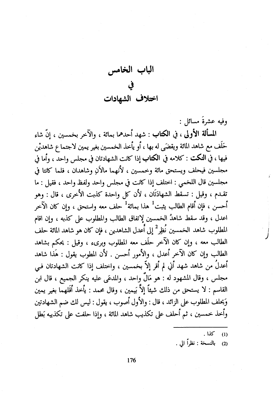 وَفِيه عشرَة مَسَائِلَ الْمَسْأَلَةُ الْأُولَى فِي الْكِتَابِ شَهِدَ أَحَدُهُمَا بِمِائَةٍ وَالْآخَرُ بِخَمْسِينَ إِنْ شَاءَ حَلَفَ مَعَ شَاهِدِ الْمِائَةِ وَيُقْضَى لَهُ بِهَا أَوْ يَأْخُذُ الْخمسين بِغَيْر يَمِين لِاجْتِمَاع شَاهِدين فِيهَا فِي النُّكَتِ كَلَامُهُ فِي الْكِتَابِ إِذَا كَانَتِ الشَّهَادَتَانِ فِي مَجْلِسٍ وَاحِدٍ وَأَمَّا فِي مَجْلِسَيْنِ فَيَحْلِفُ وَيسْتَحق مائَة وَخمسين لِأَنَّهُمَا ملان وَشَاهِدَانِ فَلَمَّا كَانَتَا فِي مَجْلِسَيْنِ قَالَ اللَّخْمِيُّ اخْتُلِفَ إِذَا كَانَتْ فِي مَجْلِسٍ وَاحِدٍ وَلَفْظٍ وَاحِدٍ فَقِيلَ مَا تَقَدَّمَ وَقِيلَ تَسْقُطُ الشَّهَادَتَانِ لِأَنَّ كُلَّ وَاحِدَةٍ كَذَّبَتِ الْأُخْرَى قَالَ وَهُوَ احسن فَإِن أَقَامَ الطَّالِب يثبت هَذَا بِمِائَةٍ حَلَفَ مَعَهُ وَاسْتَحَقَّ وَإِنْ كَانَ الْآخَرُ أَعْدَلَ وَقَدْ سَقَطَ شَاهِدُ الْخَمْسِينَ لِاتِّفَاقِ الطَّالِبِ وَالْمَطْلُوب على كذبه وان اقام الْمَطْلُوب شَاهد الْخمسين نَظَرَ إِلَى أَعْدَلِ الشَّاهِدَيْنِ فَإِنْ كَانَ هُوَ شَاهِدَ الْمِائَةِ حَلَفَ الطَّالِبُ مَعَهُ وَإِنْ كَانَ الآخر حلف مَعَه الْمَطْلُوب وبرىء وَقيل يحكم بِشَاهِد الطَّالِب وان كَانَ الآخر اعْدِلْ والامور أَحْسَنَ لِأَنَّ الْمَطْلُوبَ يَقُولُ هَذَا شَاهِدٌ أَعْدَلُ من شَاهد شَهِدَ أَنِّي لَمْ أُقِرَّ إِلَّا بِخَمْسِينَ وَاخْتُلِفَ إِذَا كَانَتِ الشَّهَادَتَانِ فِي مَجْلِسٍ وَقَالَ الْمَشْهُودُ لَهُ هُوَ مَالٌ وَاحِدٌ وَالْمُدَّعَى عَلَيْهِ يُنْكِرُ الْجَمِيعَ قَالَ ابْنُ الْقَاسِمِ لَا يَسْتَحِقُّ مِنْ ذَلِكَ شَيْئًا إِلَّا بِيَمِينٍ وَقَالَ مُحَمَّدٌ يَأْخُذُ أَقَلَّهُمَا بِغَيْرِ يَمِينٍ وَيَحْلِفُ الْمَطْلُوبُ عَلَى الزَّائِدِ قَالَ وَالْأَوَّلُ أَصْوَبُ يَقُولُ لَيْسَ لَكَ ضَمُّ الشَّهَادَتَيْنِ وَأَخْذُ خَمْسِينَ ثُمَّ احْلِفْ عَلَى تَكْذِيبِ شَاهد الْمِائَة واذا حَلَفت عَلَى تَكْذِيبِهِ بَطَلَ