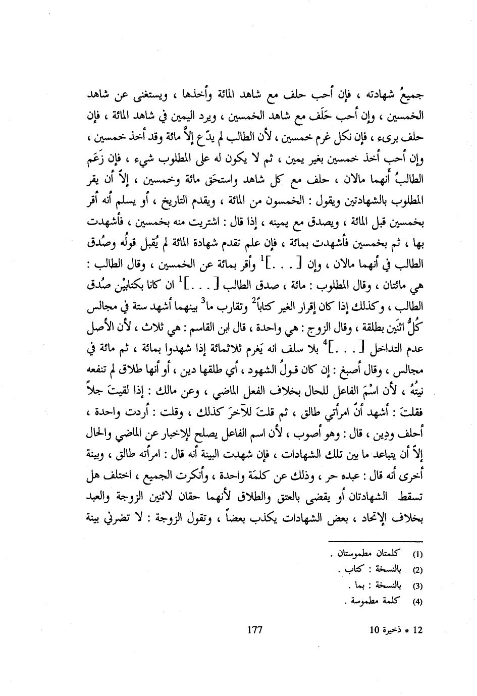 جَمِيعُ شَهَادَتِهِ فَإِنْ أَحَبَّ حَلَفَ مَعَ شَاهِدِ الْمِائَة واخذها ويستعنى عَنْ شَاهِدِ الْخَمْسِينَ وَإِنْ أَحَبَّ حَلَفَ مَعَ شَاهِدِ الْخَمْسِينَ وَيُرَدُّ الْيَمِينُ فِي شَاهِدِ الْمِائَةِ فَإِن حلف برىء فَإِن نَكَلَ غَرِمَ خَمْسِينَ لِأَنَّ الطَّالِبَ لَمْ يَدَّعِ إِلَّا مِائَةً وَقَدْ أَخَذَ خَمْسِينَ وَإِنْ أَحَبَّ أَخَذَ خَمْسِينَ بِغَيْرِ يَمِينٍ ثُمَّ لَا يَكُونُ لَهُ عَلَى الْمَطْلُوبِ شَيْءٌ فَإِنْ زَعَمَ الطَّالِبُ أَنَّهُمَا مَالَانِ حَلَفَ مَعَ كُلِّ شَاهِدٍ وَاسْتَحَقَّ مِائَةً وَخَمْسِينَ إِلَّا أَنْ يُقِرَّ الْمَطْلُوبُ بِالشَّهَادَتَيْنِ وَيَقُولَ الْخَمْسُونَ مِنَ الْمِائَةِ وَيُقَدِّمُ التَّارِيخَ أَوْ يُسَلِّمُ أَنَّهُ أَقَرَّ بِخَمْسِينَ قَبْلَ الْمِائَةِ وَيُصَدَّقُ مَعَ يَمِينِهِ إِذَا قَالَ اشْتَرَيْتُ مِنْهُ بِخَمْسِينَ فَأَشْهَدْتُ بِهَا ثُمَّ بِخَمْسِينَ فَأَشْهَدْتُ بِمِائَةٍ فَإِنْ عُلِمَ تَقَدُّمُ شَهَادَةِ الْمِائَةِ لَمْ يُقْبَلْ قَوْلُهُ وَصُدِّقَ الطَّالِبُ فِي أَنَّهُمَا مَالَانِ وَإِنْ وَأَقَرَّ بِمِائَةٍ عَنِ الْخَمْسِينَ وَقَالَ الطَّالِبُ هِيَ مِائَتَانِ وَقَالَ الْمَطْلُوبُ مِائَةٌ صُدِّقَ الطَّالِبُ إِنْ كَانَا بِكِتَابَيْنِ صُدِّقَ الطَّالِبُ وَكَذَلِكَ إِذَا كَانَ إِقْرَارُ الْغَيْر كتابا وتقارب مَا بَينهمَا أُشْهِدَ سِتَّةٌ فِي مَجَالِسَ كُلُّ اثْنَيْنِ بِطَلْقَةٍ وَقَالَ الزَّوْجُ هِيَ وَاحِدَةٌ قَالَ ابْنُ الْقَاسِمِ هِيَ ثَلَاثٌ لِأَنَّ الْأَصْلَ عَدَمُ التَّدَاخُلِ بِلَا سَلَفٍ أَنَّهُ يَغْرَمُ ثَلَاثَمِائَةٍ إِذَا شَهِدُوا بِمِائَةٍ ثُمَّ مِائَةٍ فِي مَجَالِسَ وَقَالَ أَصْبَغُ إِنْ كَانَ قَوْلُ الشُّهُودِ أَيْ طَلَّقَهَا دِينَ أَوْ أَنَّهَا طَلَاقٌ لَمْ تَنْفَعْهُ نِيَّتُهُ لِأَنَّ اسْمَ الْفَاعِلِ لِلْحَالِ بِخِلَافِ الْفِعْلِ الْمَاضِي وَعَنْ مَالِكٍ إِذَا لَقِيتَ رَجُلًا فَقُلْتَ اشْهَدْ أَنَّ امْرَأَتِي طَالِقٌ ثُمَّ قُلْتَ لِلْآخَرِ كَذَلِكَ وَقُلْتَ أَرَدْتُ وَاحِدَةً أَحْلِفُ وَدِينَ قَالَ وَهُوَ أَصْوَبُ لِأَنَّ اسْمَ الْفَاعِلِ يَصْلُحُ لِلْإِخْبَارِ عَنِ الْمَاضِي وَالْحَالِ الا ان يتباعد مَا بَين الشَّهَادَاتِ فَإِنْ شَهِدَتِ الْبَيِّنَةُ أَنَّهُ قَالَ امْرَأَتُهُ طَالِقٌ وَبَيِّنَةٌ أُخْرَى أَنَّهُ قَالَ عَبْدُهُ حُرٌّ وَذَلِكَ عَن كلمة وَاحِدَة وانكرت الْجَمِيعُ اخْتُلِفَ هَلْ تَسْقُطُ الشَّهَادَتَانِ أَوْ يُقْضَى بِالْعِتْقِ وَالطَّلَاقِ لِأَنَّهُمَا حَقًّانِ لِاثْنَيْنِ الزَّوْجَةِ وَالْعَبْدِ بِخِلَافِ الِاتِّحَادِ بَعْضُ الشَّهَادَاتِ يُكَذِّبُ بَعْضًا وَتَقُولُ الزَّوْجَةُ لَا تَضُرُّنِي بَيِّنَةُ