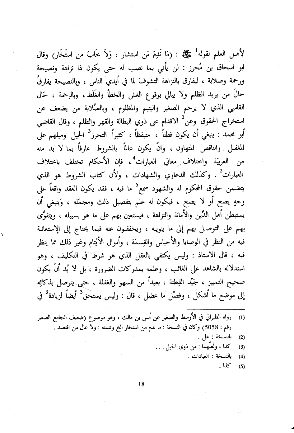 وَقَالَ أَبُو إِسْحَاقَ بْنُ مُحْرِزٍ لَنْ يَأْتِيَ بِمَا نُصِبَ لَهُ حَتَّى يَكُونَ ذَا نَزَاهَةٍ وَنَصِيحَةٍ وَرَحْمَةٍ وَصَلَابَةٍ لِيُفَارِقَ بِالنَّزَاهَةِ التَّشَوُّفَ لما فِي أيذي النَّاسِ وَبِالنَّصِيحَةِ يُفَارِقُ حَالَ مَنْ يُرِيدُ الظُّلْمَ وَلَا يُبَالِي بِوُقُوعِ الْغِشِّ وَالْخَطَأِ وَالْغَلَطِ وَبِالرَّحْمَةِ حَالَ الْقَاسِي الَّذِي لَا يَرْحَمُ الصَّغِيرَ وَالْيَتِيمَ وَالْمَظْلُومَ وَبِالصَّلَابَةِ مَنْ يَضْعُفُ عَنِ اسْتِخْرَاجِ الْحُقُوقِ وَعَنِ الْإِقْدَامِ عَلَى ذَوِي الْبِطَالَةِ وَالْقَهْرِ وَالظُّلْمِ وَقَالَ الْقَاضِي أَبُو مُحَمَّدٍ يَنْبَغِي أَنْ يَكُونَ فطنا متيقظا كثيرا التَّحَرُّز الْحِيَلِ وَمَيْلِهِمْ عَلَى الْمُغَفَّلِ وَالنَّاقِصِ الْمُتَهَاوِنِ وَأَنْ يَكُونَ عَالِمًا بِالشُّرُوطِ عَارِفًا بِمَا لَا بُدَّ مِنْهُ مِنَ الْعَرَبِيَّةِ وَاخْتِلَافِ مَعَانِي الْعِبَارَاتِ فَإِنَّ الْأَحْكَامَ تَخْتَلِفُ بِاخْتِلَافِ الْعِبَارَاتِ وَكَذَلِكَ الدَّعَاوَى وَالشَّهَادَاتُ وَلِأَنَّ كِتَابَ الشُّرُوطِ هُوَ الَّذِي يَتَضَمَّنُ حُقُوقَ الْمَحْكُومِ لَهُ وَالشُّهُودِ سَمِعَ مَا فِيهِ فَقَدْ يَكُونُ الْعَقْدُ وَاقِعًا عَلَى وَجْهٍ يَصِحُّ أَوْ لَا يَصِحُّ فَيَكُونُ لَهُ عِلْمٌ بِتَفْصِيلِ ذَلِكَ وَمُجْمَلِهِ وَيَنْبَغِي أَنْ يَسْتَبْطِنَ أَهْلَ الدِّينِ وَالْأَمَانَةِ وَالنَّزَاهَةِ فَيَسْتَعِينَ بِهِمْ عَلَى مَا هُوَ بِسَبِيلِهِ وَيَتَقَوَّى بِهِمْ عَلَى التَّوَصُّلِ بِهِمْ إِلَى مَا يَنْوِيهِ وَيُخَفِّفُونَ عَنْهُ فِيمَا يَحْتَاجُ إِلَى الِاسْتِعَانَةِ فِيهِ مِنَ النَّظَرِ فِي الْوَصَايَا وَالْأَحْبَاسِ وَالْقِسْمَةِ وَأَمْوَالِ الْأَيْتَامِ وَغَيْرِ ذَلِكَ مِمَّا يُنْظَرُ فِيهِ قَالَ الْأُسْتَاذُ وَلَيْسَ يَكْتَفِي بِالْعَقْلِ الَّذِي هُوَ شَرْطٌ فِي التَّكْلِيفِ وَهُوَ اسْتِدْلَالُهُ بِالشَّاهِدِ عَلَى الْغَائِبِ وَعِلْمُهُ بِمُدْرَكَاتِ الضَّرُورَةِ بَلْ لَا بُدَّ أَنْ يَكُونَ صَحِيحَ التَّمْيِيزِ جَيِّدَ الْفِطْنَةِ بَعِيدًا مِنَ السَّهْوِ وَالْغَفْلَةِ حَتَّى يَتَوَصَّلَ بِذَكَائِهِ إِلَى مَوْضِعِ مَا أُشْكِلَ وَفَصْلِ مَا عَضُلَ قَالَ وَلَيْسَ يَسْتَحِقُّ أَيْضًا لِزِيَادَةٍ فِي