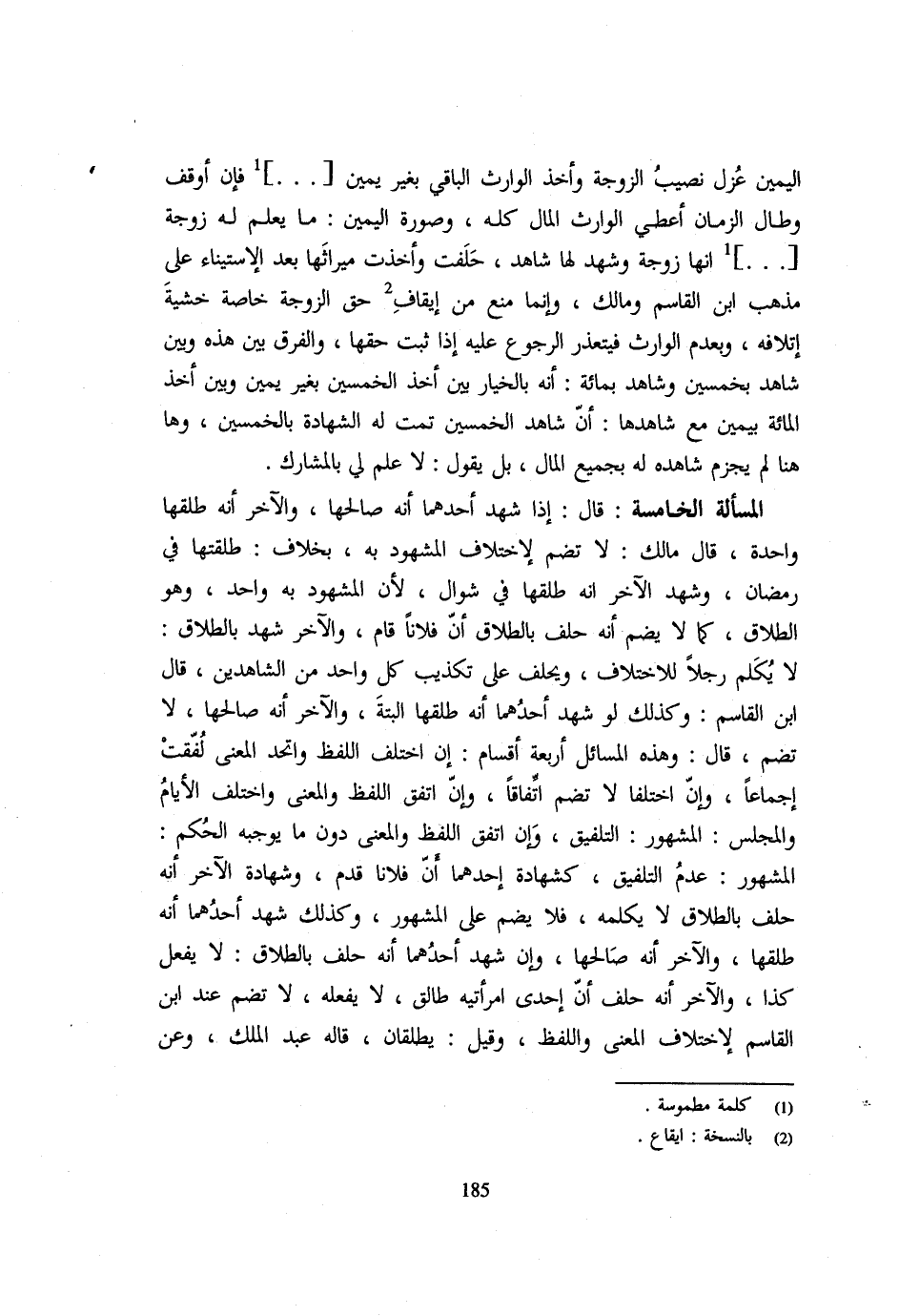 الْيَمِينِ عَزَلَ نَصِيبَ الزَّوْجَةِ وَأَخَذَ الْوَارِثُ الْبَاقِيَ بِغَيْر يَمِين فَإِن اوقف وَطَالَ الزَّمَانُ أُعْطِيَ الْوَارِثُ الْمَالَ كُلَّهُ وَصُورَةُ الْيَمين مَا يعلم لَهُ زَوْجَة أَنَّهَا زَوْجَةٌ وَشَهِدَ لَهَا شَاهِدٌ حَلَفَتْ وَأَخَذَتْ مِيرَاثَهَا بَعْدَ الِاسْتِينَاءِ عَلَى مَذْهَبِ ابْنِ الْقَاسِمِ وَمَالِكٍ وَإِنَّمَا مُنِعَ مِنْ إِيقَافِ حَقِّ الزَّوْجَةِ خَاصَّة خشيَة اتلافه وبعدم الْوَارِثُ فَيَتَعَذَّرُ الرُّجُوعُ عَلَيْهِ إِذَا ثَبَتَ حَقُّهَا وَالْفَرْقُ بَيْنَ هَذِهِ وَبَيْنَ شَاهِدٍ بِخَمْسِينَ وَشَاهِدٍ بِمِائَةٍ أَنَّهُ بِالْخِيَارِ بَيْنَ أَخْذِ الْخَمْسِينَ بِغَيْرِ يَمِين وَبَين اخذ الْمِائَة بِيَمِين مَعَ شَاهدهَا أَنَّ شَاهِدَ الْخَمْسِينَ تَمَّتْ لَهُ الشَّهَادَةُ بِالْخَمْسِينَ وَهَاهُنَا لَمْ يَجْزِمْ شَاهِدُهُ لَهُ بِجَمِيعِ الْمَالِ بَلْ يَقُولُ لَا عِلْمَ لِي بِالْمُشَارِكِ الْمَسْأَلَةُ الْخَامِسَةُ قَالَ إِذَا شَهِدَ أَحَدُهُمَا أَنَّهُ صَالَحَهَا وَالْآخَرُ أَنَّهُ طَلَّقَهَا وَاحِدَةً قَالَ مَالِكٌ لَا تُضَمُّ لاخْتِلَاف الْمَشْهُود بِهِ بِخِلَاف طَلقتهَا فِي رَمَضَانَ وَشَهِدَ الْآخَرُ أَنَّهُ طَلَّقَهَا فِي شَوَّالٍ لِأَنَّ الْمَشْهُودَ بِهِ وَاحِدٌ وَهُوَ الطَّلَاقُ كَمَا لَا يُضَمُّ أَنَّهُ حَلَفَ بِالطَّلَاقِ أَنَّ فلَانا قَامَ وَالْآخر شهد بِالطَّلَاقِ لَا يُكَلِّمُ رَجُلًا لِلِاخْتِلَافِ وَيَحْلِفُ عَلَى تَكْذِيبِ كُلِّ وَاحِدٍ مِنَ الشَّاهِدَيْنِ قَالَ ابْنُ الْقَاسِمِ وَكَذَلِكَ لَوْ شَهِدَ أَحَدُهُمَا أَنَّهُ طَلَّقَهَا أَلْبَتَّةَ وَالْآخَرُ أَنَّهُ صَالَحَهَا لَا تُضَمُّ قَالَ وَهَذِه الْمسَائِل أَرْبَعَةُ أَقْسَامٍ إِنِ اخْتَلَفَ اللَّفْظُ وَاتَّحَدَ الْمَعْنَى لُفِّقَتْ إِجْمَاعًا وَإِنِ اخْتَلَفَا لَا تُضَمُّ اتِّفَاقًا وَإِنِ اتَّفَقَ اللَّفْظُ وَالْمَعْنَى وَاخْتَلَفَ الْأَيَّامُ وَالْمَجْلِسُ الْمَشْهُورُ التَّلْفِيقُ وَإِنِ اتَّفَقَ اللَّفْظُ وَالْمَعْنَى دُونَ مَا يُوجِبُهُ الْحُكْمُ الْمَشْهُورُ عَدَمُ التَّلْفِيقِ كَشَهَادَةِ أَحَدِهِمَا أَنَّ فُلَانًا قَدِمَ وَشَهَادَةِ الْآخَرِ أَنَّهُ حَلَفَ بِالطَّلَاقِ لَا يُكَلِّمُهُ فَلَا يُضَمُّ عَلَى الْمَشْهُورِ وَكَذَلِكَ شَهِدَ أَحَدُهُمَا أَنَّهُ طَلَّقَهَا وَالْآخَرُ أَنَّهُ صَالَحَهَا وَإِنْ شَهِدَ أَحَدُهُمَا أَنَّهُ حَلَفَ بِالطَّلَاقِ لَا يَفْعَلُ كَذَا وَالْآخَرُ أَنَّهُ حَلَفَ أَنَّ إِحْدَى امْرَأَتَيْهِ طَالِقٌ لَا يَفْعَلُهُ لَا تُضَمُّ عِنْدَ ابْنِ الْقَاسِمِ لِاخْتِلَافِ الْمَعْنَى وَاللَّفْظِ وَقِيلَ يُطَلَّقَانِ قَالَهُ عَبْدُ الْمَلِكِ وَعَنْ