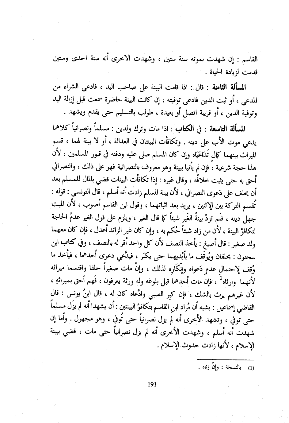 الْقَاسِمِ إِنْ شَهِدَتْ بِمَوْتِهِ سَنَةَ سِتِّينَ وَشَهِدَتِ الْأُخْرَى أَنَّهُ سَنَةَ إِحْدَى وَسِتِّينَ قُدِّمَتْ لِزِيَادَةِ الْحَيَاةِ الْمَسْأَلَةُ الثَّامِنَةُ قَالَ إِذَا قَامَتِ الْبَيِّنَةُ عَلَى صَاحِبِ الْيَدِ فَادَّعَى الشِّرَاءَ مِنَ الْمُدَّعِي أَوْ ثَبَتَ الدَّيْنُ فَادَّعَى تَوَفَّيْتَهُ إِنْ كَانَتِ الْبَيِّنَةُ حَاضِرَةً سُمِعَتْ قَبْلَ إِزَالَةِ الْيَدِ وَتَوْفِيَةِ الدّين اَوْ قريبَة اتَّصل اَوْ بعيدَة طُولِبَ بِالتَّسْلِيمِ حَتَّى يقدم وَيشْهد الْمَسْأَلَةُ التَّاسِعَةُ فِي الْكِتَابِ إِذَا مَاتَ وَتَرَكَ وَلَدَيْنِ مُسَلِمًا وِنَصْرَانِيًّا كِلَاهُمَا يَدَّعِي مَوْتَ الْأَبِ عَلَى دِينِهِ وَتَكَافَأَتِ الْبَيِّنَتَانِ فِي الْعَدَالَةِ أَوْ لَا بَيِّنَةَ لَهُمَا قُسِّمَ الْمِيرَاثُ بَيْنَهُمَا كَمَالٍ تَدَاعَيَاهُ وَإِنْ كَانَ الْمُسْلِمُ صَلَّى عَلَيْهِ وَدَفَنَهُ فِي قُبُورِ الْمُسْلِمِينَ لِأَنَّ هَذَا حُجَّةٌ شَرْعِيَّةٌ فَإِنْ لَمْ يَأْتِيَا بِبَيِّنَةٍ وَهُوَ مَعْرُوفٌ بِالنَّصْرَانِيَّةِ فَهُوَ عَلَى ذَلِكَ وَالنَّصْرَانِيُّ أَحَقُّ بِهِ حَتَّى يثبت خِلَافه وَقَالَ غَيره اذا تكافات الْبَينَات قُضِيَ بِالْمَالِ لِلْمُسْلِمِ بَعْدَ أَنْ يَحْلِفَ عَلَى دَعْوَى النَّصْرَانِيِّ لِأَنَّ بَيِّنَةَ الْمُسْلِمِ زَادَتْ أَنَّهُ أَسْلَمَ قَالَ التُّونُسِيُّ قَوْلُهُ تُقَسَّمُ التَّرِكَةُ بَيْنَ الِاثْنَيْنِ يُرِيدُ بَعْدَ إِثْبَاتِهِمَا وَقَوْلُ ابْنِ الْقَاسِمِ أَصْوَبُ لِأَنَّ الْمَيِّتَ جُهِلَ دِينُهُ فَلَمْ تَزِدْ بَيِّنَة الْغَيْر شَيْئا كَمَا فال الْغَيْرُ وَيَلْزَمُ عَلَى قَوْلِ الْغَيْرِ عَدَمُ الْحَاجَةِ لِتَكَافُؤِ الْبَيِّنَةِ لِأَنَّ مَنْ زَادَ شَيْئًا حَكَمَ بِهِ وَإِنْ كَانَ غَيْرُ الزَّائِدِ أَعْدَلَ فَإِنْ كَانَ مَعَهُمَا وَلَدٌ صَغِيرٌ قَالَ أَصْبَغُ يَأْخُذُ النِّصْفَ لِأَنَّ كُلَّ وَاحِدٍ أَقَرَّ لَهُ بِالنِّصْفِ وَفِي كِتَابِ ابْنِ سَحْنُونٍ يَحْلِفَانِ وَيُوقَفُ مَا بِأَيْدِيهِمَا حَتَّى يَكْبُرَ فَيَدَّعِي دَعْوَى أَحَدِهِمَا فَيَأْخُذُ مَا وَقَفَ لِاحْتِمَالِ عَدَمِ دَعْوَاهُ وَإِنْكَارِهِ لِذَلِكَ وَإِنْ مَاتَ صَغِيرًا حَلَفَا وَاقْتَسَمَا مِيرَاثَهُ لِأَنَّهُمَا وَارِثَاهُ فَإِنْ مَاتَ أَحَدُهُمَا قَبْلَ بُلُوغِهِ وَلَهُ وَرَثَةٌ يُعْرَفُونَ فَهُمْ أَحَقُّ بِمِيرَاثِهِ لِأَنَّ غَيْرَهُمْ يَرِثُ بِالشَّكِّ فَإِنْ كَبِرَ الصَّبِيُّ وَادَّعَاهُ كَانَ لَهُ قَالَ ابْنُ يُونُسَ قَالَ الْقَاضِي إِسْمَاعِيلُ يُشْبِهُ أَنَّ مُرَادَ ابْنِ الْقَاسِمِ بِتَكَافُؤِ الْبَيِّنَتَيْنِ أَنْ يَشْهَدَا أَنَّهُ لَمْ يَزَلْ مُسْلِمًا حَتَّى تُوُفِّيَ وَتَشْهَدَ الْأُخْرَى أَنَّهُ لَمْ يَزَلْ نَصْرَانِيًّا حَتَّى تُوُفِّيَ وَهُوَ مَجْهُولٌ وَأَمَّا إِنْ شَهِدَتْ أَنَّهُ أَسْلَمَ وَشَهِدَتِ الْأُخْرَى أَنَّهُ لَمْ يَزَلْ نَصْرِانِيًا حَتَّى مَاتَ قُضِيَ بِبَيِّنَةِ الْإِسْلَامِ لِأَنَّهَا زَادَتْ حُدُوثَ الْإِسْلَامِ