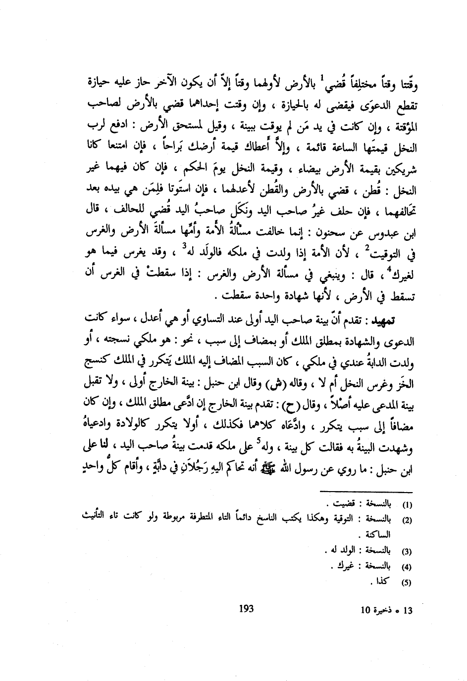 وقتنا وَقْتًا مُخْتَلِفًا قُضِيَ بِالْأَرْضِ لِأَوَّلِهِمَا وَقْتًا إِلَّا أَنْ يَكُونَ الْآخَرُ حَازَ عَلَيْهِ حِيَازَةً تَقْطَعُ الدَّعْوَى فَيُقْضَى لَهُ بِالْحِيَازَةِ وَإِنْ وُقِّتَتْ إِحْدَاهُمَا قضي بالارض لصَاحب المؤقتة وان كَانَت فِي يَد من لم يُوَقت بِبَيِّنَة وَقيل لِمُسْتَحَقِّ الْأَرْضِ ادْفَعْ لِرَبِّ النَّخْلِ قِيمَتَهَا السَّاعَةَ قَائِمَةً وَإِلَّا أَعْطَاكَ قِيمَةَ أَرْضِكَ بَرَاحًا فَإِنِ امْتَنَعَا كَانَا شَرِيكَيْنِ بِقِيمَةِ الْأَرْضِ بَيْضَاءَ وَقِيمَةِ النَّخْلِ يَوْمَ الْحُكْمِ فَإِنْ كَانَ فِيهِمَا غَيْرُ النَّخْلِ قُطْنٌ قُضِيَ بِالْأَرْضِ وَالْقُطْنِ لِأَعْدَلِهِمَا فَإِنِ اسْتَوَتَا فَلِمَنْ هِيَ بِيَدِهِ بَعْدَ تَحَالُفِهِمَا فَإِنْ حَلَفَ غَيْرُ صَاحِبِ الْيَدِ وَنَكَلَ صَاحِبُ الْيَدِ قُضِيَ لِلْحَالِفِ قَالَ ابْنُ عَبْدُوسَ عَنْ سَحْنُونٍ إِنَّمَا خَالَفَتْ مَسْأَلَةُ الْأَمَةِ وَأُمِّهَا مَسْأَلَةَ الْأَرْضِ وَالْغَرْسِ فِي التَّوْقِيتِ لِأَنَّ الْأَمَةَ إِذَا وَلَدَتْ فِي مِلْكِهِ فَالْوَلَدُ لَهُ وَقَدْ يُغْرَسُ فِيمَا هُوَ لغيرك قَالَ وَيَنْبَغِي فِي مَسْأَلَةِ الْأَرْضِ وَالْغَرْسِ إِذَا سَقَطَتْ فِي الْغَرْسِ أَنْ تَسْقُطَ فِي الْأَرْضِ لِأَنَّهَا شَهَادَةٌ وَاحِدَةٌ سَقَطَتْ تَمْهِيدٌ تَقَدَّمَ أَنَّ بَيِّنَةَ صَاحِبِ الْيَدِ أَوْلَى عِنْدَ التَّسَاوِي أَوْ هِيَ أَعْدَلُ سَوَاءٌ كَانَتِ الدَّعْوَى وَالشَّهَادَةُ بِمُطْلَقِ الْمِلْكِ أَوْ بِمُضَافٍ إِلَى سَبَبٍ نَحْوَ هُوَ مِلْكِي نَسَجْتُهُ أَوْ وَلَدَتِ الدَّابَّةُ عِنْدِي فِي ملكي كَانَ السَّبَب الْمُضَاف اليه الْملك يتكررفي الْمِلْكِ كَنَسْجِ الْخَزِّ وَغَرْسِ النَّخْلِ أَمْ لَا وَقَالَهُ ش وَقَالَ ابْنُ حَنْبَلٍ بَيِّنَةُ الْخَارِجِ أَوْلَى وَلَا تُقْبَلُ بَيِّنَةُ الْمُدَّعَى عَلَيْهِ أَصْلًا وَقَالَ ح تُقَدَّمُ بَيِّنَةُ الْخَارِجِ إِنِ ادَّعَى مُطْلَقَ الْمِلْكِ وَإِنْ كَانَ مُضَافًا إِلَى سَبَبٍ يتَكَرَّر وادعاه كِلَاهُمَا فَكَذَلِك اولا يَتَكَرَّرُ كَالْوِلَادَةِ وَادَّعَيَاهُ وَشَهِدَتِ الْبَيِّنَةُ بِهِ فَقَالَتْ كل بَيِّنَة وَله على ملكه قدمت بَيِّنَة صَاحِبَ الْيَدِ لَنَا عَلَى ابْنِ حَنْبَلٍ مَا رُوِيَ عَنْ رَسُولِ اللَّهِ - صَلَّى اللَّهُ عَلَيْهِ وَسَلَّم َ - أَنَّهُ تَحَاكَمَ إِلَيْهِ رَجُلَانِ فِي دَابَّةٍ وَأَقَامَ كل وَأحد