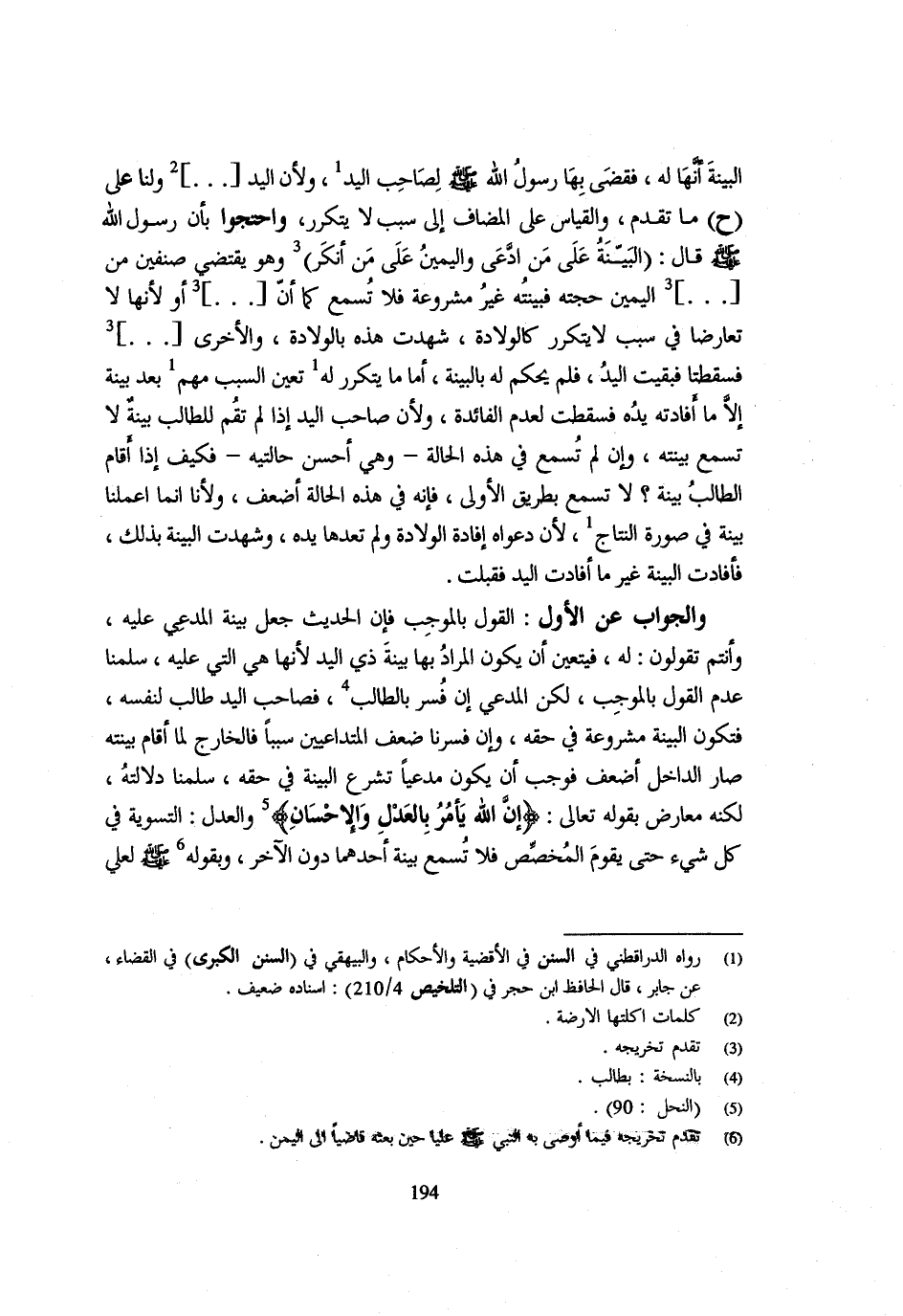 الْبَيِّنَةَ أَنَّهَا لَهُ فَقَضَى بِهَا رَسُولُ اللَّهِ - صَلَّى اللَّهُ عَلَيْهِ وَسَلَّم َ - لصَاحب الْيَد وَلِأَن الْيَد وَلَنَا عَلَى ح مَا تَقَدَّمَ وَالْقِيَاسُ عَلَى المضال إِلَى سَبَبٍ لَا يَتَكَرَّرُ وَاحْتَجُّوا بِأَنَّ رَسُولَ اللَّهِ - صَلَّى اللَّهُ عَلَيْهِ وَسَلَّم َ - قَالَ الْبَيِّنَةَ عَلَى مَنِ ادَّعَى وَالْيَمِينَ عَلَى مَنْ انكر وَهُوَ يَقْتَضِي صنفين من الْيَمِينُ حُجَّتُهُ فَبَيِّنَتُهُ غَيْرُ مَشْرُوعَةٍ فَلَا تُسْمَعُ كَمَا ان اَوْ لِأَنَّهَا لَا تَعَارَضَا فِي سَبَبٍ لَا يَتَكَرَّرُ كَالْوِلَادَةِ شَهِدَتْ هَذِه بِالْولادَةِ والآخرى فَسَقَطَتَا فَبَقِيَتِ الْيَدُ فَلَمْ يُحْكَمْ لَهُ بِالْبَيِّنَةِ اما مَا يتكررله تعين السَّبَب مُهِمّ بعد بَيِّنَة إِلَّا مَا أَفَادَتْهُ يَدُهُ فَسَقَطَتْ لِعَدَمِ الْفَائِدَةِ ولان صَاحب الْيَد اذا لم تقم للطَّالِب بَيِّنَةً لَا تُسْمَعُ بَيِّنَتُهُ وَإِنْ لَمْ تُسْمَعْ فِي هَذِهِ الْحَالَةِ وَهِيَ أَحْسَنُ حَالَتَيْهِ فَكَيْفَ إِذَا أَقَامَ الطَّالِبُ بَيِّنَةً لَا تُسْمَعُ بِطَرِيقِ الْأَوْلَى فَإِنَّهُ فِي هَذِهِ الْحَالَةِ أَضْعَفُ وَلِأَنَّا انما اعملنا بَيِّنَة فِي صُورَةِ النِّتَاجِ لِأَنَّ دَعْوَاهُ إِفَادَةُ الْوِلَادَةِ وَلم تعدها يَدُهُ وَشَهِدَتِ الْبَيِّنَةُ بِذَلِكَ فَأَفَادَتِ الْبَيِّنَةُ غَيْرَ مَا أَفَادَتِ الْيَدُ فَقُبِلَتْ وَالْجَوَابُ عَنِ الْأَوَّلِ الْقَوْلُ بِالْمُوجَبِ فَإِنَّ الْحَدِيثَ جَعَلَ بَيِّنَةَ الْمُدَّعَى عَلَيْهِ وانتم تَقولُونَ لَهُ فَيَتَعَيَّنُ أَنْ يَكُونَ الْمُرَادُ بِهَا بَيِّنَةَ ذِي الْيَدِ لِأَنَّهَا هِيَ الَّتِي عَلَيْهِ سَلَّمْنَا عَدَمَ الْقَوْلِ بِالْمُوجِبِ لَكِنَّ الْمُدَّعِيَ إِنْ فُسِّرَ بِالطَّالِبِ فَصَاحب الْيَد طَالب لِنَفْسِهِ فَتَكُونُ الْبَيِّنَةُ مَشْرُوعَةً فِي حَقِّهِ وَإِنْ فسرنا ضعف الْمُتَدَاعِيَيْنِ سَبَبًا فَالْخَارِجُ لَمَّا أَقَامَ بَيِّنَتَهُ صَارَ الدَّاخِلُ أَضْعَفَ فَوَجَبَ أَنْ يَكُونَ مُدَّعِيًا تُشْرَعُ الْبَيِّنَةُ فِي حَقِّهِ سَلَّمْنَا دَلَالَتَهُ لَكِنَّهُ مُعَارَضٌ بقوله تَعَالَى {إِن الله يَأْمر بِالْعَدْلِ وَالْإِحْسَان} وَالْعَدْلُ التَّسْوِيَةُ فِي كُلِّ شَيْءٍ حَتَّى يَقُومَ الْمُخَصَّصُ فَلَا تُسْمَعُ بَيِّنَةُ أَحَدِهِمَا دُونَ الْآخَرِ وَبِقَوْلِهِ - صَلَّى اللَّهُ عَلَيْهِ وَسَلَّم َ - لعَلي
