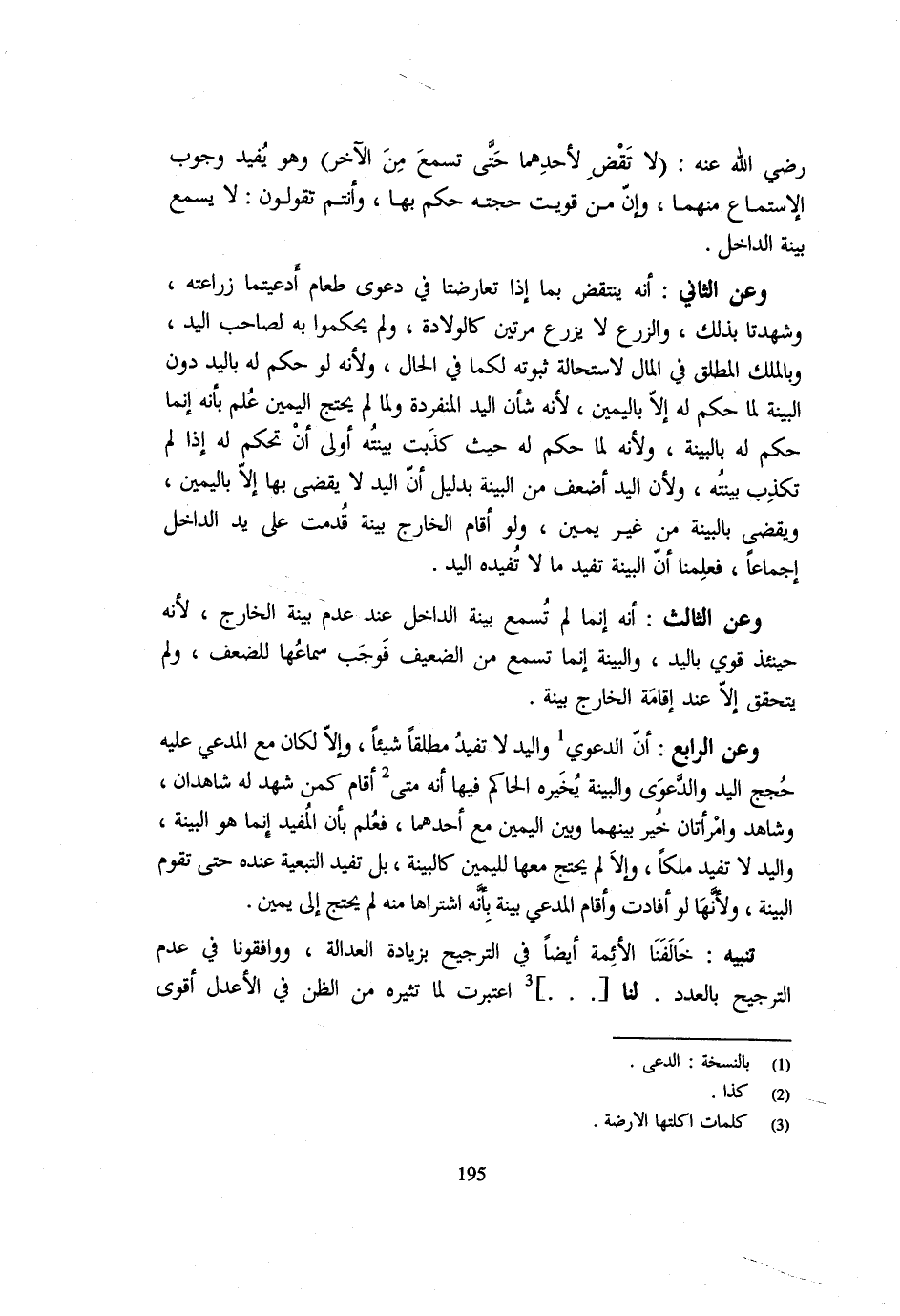 رَضِيَ اللَّهُ عَنْهُ لَا تَقْضِ لِأَحَدِهِمَا حَتَّى تَسْمَعَ مِنَ الْآخَرِ وَهُوَ يُفِيدُ وُجُوبَ الِاسْتِمَاعِ مِنْهُمَا وَإِنَّ مَنْ قَوِيَتْ حُجَّتُهُ حُكِمَ بِهَا وانتم تَقولُونَ لَا يسمع بَيِّنَةُ الدَّاخِلِ وَعَنِ الثَّانِي أَنَّهُ يُنْتَقَضُ بِمَا اذا تَعَارَضَتَا فِي دَعْوَى طَعَام ادعيتهما زراعته وشهدتا بِذَلِكَ وَالزَّرْعُ لَا يُزْرَعُ مَرَّتَيْنِ كَالْوِلَادَةِ وَلَمْ يَحْكُمُوا بِهِ لِصَاحِبِ الْيَدِ وَبِالْمِلْكِ الْمُطْلَقِ فِي المَال لِاسْتِحَالَة ثُبُوته لَكمَا فِي الْحَالِ وَلِأَنَّهُ لَوْ حَكَمَ لَهُ بِالْيَدِ دُونَ الْبَيِّنَةِ لَمَا حَكَمَ لَهُ إِلَّا بِالْيَمِينِ لِأَنَّهُ شَأْنُ الْيَدِ الْمُنْفَرِدَةِ وَلَمَّا لَمْ يَحْتَجِ الْيَمِينِ عُلِمَ بِأَنَّهُ إِنَّمَا حَكَمَ لَهُ بِالْبَيِّنَةِ وَلِأَنَّهُ لَمَّا حَكَمَ لَهُ حَيْثُ كَذَبَتْ بَيِّنَتُهُ اولى ان تحكم لَهُ إِذَا لَمْ تُكَذَّبْ بَيِّنَتُهُ وَلِأَنَّ الْيَدَ أَضْعَفُ مِنَ الْبَيِّنَةِ بِدَلِيلِ أَنَّ الْيَدَ لَا يُقْضَى بِهَا إِلَّا بِالْيَمِينِ وَيُقْضَى بِالْبَيِّنَةِ مِنْ غَيْرِ يَمِينٍ وَلَوْ أَقَامَ الْخَارِجُ بَيِّنَةً قُدِّمَتْ عَلَى يَدِ الدَّاخِلِ إِجْمَاعًا فَعَلِمْنَا أَنَّ الْبَيِّنَةَ تُفِيدُ مَا لَا تُفِيدُهُ الْيَدُ وَعَنِ الثَّالِثِ أَنَّهُ إِنَّمَا لَمْ تُسْمَعْ بَيِّنَةُ الدَّاخِلِ عِنْدَ عَدَمِ بَيِّنَة الْخَارِج لِأَنَّهُ حِينَئِذٍ قوي الْيَد وَالْبَيِّنَةُ إِنَّمَا تُسْمَعُ مِنَ الضَّعِيفِ فَوَجَبَ سَمَاعُهَا لِلضَّعْفِ وَلَمْ يَتَحَقَّقْ إِلَّا عِنْدَ إِقَامَةِ الْخَارِجِ بَيِّنَةً وَعَنِ الرَّابِعِ أَنَّ الدَّعْوَى وَالْيَدَ لَا تفِيد مُطلقًا شَيْئا والا لَكَانَ مَعَ الْمُدَّعِي عَلَيْهِ حجج الْيَد وَالدَّعْوَى وَالْبَيِّنَة يخيره الْحَاكِم فِيهَا أَنه مَتى أَقَامَ كَمَنْ شَهِدَ لَهُ شَاهِدَانِ وَشَاهِدٌ وَامْرَأَتَانِ خُيِّرَ بَيْنَهُمَا وَبَيْنَ الْيَمِينِ مَعَ أَحَدِهِمَا فَعُلِمَ بِأَنَّ الْمُفِيدَ إِنَّمَا هُوَ الْبَيِّنَةُ وَالْيَدُ لَا تُفِيدُ مِلْكًا وَإِلَّا لَمْ يَحْتَجْ مَعَهَا لِلْيَمِينِ كالبينة بل تفِيد التّبعِيَّة عِنْدَهُ حَتَّى تَقُومَ الْبَيِّنَةُ وَلِأَنَّهَا لَوْ أَفَادَتْ وَأَقَامَ الْمُدَّعِي بَيِّنَةً بِأَنَّهُ اشْتَرَاهَا مِنْهُ لَمْ يَحْتَجْ إِلَى يَمِينٍ تَنْبِيهٌ خَالَفَنَا الْأَئِمَّةُ أَيْضًا فِي الترج 4 يح بِزِيَادَةِ الْعَدَالَةِ وَوَافَقُونَا فِي عَدَمِ التَّرْجِيحِ بِالْعَدَدِ لنا اعْتبرت لما تثيره من الظَّن فِي الْأَعْدَلِ أَقْوَى