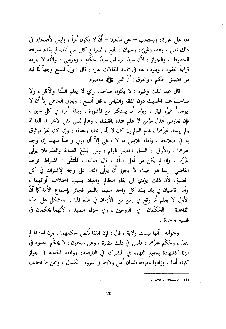 مِنْهُ على عَورَة وَيسْتَحب على مَذْهَبنَا ان لَا يَكُونَ أُمِّيًّا وَلَيْسَ لِأَصْحَابِنَا فِي ذَلِكَ نَصٌّ وَعِنْدَ ش وَجْهَانِ الْمَنْعُ لِضَيَاعِ كَثِيرٍ مِنَ الْمَصَالِحِ بِعَدَمِ مَعْرِفَتِهِ الْخُطُوطَ وَالْجَوَازُ لِأَنَّ سَيِّدَ الْمُرْسَلِينَ سَيِّدُ الْحُكَّامِ وَهُوَ أُمِّيٌّ وَلِأَنَّهُ لَا يَلْزَمُهُ قِرَاءَةُ الْعُقُودِ وَيَنُوبُ عَنْهُ فِي تَقْيِيدِ الْمَقَالَاتِ غَيْرُهُ قَالَ وَإِنَّ لِلْمَنْعِ وَجْهًا لِمَا فِيهِ مِنْ تَضْيِيقِ الْحُكْمِ وَالْفَرْقُ أَنَّ النَّبِيَّ - صَلَّى اللَّهُ عَلَيْهِ وَسَلَّم َ - مَعْصُومٌ قَالَ عَبْدُ الْمَلِكِ وَغَيْرُهُ لَا يَكُونُ صَاحِبُ رَأْيٍ لَا يَعْلَمُ السُّنَّةَ وَالْآثَارَ وَلَا صَاحِبُ عِلْمِ الْحَدِيثِ دُونَ الْفِقْهِ وَالْقِيَاسِ قَالَ اصبغ ويعزل الْجَاهِل الا ان لَا يُوجد غَيره فَيقر وَيُؤمر ان يستكثر فِي الْمَشُورَةِ وَيُنَفَّذُ أَمْرُهُ فِي كُلِّ حِينٍ فَإِنْ تَعَارَضَ عَدْلٌ مُؤْمِنٌ لَا عِلْمَ عِنْدَهُ بِالْقَضَاءِ وَعَالِمٌ لَيْسَ مِثْلَ الْآخَرِ فِي الْعَدَالَةِ وَلَمْ يُوجَدْ غَيْرُهُمَا قَدَّمَ الْعَالِمَ إِنْ كَانَ لَا بَأْسَ بِحَالِهِ وَعَفَافِهِ وَإِنْ كَانَ غَيْرَ مَوْثُوقٍ بِهِ فِي صَلَاحِهِ وَلَعَلَّهُ يُلَابِسُ مَا لَا يَنْبَغِي إِلَّا أَنْ يُوَلِّيَ وَاحِدًا مِنْهُمَا إِنْ وَجَدَ غَيْرَهُمَا وَالْأَوْلَى الْعَدْلُ الْقَصِيرُ الْعِلْمِ وَمَنْ جَمَعَ الْعَدَالَةَ وَالْعِلْمَ فَلَا يُوَلَّى غَيْرُهُ وَإِنْ لَمْ يَكُنْ مِنْ أَهْلِ الْبَلَدِ قَالَ صَاحِبُ الْمُنْتَقَى اشْتِرَاطُ تَوَحُّدِ الْقَاضِي إِنَّمَا هُوَ حَيْثُ لَا يَجُوزُ أَنْ يُوَلَّى اثْنَانِ عَلَى وَجْهِ الِاشْتِرَاكِ فِي كُلِّ قَضِيَّةٍ لِأَنَّ ذَلِكَ يُؤَدِّي إِلَى بَقَاءِ التَّظَالُمِ وَالْعِنَادِ بِسَبَبِ اخْتِلَافِ آرَائِهِمَا وَأَمَّا قَاضِيَانِ فِي بَلَدٍ يُنَفِّذُ كُلُّ وَاحِدٍ مِنْهُمَا بِالنّظرِ فَجَاز بِإِجْمَاعِ الْأُمَّةِ كَمَا أَنَّ الْأَوَّلَ لَا يُعْلَمُ أَنَّهُ وَقَعَ فِي زَمَنٍ مِنَ الْأَزْمَانِ فِي هَذِهِ الْمِلَّةِ وَيُشْكِلُ عَلَى هَذِهِ الْقَاعِدَةِ الْحَكَمَانِ فِي الزَّوْجَيْنِ وَفِي جَزَاءِ الصَّيْدِ لِأَنَّهُمَا يَحْكُمَانِ فِي قَضِيَّةٍ وَاحِدَةٍ وَجَوَابُهُ أَنَّهَا لَيْسَتْ وِلَايَةً قَالَ فَإِن اتفقَا نقض حُكْمُهُمَا وَإِنِ اخْتَلَفَا لَمْ يُنَفَّذْ وَحَكَمَ غَيْرُهُمَا فَلَيْسَ فِي ذَلِكَ مَضَرَّةٌ وَعَنْ سَحْنُونٍ لَا يَحْكُمُ الْمَحْدُودُ فِي الزِّنَا كَشَهَادَةٍ بِجَامِعِ التُّهْمَةِ فِي الْمُشَارَكَةِ فِي النَّقِيصَةِ وَوَافَقَنَا الْحَنَابِلَةُ فِي جَوَازِ كَوْنِهِ أُمِّيًّا وَزَادُوا مَعْرِفَتَهُ بِلِسَانِ أَهْلِ وِلَايَتِهِ فِي شُرُوطِ الْكَمَالِ وَنَحْنُ مَا نُخَالِفُ