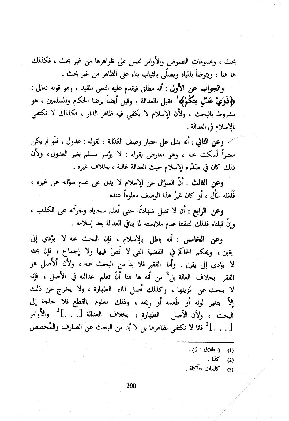 بَحْثٍ وَعُمُومَاتُ النُّصُوصِ وَالْأَوَامِرِ تُحْمَلُ عَلَى ظَوَاهِرِهَا من غير بحث فَكَذَلِك هَاهُنَا وَيَتَوَضَّأُ بِالْمِيَاهِ وَيُصَلِّي بِالثِّيَابِ بِنَاءً عَلَى الظَّاهِرِ مِنْ غَيْرِ بَحْثٍ وَالْجَوَابُ عَنِ الْأَوَّلِ أَنَّهُ مُطْلَقٌ فَيُقَدَّمُ عَلَيْهِ النَّصُّ الْمُقَيِّدُ وَهُوَ قَوْله تَعَالَى {ذَوي عدل مِنْكُم} فَقيل بِالْعَدَالَةِ وَقيل ايضا بِرِضا الْحُكَّام وَالْمُسْلِمين هُوَ مَشْرُوطٌ بِالْبَحْثِ وَلِأَنَّ الْإِسْلَامَ لَا يَكْفِي فِيهِ ظَاهِرُ الدَّارِ فَكَذَلِكَ لَا نَكْتَفِي بِالْإِسْلَامِ فِي الْعَدَالَةِ وَعَنِ الثَّانِي أَنَّهُ يَدُلُّ عَلَى اعْتِبَارِ وَصْفِ الْعَدَالَةِ لِقَوْلِهِ عُدُولٌ فَلَوْ لَمْ يَكُنْ مُعْتَبَرًا لَسَكَتَ عَنْهُ وَهُوَ مُعَارَضٌ بِقَوْلِهِ لَا يؤسر مُسْلِمٌ بِغَيْرِ الْعُدُولِ وَلِأَنَّ ذَلِكَ كَانَ فِي صَدره الْإِسْلَامِ حَيْثُ الْعَدَالَةُ غَالِبَةٌ بِخِلَافِ غَيْرِهِ وَعَنِ الثَّالِثِ أَنَّ السُّؤَالَ عَنِ الْإِسْلَامِ لَا يَدُلُّ عَلَى عَدَمِ سُؤَالِهِ عَنْ غَيْرِهِ فَلَعَلَّهُ سَأَلَ أَوْ كَانَ غَيْرُ هَذَا الْوَصْفِ مَعْلُومًا عِنْدَهُ وَعَن الرَّابِع ان لاتقبل شَهَادَتُهُ حَتَّى تُعْلَمَ سَجَايَاهُ وَجُرْأَتُهُ عَلَى الْكَذِبِ وَإِنْ قَبِلْنَاهُ فَذَلِكَ لِتَيَقُّنِنَا عَدَمَ مُلَابَسَتِهِ لِمَا يُنَافِي الْعَدَالَةَ بَعْدَ إِسْلَامِهِ وَعَنِ الْخَامِسِ أَنَّهُ بَاطِلٌ بِالْإِسْلَامِ فَإِنَّ الْبَحْثَ عَنْهُ لَا يُؤَدِّي إِلَى يَقِينٍ وَيَحْكُمُ الْحَاكِمُ فِي الْقَضِيَّةِ الَّتِي لَا نَصَّ فِيهَا وَلَا إِجْمَاعَ فَإِنَّ بَحْثَهُ لَا يُؤَدِّي إِلَى يَقِينٍ وَأَمَّا الْفَقِيرُ فَلَا بُدَّ مِنَ الْبَحْثِ عَنْهُ وَلِأَنَّ الْأَصْلَ هُوَ الْفقر بِخِلَاف العالة بل من أَنه هَاهُنَا أَنْ تُعْلَمَ عَدَالَتُهُ فِي الْأَصْلِ فَإِنَّهُ لَا يُبْحَثُ عَنْ مُزِيلِهَا وَكَذَلِكَ أَصْلُ الْمَاءِ الطَّهَارَةُ وَلَا يَخْرُجُ عَنْ ذَلِكَ إِلَّا بِتَغَيُّرِ لَوْنِهِ أَوْ طَعْمِهِ أَوْ رِيحِهِ وَذَلِكَ مَعْلُومٌ بِالْقَطْعِ فَلَا حَاجَةَ إِلَى الْبَحْثِ وَلِأَنَّ الْأَصْلَ الطَّهَارَةُ بِخِلَاف الْعَدَالَة والاوأمر فَإنَّا لَا نكتفي بظاهرها بل لابد من الْبَحْث عَن الصَّارِف والمخصص