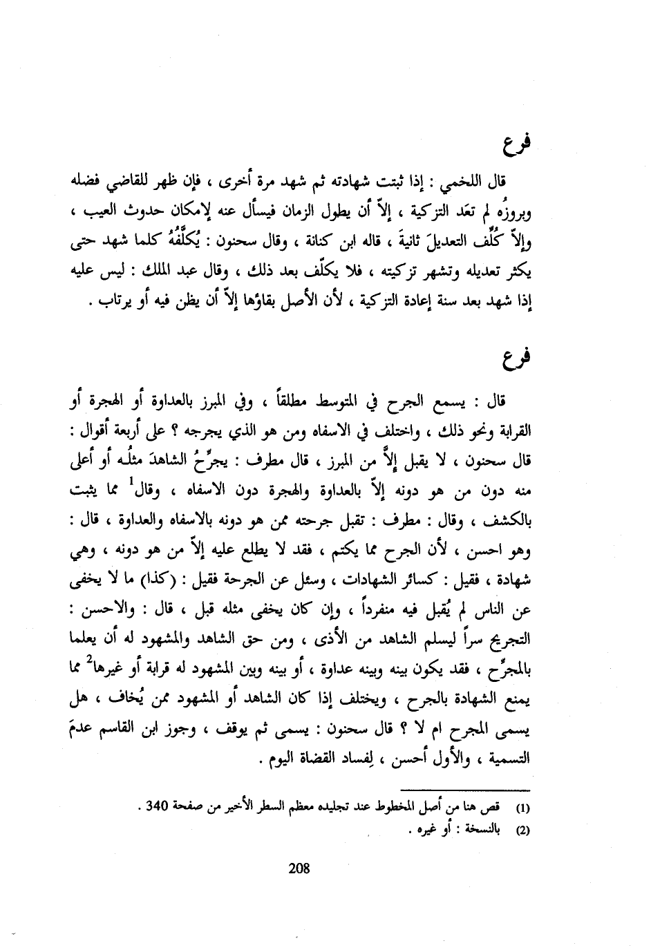 قَالَ يُسْمَعُ الْجَرْحُ فِي الْمُتَوَسِّطِ مُطْلَقًا وَفِي الْمُبْرِزِ بِالْعَدَاوَةِ أَوِ الْهِجْرَةِ أَوِ الْقَرَابَةِ وَنَحْوِ ذَلِكَ وَاخْتُلِفَ فِي الْإِسْفَاهِ وَمَنْ هُوَ الَّذِي يُجَرِّحُهُ عَلَى أَرْبَعَةِ أَقْوَالٍ قَالَ سَحْنُونٌ لَا يُقْبَلُ إِلَّا مِنَ الْمُبْرِزِ قَالَ مُطَرِّفٌ يُجَرِّحُ الشَّاهِدَ مِثْلُهُ أَوْ أَعْلَى مِنْهُ دُونَ مَنْ هُوَ دُونَهُ إِلَّا بِالْعَدَاوَةِ وَالْهِجْرَةِ دُونَ الْإِسْفَاهِ وَقَالَ مِمَّا يَثْبُتُ بِالْكَشْفِ وَقَالَ مُطَرِّفٌ تُقْبَلُ جُرْحَتُهُ مِمَّنْ هُوَ دونه بالاسفاه والعداوة قَالَ وَهُوَ أَحْسَنُ لِأَنَّ الْجَرْحَ مِمَّا يُكْتَمُ فقد لَا يطلع عَلَيْهِ الا من هودونه وَهِي شَهَادَة فَقيل كَسَائِر الشَّهَادَات وَسُئِلَ عَن الجرحة فَقيل كَذَا مَا لَا يَخْفَى عَنِ النَّاسِ لَمْ يُقْبَلْ فِيهِ مُنْفَرِدًا وَإِنْ كَانَ يَخْفَى مِثْلُهُ قُبِلَ قَالَ وَالْأَحْسَنُ التَّجْرِيحُ سِرًا لِيَسْلَمَ الشَّاهِدُ مِنَ الْأَذَى وَمِنْ حَقِّ الشَّاهِدِ وَالْمَشْهُودِ لَهُ أَنْ يَعْلَمَا بِالْمُجَرِّحِ فَقَدْ يَكُونُ بَيْنَهُ وَبَيْنَهُ عَدَاوَةٌ أَوْ بَيْنَهُ وَبَيْنَ الْمَشْهُودِ لَهُ قَرَابَةٌ أَوْ غَيْرُهَا مِمَّا يَمْنَعُ الشَّهَادَةَ بِالْجَرْحِ وَيَخْتَلِفُ إِذَا كَانَ الشَّاهِدُ أَوِ الْمَشْهُودُ مِمَّنْ يُخَافُ هَلْ يُسَمَّى الْمُجَرِّحُ أَمْ لَا قَالَ سَحْنُونٌ يُسَمَّى ثمَّ يُوقف وَجَوَّزَ ابْنُ الْقَاسِمِ عَدَمَ التَّسْمِيَةِ وَالْأَوَّلُ أَحْسَنُ لِفَسَادِ الْقُضَاةِ الْيَوْمَ