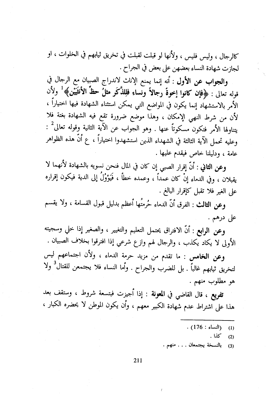 كالرجال وَلَيْسَ فَلَيْسَ وَلِأَنَّهَا لَوْ قُبِلَتْ لَقُبِلَتْ فِي تَخْرِيقِ ثِيَابِهِمْ فِي الْخَلَوَاتِ أَوْ لَجَازَتْ شَهَادَةُ النِّسَاءِ بِعْضِهِنَّ عَلَى بَعْضٍ فِي الْجِرَاحِ وَالْجَوَابُ عَنِ الْأَوَّلِ أَنَّهُ إِنَّمَا يُمْنَعُ الْإِنَاثُ لِانْدِرَاجِ الصِّبْيَانِ مَعَ الرِّجَال فِي قَوْله تَعَالَى {فَإِن كَانُوا إِخْوَةً رِجَالا وَنِسَاءً فَلِلذَّكَرِ مِثْلُ حَظِّ الانثيين} وَلِأَنَّ الْأَمْرَ بِالِاسْتِشْهَادِ إِنَّمَا يَكُونُ فِي الْمَوَاضِعِ الَّتِي يُمْكِنُ اسْتِثْنَاءُ الشَّهَادَةِ فِيهَا اخْتِيَارًا لِأَنَّ مِنْ شَرْطِ النَّهْيِ الْإِمْكَانَ وَهَذَا مَوْضِعُ ضَرُورَةٍ تَقَعُ فِيهِ الشَّهَادَةُ بَغْتَةً فَلَا يَتَنَاوَلُهَا الْأَمْرُ فَتَكُونُ مَسْكُوتًا عَنْهَا وَهُوَ الْجَوَابُ عَنِ الْآيَةِ الثَّانِيَة وَقَوله تَعَالَى وَعَلَيْهِ تُحْمَلُ الْآيَةُ الثَّالِثَةُ فِي الشُّهَدَاءِ الَّذِينَ اسْتشْهدُوا اخْتِيَارا ع ان هَذِه الظَّوَاهِر عَامَّة وَدَلِيلنَا حَاص فَيُقَدَّمُ عَلَيْهَا وَعَنِ الثَّانِي أَنَّ إِقْرَارَ الصَّبِيِّ ان كَانَ فِي المَال فَنحْن نسويه بِالشَّهَادَةِ لِأَنَّهُمَا لَا يُقْبَلَانِ وَفِي الدِّمَاءِ إِنْ كَانَ عَمْدًا وَعَمْدُهُ خَطَأٌ فَيَؤُولُ إِلَى الدِّيَةِ فَيَكُونُ إِقْرَارُهُ عَلَى الْغَيْرِ فَلَا تُقْبَلُ كَإِقْرَارِ الْبَالِغِ وَعَنِ الثَّالِثِ الْفَرْقُ أَنَّ الدِّمَاءَ حُرْمَتُهَا أَعْظَمُ بِدَلِيلِ قَبُولِ الْقَسَامَةِ وَلَا يُقْسَمُ عَلَى دِرْهَمٍ وَعَنِ الرَّابِعِ أَنَّ الِافْتِرَاقَ يَحْتَمِلُ التَّعْلِيمَ وَالتَّغْيِيرَ وَالصَّغِيرُ إِذَا خُلِّيَ وَسَجِيَّتَهُ الْأُولَى لَا يَكَادُ يَكْذِبُ وَالرِّجَالُ لَهُمْ وَازِعٌ شَرْعِيٌّ إِذَا افْتَرَقُوا بِخِلَافِ الصِّبْيَانِ وَعَنِ الْخَامِسِ مَا تَقَدَّمَ مِنْ مَزِيدِ حُرْمَةِ الدِّمَاءِ وَلِأَنَّ اجْتِمَاعَهُمْ لَيْسَ لِتَخْرِيقِ ثِيَابِهِمْ غَالِبًا بَلْ لِلضَّرْبِ وَالْجِرَاحِ وَأَمَّا النِّسَاءُ فَلَا يَجْتَمِعْنَ لِلْقِتَالِ وَلَا هُوَ مَطْلُوبٌ مِنْهُم تَفْرِيعٌ قَالَ الْقَاضِي فِي الْمَعُونَةِ إِذَا أُجِيزَتْ فَبِتِسْعَةِ شُرُوطٍ وَسَتَقِفُ بَعْدَ هَذَا عَلَى اشْتِرَاطِ عَدَمِ شَهَادَةِ الْكَبِيرِ مَعَهُمْ وَأَنْ يَكُونَ الْمَوْطِنُ لَا يَحْضُرُهُ الْكِبَارُ