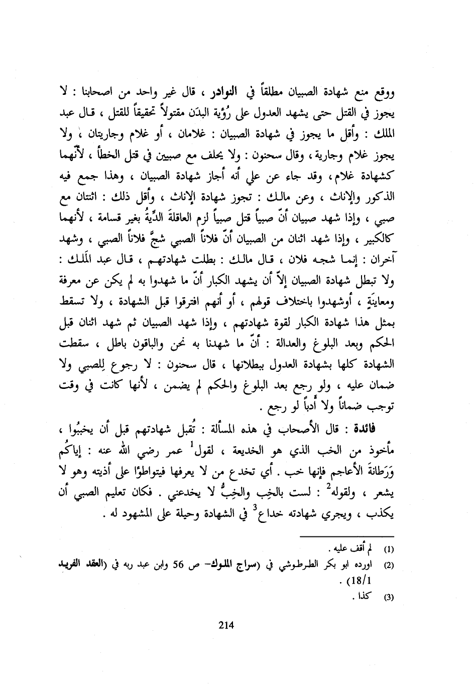 وَوَقَعَ مَنْعُ شَهَادَةِ الصِّبْيَانِ مُطْلَقًا فِي النَّوَادِرِ قَالَ غَيْرُ وَاحِدٍ مِنْ أَصْحَابِنَا لَا يَجُوزُ فِي الْقَتْلِ حَتَّى يَشْهَدَ الْعُدُولُ عَلَى رُؤْيَةِ الْبَدَنِ مَقْتُولًا تَحْقِيقًا لِلْقَتْلِ قَالَ عَبْدُ الْمَلِكِ وَأَقَلُّ مَا يَجُوزُ فِي شَهَادَةِ الصِّبْيَانِ غُلَامَانِ أَوْ غُلَامٌ وَجَارِيَتَانِ وَلَا يَجُوزُ غُلَامٌ وَجَارِيَةٌ وَقَالَ سَحْنُونٌ وَلَا يَحْلِفُ مَعَ صَبِيَّيْنِ فِي قَتْلِ الْخَطَأِ لِأَنَّهُمَا كَشَهَادَةِ غُلَامٍ وَقَدْ جَاءَ عَنْ عَلِيٍّ أَنَّهُ أَجَازَ شَهَادَةَ الصِّبْيَانِ وَهَذَا جَمْعٌ فِيهِ الذُّكُورُ وَالْإِنَاثُ وَعَنْ مَالِكٍ تَجُوزُ شَهَادَة الاناث واقل ذَلِك اثْنَان مَعَ صَبِيٍّ وَإِذَا شَهِدَ صِبْيَانٌ أَنَّ صَبِيًّا قَتَلَ صَبِيًّا لَزِمَ الْعَاقِلَةَ الدِّيَةُ بِغَيْرِ قَسَامَةٍ لِأَنَّهُمَا كَالْكَبِيرِ وَإِذَا شَهِدَ اثْنَانِ مِنَ الصِّبْيَانِ أَنَّ فُلَانًا الصَّبِيَّ شَجَّ فُلَانًا الصَّبِيَّ وَشَهِدَ آخَرَانِ إِنَّمَا شَجَّهُ فُلَانٌ قَالَ مَالِكٌ بَطَلَتْ شَهَادَتُهُمْ قَالَ عَبْدُ الْمَلِكِ وَلَا تَبْطُلُ شَهَادَةُ الصِّبْيَانِ إِلَّا أَنْ يَشْهَدَ الْكِبَارُ أَنَّ مَا شَهِدُوا بِهِ لَمْ يَكُنْ عَنْ مَعْرِفَةٍ وَمُعَايَنَةٍ أَوْ شَهِدُوا بِاخْتِلَافِ قَوْلِهِمْ أَوْ أَنَّهُمُ افْتَرَقُوا قَبْلَ الشَّهَادَةِ وَلَا تَسْقُطُ بِمِثْلِ هَذَا شَهَادَةُ الْكِبَارِ لِقُوَّةِ شَهَادَتِهِمْ وَإِذَا شَهِدَ الصِّبْيَانُ ثُمَّ شَهِدَ اثْنَانِ قَبْلَ الْحُكْمِ وَبَعْدَ الْبُلُوغِ وَالْعَدَالَةِ أَنَّ مَا شَهِدْنَا بِهِ نَحْنُ وَالْبَاقُونَ بَاطِلٌ سَقَطَتِ الشَّهَادَةُ كُلُّهَا بِشَهَادَةِ الْعُدُولِ بِبُطْلَانِهَا قَالَ سَحْنُونٌ لَا رُجُوعَ لِلصَّبِيِّ وَلَا ضَمَانَ عَلَيْهِ وَلَوْ رَجَعَ بَعْدَ الْبُلُوغِ وَالْحُكْمِ لَمْ يَضْمَنْ لِأَنَّهَا كَانَت فِي وَقت تُوجِبُ ضَمَانًا وَلَا أَدَبًا لَوْ رَجَعَ فَائِدَةٌ قَالَ الْأَصْحَابُ فِي هَذِهِ الْمَسْأَلَةِ تُقْبَلُ شَهَادَتُهُمْ قَبْلَ أَنْ يَخْبُبُوا مَأْخُوذٌ مِنَ الْخِبِّ الَّذِي هُوَ الْخَدِيعَةُ لِقَوْلِ عُمَرَ رَضِيَ اللَّهُ عَنْهُ إِيَّاكُمْ وَرَطَانَةَ الْأَعَاجِمِ فَإِنَّهَا خِبٌّ أَيْ تَخْدَعُ من لَا يعرفهَا فيتواطؤا عَلَى أَذِيَّتِهِ وَهُوَ لَا يَشْعُرُ وَلِقَوْلِهِ لَسْتُ بِالْخِبِّ وَالْخِبُّ لَا يَخْدَعُنِي فَكَانَ تَعْلِيمُ الصَّبِيِّ أَنْ يَكْذِبَ وَيُجْرِيَ شَهَادَتَهُ خِدَاعٌ فِي الشَّهَادَةِ وحيلة على الْمَشْهُود لَهُ