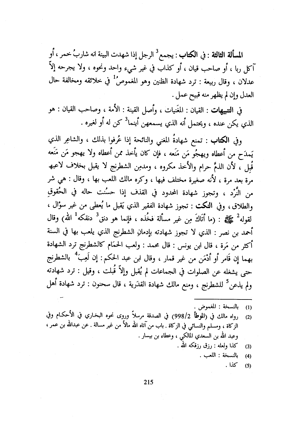 المسالة الثَّالِثَة فِي الْكتاب يجمع الرَّجُلُ إِذَا شَهِدَتِ الْبَيِّنَةُ أَنَّهُ شَارِبُ خَمْرٍ أَوْ آكِلُ رِبًا أَوْ صَاحِبُ قِيَانٍ أَوْ كَذَّابٌ فِي غَيْرِ شَيْءٍ وَاحِدٍ وَنَحْوُهُ وَلَا يَجْرَحُهُ إِلَّا عَدْلَانِ وَقَالَ رَبِيعَةُ تُرَدُّ شَهَادَةُ الظَّنِينِ وَهُوَ الْمَغْمُوصُ فِي خَلَائِقِهِ وَمُخَالَفَةِ حَالِ الْعَدْلِ وَإِنْ لَمْ يَظْهَرْ مِنْهُ قَبِيحُ عَمَلٍ فِي التَّنْبِيهَاتِ الْقِيَانُ الْمُغَنِّيَاتُ وَأَصْلُ الْقَيْنَةِ الْأَمَةُ وَصَاحِبُ الْقِيَانِ هُوَ الَّذِي يَكُنَّ عِنْدَهُ وَيُحْتَمَلُ أَنَّهُ الَّذِي يَسْمَعُهُنَّ أَيْنَمَا كُنَّ لَهُ أَوْ لِغَيْرِهِ وَفِي الْكِتَابِ تُمْنَعُ شَهَادَةُ الْمُغَنِّي وَالنَّائِحَةِ إِذَا عُرِفُوا بِذَلِكَ وَالشَّاعِرِ الَّذِي يَمْدَحُ مَنْ أَعْطَاهُ وَيَهْجُو مَنْ مَنَعَهُ فَإِنْ كَانَ يَأْخُذُ مِمَّن اعطاه وَلَا يهجومن مَنَعَهُ قُبِلَ لِأَنَّ الذَّمَّ حَرَامٌ وَالْأَخْذَ مَكْرُوهٌ وَمُدْمِنُ الشِّطْرَنْجِ لَا يُقْبَلُ بِخِلَافِ لَاعِبِهَا مَرَّةً بعد مرّة لِأَنَّهُ صَغِيرَةٌ مُخْتَلَفٌ فِيهَا وَكَرِهَ مَالِكٌ اللَّعِبَ بِهَا وَقَالَ هِيَ شَرٌّ مِنَ النَّرْدِ وَتَجُوزُ شَهَادَةُ الْمَحْدُودِ فِي الْقَذْفِ إِذَا حَسُنَتْ حَالُهُ فِي الْحُقُوقِ وَالطَّلَاقِ وَفِي النُّكَتِ تَجُوزُ شَهَادَةُ الْفَقِيرِ الَّذِي يَقْبَلُ مَا يُعْطَى مِنْ غَيْرِ سُؤَالٍ لقَوْله - صَلَّى اللَّهُ عَلَيْهِ وَسَلَّم َ - مااتاك من غير مسالة فَخذه فَإِنَّمَا هُوَ دنق دنقكه اللَّهُ وَقَالَ أَحْمَدُ بْنُ نَصْرٍ الَّذِي لَا تَجُوزُ شَهَادَتُهُ بِإِدْمَانِ الشِّطْرَنْجِ الَّذِي يَلْعَبُ بِهَا فِي السَّنَةِ أَكْثَرَ مِنْ مَرَّةٍ قَالَ ابْنُ يُونُسَ قَالَ مُحَمَّدٌ وَلَعِبُ الْحَمَامِ كَالشِّطْرَنْجِ تُرَدُّ الشَّهَادَةُ بِهِمَا إِنْ قَامَرَ أَوْ أَدْمَنَ مِنْ غَيْرِ قِمَارٍ وَقَالَ ابْنُ عَبْدِ الْحَكَمِ إِنْ لَعِبَ بِالشِّطْرَنْجِ حَتَّى يَشْغَلَهُ عَنِ الصَّلَوَاتِ فِي الْجَمَاعَات لم يقبل والا قبلت وَقيل ترد شَهَادَته وَلم يذعن لِلشِّطْرَنْجِ وَمَنَعَ مَالِكٌ شَهَادَةَ الْقَدَرِيَّةِ قَالَ سَحْنُونٌ تُرَدُّ شَهَادَةُ أَهْلِ