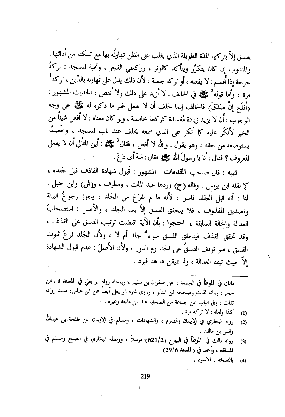 يَفْسُقُ إِلَّا بِتَرْكِهَا الْمُدَّةَ الطَّوِيلَةَ الَّذِي يَغْلُبُ عَلَى الظَّنِّ تَهَاوُنُهُ بِهَا مَعَ تَمَكُّنِهِ مِنْ أَدَائِهَا وَالْمَنْدُوبُ إِنْ كَانَ يَتَكَرَّرُ وَيَتَأَكَّدُ كَالْوَتْرِ وَرَكْعَتَيِ الْفَجْرِ وَتَحِيَّةِ الْمَسْجِدِ تَرَكَهُ جُرْحَةً إِذَا أَقْسَمَ لَا يَفْعَلُهُ أَوْ تَرَكَهُ جُمْلَةً لِأَنَّ ذَلِك يدل على تهاونه بِالدّينِ تَرْكِهِ مَرَّةً وَأَمَّا قَوْلُهُ - صَلَّى اللَّهُ عَلَيْهِ وَسَلَّم َ - فِي الْحَالِفِ لَا أَزِيدُ عَلَى ذَلِكَ وَلَا أَنْقُصُ الْحَدِيثُ الْمَشْهُورُ أَفْلَحَ إِنْ صَدَقَ فَالْحَالِفُ انما حلف ان لَا يَفْعَلَ غَيْرَ مَا ذَكَرَهُ لَهُ - صَلَّى اللَّهُ عَلَيْهِ وَسَلَّم َ - على وَجه الْوُجُوب ان لَا يَزِيدَ زِيَادَةً مُفْسِدَةً كَرَكْعَةٍ خَامِسَةٍ وَلَوْ كَانَ مَعْنَاهُ لَا أَفْعَلُ شَيْئًا مِنَ الْخَيْرِ لَأَنْكَرَ عَلَيْهِ كَمَا أَنْكَرَ عَلَى الَّذِي سَمِعَهُ يَحْلِفُ عِنْدَ بَابِ الْمَسْجِدِ وَخَصْمُهُ يَسْتَوْضِعُهُ مِنْ حَقِّهِ وَهُوَ يَقُولُ وَاللَّهِ لَا أَفْعَلُ فَقَالَ - صَلَّى اللَّهُ عَلَيْهِ وَسَلَّم َ - ايْنَ المتالي ان لَا يَفْعَلَ الْمَعْرُوفَ فَقَالَ أَنَا يَا رَسُولَ اللَّهِ - صَلَّى اللَّهُ عَلَيْهِ وَسَلَّم َ - فَقَالَ مَهْ أَيْ دَعْ تَنْبِيهٌ قَالَ صَاحِبُ الْمُقَدِّمَاتِ الْمَشْهُورُ قَبُولُ شَهَادَةِ الْقَاذِفِ قَبْلَ جَلْدِهِ كَمَا نَقَلَهُ ابْنُ يُونُسَ وَقَالَهُ ح وَرَدَّهَا عبد الْملك ومطرف وش وَابْن حَنْبَل لنا أَنه قبل الْجلد فَاسق لِأَنَّهُ مَا لَمْ يَفْرَغْ مِنَ الْجَلْدِ يَجُوزُ رُجُوعُ الْبَيِّنَةِ وَتَصْدِيقُ الْمَقْذُوفِ فَلَا يَتَحَقَّقُ الْفِسْقُ إِلَّا بَعْدَ الْجَلْدِ وَالْأَصْلُ اسْتِصْحَابُ الْعَدَالَةِ وَالْحَالَةِ السَّابِقَةِ احْتَجُّوا بِأَنَّ الْآيَةَ اقْتَضَتْ تَرْتِيبَ الْفِسْقِ عَلَى الْقَذْفِ وَقَدْ تَحَقَّقَ الْقَذْفُ فَيَتَحَقَّقُ الْفِسْقُ سَوَاءٌ جُلِدَ أَمْ لَا وَلِأَنَّ الْجَلْدَ فَرْعُ ثُبُوتِ الْفِسْقِ فَلَوْ تَوَقَّفَ الْفِسْقُ عَلَى الْحَدِّ لَزِمَ الدَّوْرُ وَلِأَنَّ الْأَصْلَ عَدَمُ قَبُولِ الشَّهَادَةِ الا حَيْثُ تَيَقنا الْعَدَالَة وَلم تتيقن هَاهُنَا فَيرد