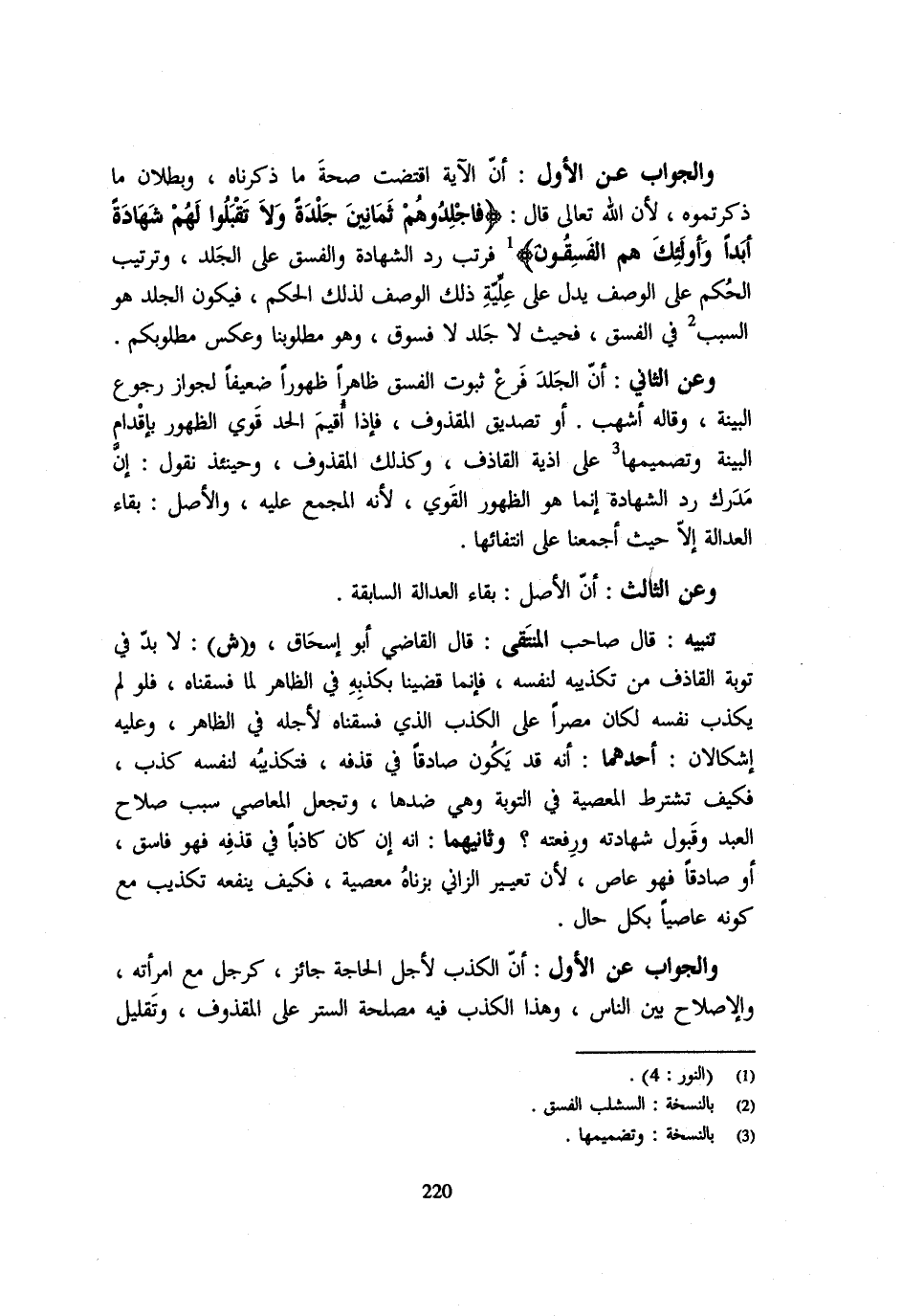 وَالْجَوَابُ عَنِ الْأَوَّلِ أَنَّ الْآيَةَ اقْتَضَتْ صِحَةَ مَا ذَكَرْنَاهُ وَبُطْلَانَ مَا ذَكَرْتُمُوهُ لِأَنَّ اللَّهَ تَعَالَى قَالَ {فَاجْلِدُوهُمْ ثَمَانِينَ جَلْدَةً وَلا تَقْبَلُوا لَهُمْ شَهَادَةً أبدا وَأُولَئِكَ هم الْفَاسِقُونَ} فَرَتَّبَ رَدَّ الشَّهَادَةِ وَالْفِسْقِ عَلَى الْجَلْدِ وَتَرْتِيبُ الحكم على الْوَصْف يدل على علية ذَلِك الْوَصْفِ لِذَلِكَ الْحُكْمِ فَيَكُونُ الْجَلْدُ هُوَ السَّبَبَ فِي الْفِسْقِ فَحَيْثُ لَا جَلْدَ لَا فُسُوقَ وَهُوَ مَطْلُوبُنَا وَعَكْسُ مَطْلُوبِكُمْ وَعَنِ الثَّانِي أَنَّ الْجلد فرع ثُبُوت الْفسق ظَاهرا ظُهُورًا ضَعِيفًا لِجَوَازِ رُجُوعِ الْبَيِّنَةِ وَقَالَهُ أَشْهَبُ أَوْ تَصْدِيقِ الْمَقْذُوفِ فَإِذَا أُقِيمَ الْحَدُّ قَوِيَ الظُّهُورُ بِإِقْدَامِ الْبَيِّنَةِ وَتَصْمِيمِهَا عَلَى أَذِيَّةِ الْقَاذِفِ وَكَذَلِكَ الْمَقْذُوفُ وَحِينَئِذٍ نَقُولُ إِنَّ مَدْرَكَ رَدِّ الشَّهَادَةِ إِنَّمَا هُوَ الظُّهُورُ الْقَوِيُّ لِأَنَّهُ الْمُجْمَعُ عَلَيْهِ الاصل بَقَاءُ الْعَدَالَةِ إِلَّا حَيْثُ أَجْمَعْنَا عَلَى انْتِفَائِهَا وَعَنِ الثَّالِثِ أَنَّ الْأَصْلَ بَقَاءُ الْعَدَالَةِ السَّابِقَةِ تَنْبِيهٌ قَالَ صَاحِبُ الْمُنْتَقَى قَالَ الْقَاضِي أَبُو اسحاق وش لابد فِي تَوْبَة الْقَاذِف من تَكْذِيبه لنَفسِهِ فَإِنَّمَا قَضَيْنَا بِكَذِبِهِ فِي الظَّاهِرِ لَمَّا فَسَّقْنَاهُ فَلَوْ لَمْ يُكَذِّبْ نَفْسَهُ لَكَانَ مُصِرًّا عَلَى الْكَذِبِ الَّذِي فَسَّقْنَاهُ لِأَجْلِهِ فِي الظَّاهِرِ وَعَلَيْهِ إِشْكَالَانِ أَحَدُهُمَا أَنَّهُ قَدْ يَكُونُ صَادِقًا فِي قَذْفِهِ فَتَكْذِيبُهُ لِنَفْسِهِ كَذِبٌ فَكَيْفَ تُشْتَرَطُ الْمَعْصِيَةُ فِي التَّوْبَةِ وَهِيَ ضِدُّهَا وَتُجْعَلُ الْمَعَاصِي سَبَبَ صَلَاحِ الْعَبْدِ وَقَبُولِ شَهَادَتِهِ وَرِفْعَتِهِ وَثَانِيهُمَا أَنَّهُ إِنْ كَانَ كَاذِبًا فِي قَذْفِهِ فَهُوَ فَاسِقٌ أَوْ صَادِقًا فَهُوَ عَاصٍ لِأَنَّ تَعْيِيرَ الزَّانِي بِزِنَاهُ مَعْصِيّة فَكيف يَنْفَعهُ تَكْذِيب مَعَ كَوْنِهِ عَاصِيًا بِكُلِّ حَالٍ وَالْجَوَابُ عَنِ الْأَوَّلِ أَنَّ الْكَذِبَ لِأَجْلِ الْحَاجَةِ جَائِزٌ كَرَجُلٍ مَعَ امْرَأَتِهِ وَالْإِصْلَاحِ بَيْنَ النَّاسِ وَهَذَا الْكَذِبُ فِيهِ مَصْلَحَةُ السَّتْرِ عَلَى الْمَقْذُوفِ وَتَقْلِيلُ