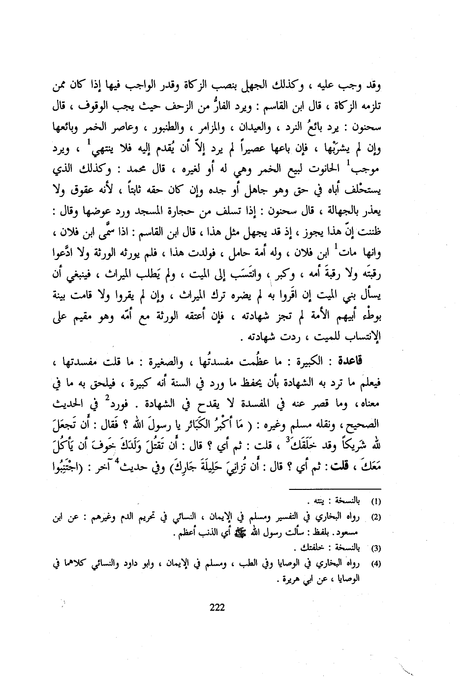 وَقد وَجب علبه وَكَذَلِكَ الْجَهْلُ بِنُصُبِ الزَّكَاةِ وَقَدْرِ الْوَاجِبِ فِيهَا إِذَا كَانَ مِمَّنْ تَلْزَمُهُ الزَّكَاةُ قَالَ ابْنُ الْقَاسِمِ وَيُرَدُّ الْفَارُّ مِنَ الزَّحْفِ حَيْثُ يَجِبُ الْوُقُوفُ قَالَ سَحْنُونٌ يُرَدُّ بَائِعُ النَّرْدِ وَالْعِيدَانِ والمزامر وَالطُّنْبُورِ وَعَاصِرُ الْخَمْرِ وَبَائِعُهَا وَإِنْ لَمْ يَشْرَبْهَا فَإِنَّ بَاعَهَا عَصِيرًا لَمْ يُرَدَّ إِلَّا أَنْ يقدم إِلَيْهِ فَلَا يَنْتَهِي وَيرد مُوجب الْحَانُوتِ لِبَيْعِ الْخَمْرِ وَهِيَ لَهُ أَوْ لِغَيْرِهِ قَالَ مُحَمَّدٌ وَكَذَلِكَ الَّذِي يَسْتَحْلِفُ أَبَاهُ فِي حُقٍّ وَهُوَ جَاهِلٌ أَوْ جَدَّهُ وَإِنْ كَانَ حَقه ثَابتا لِأَنَّهُ عقوق وَلَا يعدر بِالْجَهَالَةِ قَالَ سَحْنُونٌ إِذَا تَسَلَّفَ مِنْ حِجَارَةِ الْمَسْجِدِ وَرَدَّ عِوَضَهَا وَقَالَ ظَنَنْتُ أَنَّ هَذَا يجوز إِذْ قَدْ يُجْهَلُ مِثْلُ هَذَا قَالَ ابْنُ الْقَاسِم اذا سمى ابْن فلَان وَأَنَّهَا مَاتَ ابْن فُلَانٌ وَلَهُ أَمَةٌ حَامِلٌ فَوُلَدَتْ هَذَا فَلَمْ يورثه وَلَا ادَّعَوْا رَقَبَتَهُ وَلَا رَقَبَةَ أُمِّهِ وَكَبُرَ وَانْتَسَبَ إِلَى الْمَيِّتِ وَلَمْ يَطْلُبِ الْمِيرَاثَ فَيَنْبَغِي أَنْ يَسْأَلَ بَنِي الْمَيِّتِ إِنْ أَقَرُّوا بِهِ لَمْ يَضُرَّهُ تَرْكُ الْمِيرَاثِ وَإِنْ لَمْ يُقِرُّوا وَلَا قَامَتْ بَيِّنَةٌ بِوَطْءِ أَبِيهِمُ الْأَمَةَ لَمْ تَجُزْ شَهَادَتُهُ فَإِنْ أَعْتَقَهُ الْوَرَثَةُ مَعَ أُمِّهِ وَهُوَ مُقِيمٌ عَلَى الِانْتِسَابِ لِلْمَيِّتِ رُدَّتْ شَهَادَتُهُ قَاعِدَةٌ الْكَبِيرَةُ مَا عَظُمَتْ مَفْسَدَتُهَا وَالصَّغِيرَةُ مَا قلت مفسدتها فَيعلم مَا تُرَدُّ بِهِ الشَّهَادَةُ بِأَنْ يُحْفَظَ مَا ورد فِي السّنة أَنَّهَا كَبِيرَةٌ فَيَلْحَقُ بِهِ مَا فِي مَعْنَاهُ وَمَا قَصُرَ عَنْهُ فِي الْمَفْسَدَةِ لَا يَقْدَحُ فِي الشَّهَادَةِ فَوَرَدَ فِي الْحَدِيثِ الصَّحِيحِ وَنَقَلَهُ مُسْلِمٌ وَغَيْرُهُ مَا أَكْبَرُ الَكَبائِرِ يَا رَسُولَ اللَّهِ فَقَالَ أَنْ تَجْعَلَ لِلَّهِ شَرِيكًا وَقَدْ خَلَقَكَ قُلْتُ ثُمَّ أَيُّ قَالَ أَنْ تَقْتُلَ وَلَدَكَ خَوَفَ أَنْ يَأْكُلَ مَعَكَ قُلْتُ ثُمَّ أَيْ قَالَ أَنْ تُزَانِيَ حَلِيلَةَ جَارِكَ وَفِي حَدِيثٍ اخر اجتنبوا