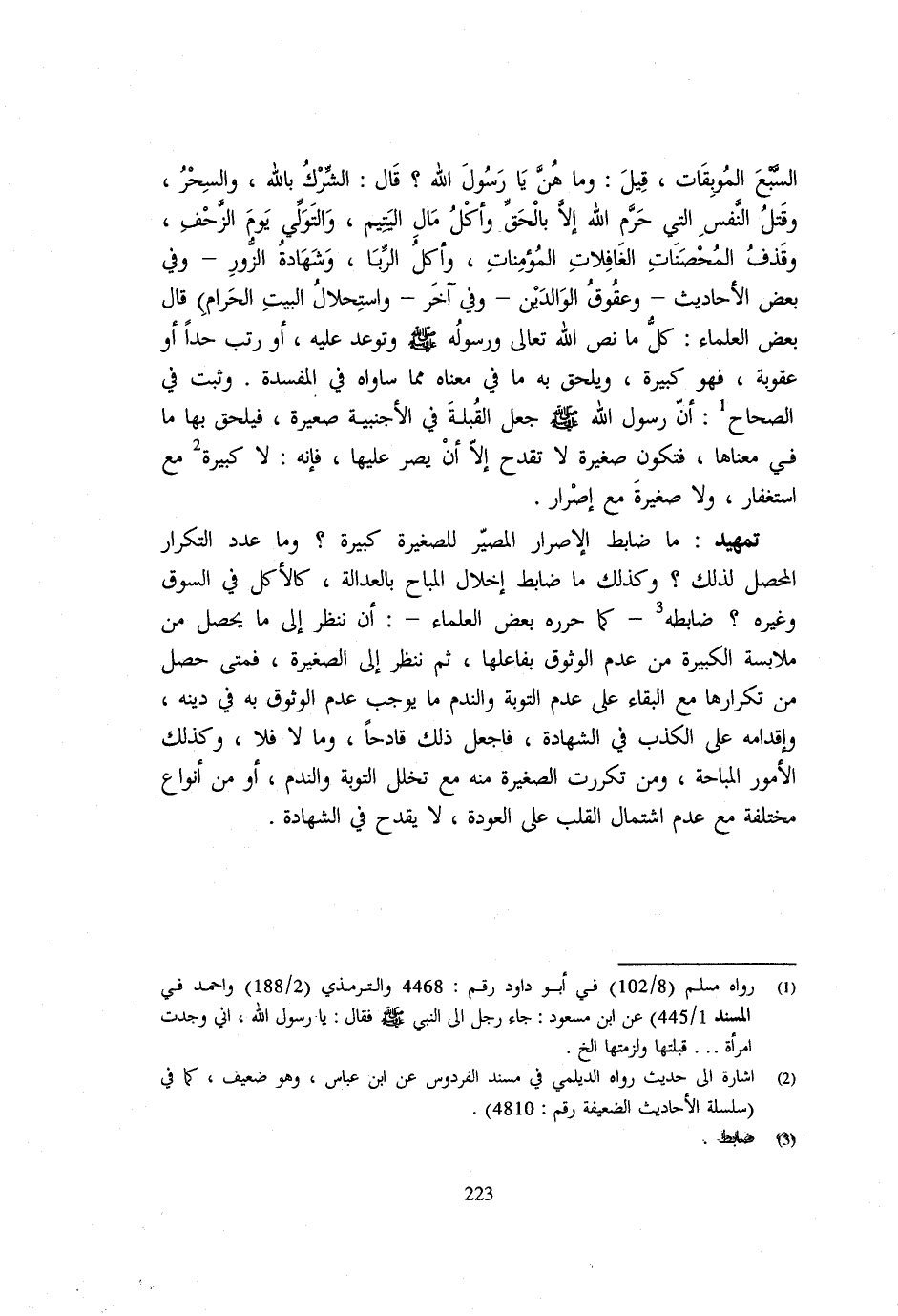 السَّبْعَ الْمُوبِقَاتِ قِيلَ وَمَا هُنَّ يَا رَسُولَ اللَّهِ قَالَ الشِّرْكُ بِاللَّهِ وَالسِّحْرُ وَقَتْلُ النَّفْسِ الَّتِي حَرَّمَ اللَّهُ إِلَّا بِالْحَقِّ وَأَكْلُ مَالِ الْيَتِيمِ وَالتَّوَلِّي يَوْمَ الزَّحْفِ وَقَذْفُ الْمُحْصَنَاتِ الْغَافِلَاتِ الْمُؤْمِنَاتِ وَأَكْلُ الرِّبَا وَشَهَادَةُ الزُّورِ وَفِي بَعْضِ الْأَحَادِيثِ وَعُقُوقُ الْوَالِدَيْنِ وَفِي آخَرَ وَاسْتِحْلَالُ الْبَيْتِ الْحَرَامِ قَالَ بَعْضُ الْعُلَمَاءِ كُلُّ مَا نَصَّ اللَّهُ تَعَالَى وَرَسُولُهُ - صَلَّى اللَّهُ عَلَيْهِ وَسَلَّم َ - وتعد عَلَيْهِ أَوْ رَتَّبَ حَدًّا أَوْ عُقُوبَةً فَهُوَ كَبِيرَةٌ وَيَلْحَقُ بِهِ مَا فِي مَعْنَاهُ مِمَّا ساواه فِي الْمفْسدَة مَعْنَاهَا وَثَبَتَ فِي الصِّحَاحِ أَنَّ رَسُولَ اللَّهِ - صَلَّى اللَّهُ عَلَيْهِ وَسَلَّم َ - جعل الْقبْلَة فِي الاجنبية صعيرة فَيلْحق بهَا مَا فِي مَعْنَاهُ فَتَكُونُ صَغِيرَةً لَا تَقْدَحُ إِلَّا أَنْ يُصِرَّ عَلَيْهَا فَإِنَّهُ لَا كَبِيرَةَ مَعَ اسْتِغْفَارٍ وَلَا صَغِيرَةَ مَعَ إِصْرَارٍ تَمْهِيدٌ مَا ضَابِطُ الْإِصْرَارِ الْمُصَيِّرِ لِلصَّغِيرَةِ كَبِيرَةً وَمَا عَدَدُ التَّكْرَارِ الْمُحَصِّلِ لِذَلِكَ وَكَذَلِكَ مَا ضَابِطُ إِخْلَالِ الْمُبَاحِ بِالْعَدَالَةِ كَالْأَكْلِ فِي السُّوقِ وَغَيْرِهِ ضَابِطُهُ كَمَا حَرَّرَهُ بَعْضُ الْعُلَمَاءِ أَنْ نَنْظُرَ إِلَى مَا يَحْصُلُ مِنْ مُلَابَسَةِ الْكَبِيرَةِ مِنْ عَدَمِ الْوُثُوقِ بِفَاعِلِهَا ثُمَّ نَنْظُرَ إِلَى الصَّغِيرَةِ فَمَتَى حَصَلَ مِنْ تَكْرَارِهَا مَعَ الْبَقَاءِ عَلَى عَدَمِ التَّوْبَةِ وَالنَّدَمِ مَا يُوجِبُ عَدَمَ الْوُثُوقِ بِهِ فِي دِينِهِ وَإِقْدَامِهِ عَلَى الْكَذِبِ فِي الشَّهَادَةِ فَاجْعَلْ ذَلِكَ قَادِحًا وَمَا لَا فَلَا وَكَذَلِكَ الْأُمُورُ الْمُبَاحَةُ وَمَنْ تَكَرَّرَتِ الصَّغِيرَةُ مِنْهُ مَعَ تَخَلُّلِ التَّوْبَةِ وَالنَّدَمِ أَوْ مِنْ أَنْوَاعٍ مُخْتَلِفَةٍ مَعَ عَدَمِ اشْتِمَالِ الْقَلْبِ عَلَى الْعَوْدَةِ لَا يَقْدَحُ فِي الشَّهَادَة