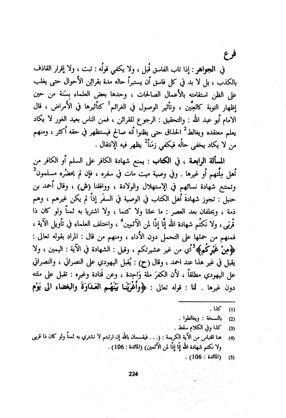 فِي الْجَوَاهِرِ إِذَا تَابَ الْفَاسِقُ قُبِلَ وَلَا يَكْفِي قَوْلُهُ تُبْتُ وَلَا إِقْرَارُ الْقَاذِفِ بِالْكَذِبِ بل لابد فِي كُلِّ فَاسِقٍ أَنْ يُسْتَبْرَأَ حَالُهُ مُدَّةً بِقَرَائِنِ الْأَحْوَالِ حَتَّى يَغْلِبَ عَلَى الظَّنِّ اسْتِقَامَتُهُ بِالْأَعْمَالِ الصَّالِحَاتِ وَحَدَّهَا بَعْضُ الْعُلَمَاءِ بِسَنَةٍ مِنْ حِين اظهار التَّوْبَة كالعنين وتاثير الْوُصُول فِي الغرائم كَتَأْثِيرِهَا فِي الْأَمْرَاضِ قَالَ الْإِمَامُ أَبُو عَبْدِ اللَّهِ وَالتَّحْقِيقُ الرُّجُوعُ لِلْقَرَائِنِ فَمِنَ النَّاسِ بَعِيدُ الْغَوْرِ لَا يَكَادُ يُعْلَمُ مُعْتَقَدُهُ وَيُغَالِطُ الْحُذَّاقَ حَتَّى يَظُنُّوا أَنَّهُ صَالِحٌ فَيَسْتَظْهِرُ فِي حَقِّهِ اكثر وَمِنْهُم من لايكاد يخفى حَاله فَيَكْفِي زَمنا يظْهر فِيهِ الِانْتِقَال الْمَسْأَلَةُ الرَّابِعَةُ فِي الْكِتَابِ يَمْنَعُ شَهَادَةَ الْكَافِرِ على السّلم أَوِ الْكَافِرِ مِنْ أَهْلِ مِلَّتِهِمْ أَوْ غَيْرِهَا وَفِي وَصِيَّة ميت مَاتَ فِي سَفَره فَإِن لَمْ يَحْضُرْهُ مُسْلِمُونَ وَتَمْتَنِعْ شَهَادَةُ نِسَائِهِمْ فِي الِاسْتِهْلَالِ وَالْوِلَادَةِ وَوَافَقَنَا ش وَقَالَ أَحْمَدُ بْنُ حَنْبَلٍ تَجُوزُ شَهَادَةُ أَهْلِ الْكِتَابِ فِي الْوَصِيَّةِ فِي السَّفَرِ إِذَا لَمْ يَكُنْ غَيْرُهُمْ وَهُمْ ذِمَّةٌ وَيَحْلِفَانِ بَعْدَ الْعَصْرِ مَا خَانَا وَلَا كَتَمَا وَلَا اشْتَرَيَا بِهِ ثَمَنًا وَلَوْ كَانَ ذَا قُرْبَى وَلَا نَكْتُمُ شَهَادَةَ اللَّهِ إِنَّا إِذا لَمِنَ الْآثِمِينَ وَاخْتَلَفَ الْعُلَمَاءُ فِي تَأْوِيلِ الْآيَةِ فَمِنْهُمْ مَنْ حَمَلَهَا عَلَى التَّحَمُّلِ دُونَ الْأَدَاءِ وَمِنْهُمْ مَنْ قَالَ الْمُرَادُ بِقَوْلِهِ تَعَالَى {مِنْ غَيْرِكُمْ} أَيْ مِنْ غَيْرِ عَشِيرَتِكُمْ وَقِيلَ الشَّهَادَة فِي الاية الْيَمين وَلَا يقبل فِي غَيْرِ هَذَا عِنْدَ أَحْمَدَ وَقَالَ ح يُقْبَلُ الْيَهُودِيُّ عَلَى النَّصْرَانِيِّ وَالنَّصْرَانِيُّ عَلَى الْيَهُودِيِّ مُطْلَقًا لِأَنَّ الْكُفْرَ مِلَّةٌ وَاحِدَةٌ وَعَنْ قَتَادَةَ وَغَيْرِهِ تُقْبَلُ عَلَى مِلَّتِهِ دُونَ غَيْرِهَا لَنَا قَوْله تَعَالَى {واغرينا بَينهم الْعَدَاوَة والبغضاء إِلَى يَوْم