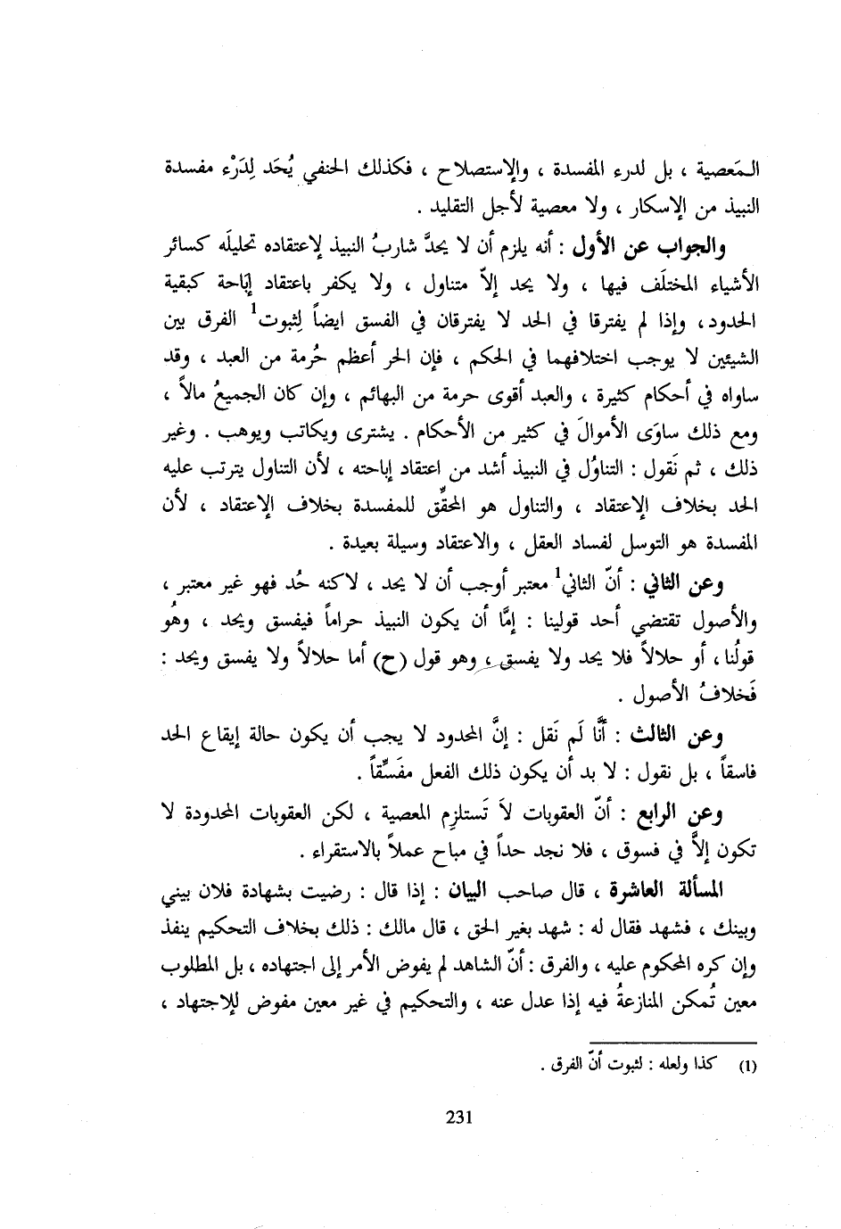 الْمَعْصِيَةِ بَلْ لِدَرْءِ الْمَفْسَدَةِ وَالِاسْتِصْلَاحِ فَكَذَلِكَ الْحَنَفِيُّ يُحَدُّ لِدَرْءِ مَفْسَدَةِ النَّبِيذِ مِنَ الْإِسْكَارِ وَلَا مَعْصِيَةَ لِأَجْلِ التَّقْلِيدِ وَالْجَوَابُ عَنِ الْأَوَّلِ أَنَّهُ يلْزم ان لَا يُحَدَّ شَارِبُ النَّبِيذِ لِاعْتِقَادِهِ تَحْلِيلَهُ كَسَائِرِ الْأَشْيَاءِ الْمُخْتَلَفِ فِيهَا وَلَا يُحَدُّ إِلَّا مُتَنَاوِلٌ وَلَا يكفر باعتقاد اباحة كَبَقِيَّةِ الْحُدُودِ وَإِذَا لَمْ يَفْتَرِقَا فِي الْحَدِّ لَا يفترقان فِي الْفسق ايضا لثُبُوت الْفَرْقِ بَيْنَ الشَّيْئَيْنِ لَا يُوجِبُ اخْتِلَافَهُمَا فِي الْحُكْمِ فَإِنَّ الْحُرَّ أَعْظَمُ حُرْمَةً مِنَ الْعَبْدِ وَقَدْ سَاوَاهُ فِي أَحْكَامٍ كَثِيرَةٍ وَالْعَبْدُ أَقْوَى حُرْمَةً مِنَ الْبَهَائِمِ وَإِنْ كَانَ الْجَمِيعُ مَالًا وَمَعَ ذَلِكَ سَاوَى الْأَمْوَالَ فِي كَثِيرٍ مِنَ الْأَحْكَامِ يُشْتَرَى وَيُكَاتَبُ وَيُوهَبُ وَغَيْرَ ذَلِكَ ثُمَّ نَقُولُ التَّنَاوُلُ فِي النَّبِيذِ أَشَدُّ مِنَ اعْتِقَادِ إِبَاحَتِهِ لِأَنَّ التَّنَاوُلَ يَتَرَتَّبُ عَلَيْهِ الْحَدُّ بِخِلَافِ الِاعْتِقَادِ وَالتَّنَاوُلُ هُوَ الْمُحَقِّقُ لِلْمَفْسَدَةِ بِخِلَافِ الِاعْتِقَادِ لِأَنَّ الْمَفْسَدَةَ هُوَ التَّوَسُّلُ لِفَسَادِ الْعَقْلِ وَالِاعْتِقَادُ وَسِيلَة بعيدَة وَعَن الثَّانِي ان الثَّانِي مُعْتَبر اوجب ان لَا يحد لاكنه حُدَّ فَهُوَ غَيْرُ مُعْتَبَرٍ وَالْأُصُولُ تَقْتَضِي أَحَدَ قَوْلَيْنَا إِمَّا أَنْ يَكُونَ النَّبِيذُ حَرَامًا فَيُفَسَّقُ وَيُحَدُّ وَهُوَ قَوْلُنَا أَوْ حَلَالًا فَلَا يُحَدُّ وَلَا يُفَسَّقُ وَهُوَ قَوْلُ ح أَمَّا حَلَالًا وَلَا يُفَسَّقُ وَيُحَدُّ فَخِلَافُ الْأُصُولِ وَعَنِ الثَّالِثِ أَنَّا لَمْ نَقُلْ إِنَّ الْمَحْدُودَ لَا يَجِبُ أَنْ يَكُونَ حَالَةَ إِيقَاعِ الْحَدِّ فَاسِقًا بَلْ نَقُولُ لَا بُدَّ أَنْ يَكُونَ ذَلِكَ الْفِعْلُ مُفَسِّقًا وَعَنِ الرَّابِعِ أَنَّ الُعُقُوبَاتِ لَا تَسْتَلْزِمُ الْمَعْصِيَةَ لَكِنَّ الْعُقُوبَاتِ الْمَحْدُودَةَ لَا تَكُونُ إِلَّا فِي فُسُوقٍ فَلَا نَجِدُ حَدًّا فِي مُبَاحٍ عملا بالاستقراء الْمَسْأَلَةُ الْعَاشِرَةُ قَالَ صَاحِبُ الْبَيَانِ إِذَا قَالَ رَضِيتُ بِشَهَادَةِ فُلَانٍ بَيْنِي وَبَيْنَكَ فَشَهِدَ فَقَالَ لَهُ شَهِدَ بِغَيْرِ الْحَقِّ قَالَ مَالِكٌ ذَلِكَ بِخِلَافِ التَّحْكِيمِ يُنَفَّذُ وَإِنْ كَرِهَ الْمَحْكُومُ عَلَيْهِ وَالْفَرْقُ أَنَّ الشَّاهِدَ لَمْ يُفَوِّضِ الْأَمْرَ إِلَى اجْتِهَاده بل الْمَطْلُوب معِين تمكن النازعة فِيهِ إِذَا عَدَلَ عَنْهُ وَالتَّحْكِيمُ فِي غَيْرِ مُعَيَّنٍ مُفَوَّضٌ لِلِاجْتِهَادِ