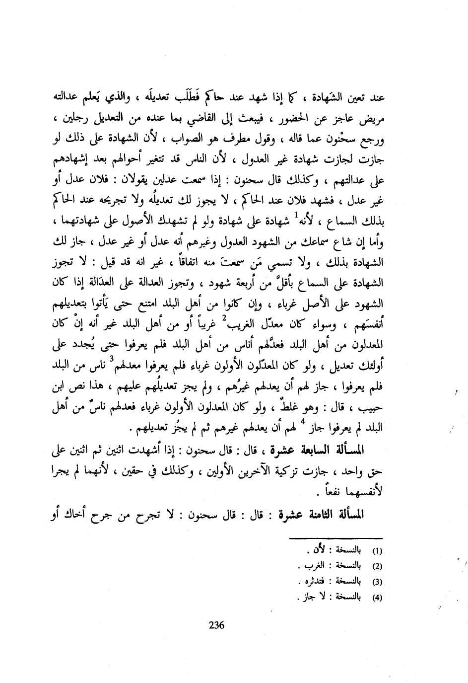 عِنْدَ تَعَيُّنِ الشَّهَادَةِ كَمَا إِذَا شَهِدَ عِنْدَ حَاكِمٍ فَطَلَبَ تَعْدِيلَهُ وَالَّذِي يَعْلَمُ عَدَالَتَهُ مَرِيضٌ عَاجِزٌ عَنِ الْحُضُورِ فَيَبْعَثُ إِلَى الْقَاضِي بِمَا عِنْدَهُ مِنَ التَّعْدِيلِ رَجُلَيْنِ وَرَجَعَ سَحْنُونٌ عَمَّا قَالَهُ وَقَوْلُ مُطَرِّفٌ هُوَ الصَّوَابُ لِأَنَّ الشَّهَادَةَ عَلَى ذَلِكَ لَوْ جَازَتْ لَجَازَتْ شَهَادَةُ غَيْرِ الْعُدُولِ لَأَنَّ النَّاسَ قَدْ تَتَغَيَّرُ أَحْوَالُهُمْ بَعْدَ إِشْهَادِهِمْ عَلَى عَدَالَتِهِمْ وَكَذَلِكَ قَالَ سَحْنُونٌ إِذَا سَمِعْتَ عَدْلَيْنِ يَقُولَانِ فُلَانٌ عَدْلٌ أَوْ غَيْرُ عَدْلٍ فَشَهِدَ فُلَانٌ عِنْدَ الْحَاكِمِ لَا يَجُوزُ لَكَ تَعْدِيلُهُ وَلَا تَجْرِيحُهُ عِنْدَ الْحَاكِمِ بِذَلِكَ السَّمَاعِ لِأَنَّهُ شَهَادَةٌ عَلَى شَهَادَةٍ وَلَوْ لَمْ تُشْهِدْكَ الْأُصُولُ عَلَى شَهَادَتِهِمَا وَأَمَّا إِنْ شَاعَ سَمَاعُكَ مِنَ الشُّهُودِ الْعُدُولِ وَغَيْرِهِمْ أَنَّهُ عَدْلٌ أَوْ غَيْرُ عَدْلٍ جَازَ لَكَ الشَّهَادَةُ بِذَلِكَ وَلَا تُسَمِّي مَنْ سَمِعْتَ مِنْهُ اتِّفَاقًا غَيْرَ أَنَّهُ قَدْ قِيلَ لَا تَجُوزُ الشَّهَادَةُ عَلَى السماع بَاقِل من اربعة شُهُود وَتجوز الْعَدَالَة عَلَى الْعَدَالَةِ إِذَا كَانَ الشُّهُودُ عَلَى الْأَصْلِ غُرَبَاءَ وَإِنْ كَانُوا مِنْ أَهْلِ الْبَلَدِ امْتَنَعَ حَتَّى يَأْتُوا بِتَعْدِيلِهِمْ أَنْفُسَهُمْ وَسَوَاءٌ كَانَ مُعَدِّلُ الْغَرِيبِ غَرِيبًا أَوْ مِنْ أَهْلِ الْبَلَدِ غَيْرَ أَنَّهُ إِنْ كَانَ الْمُعَدَّلُونَ مِنْ أَهْلِ الْبَلَدِ فَعَدَّلَهُمْ أُنَاسٌ مِنْ أَهْلِ الْبَلَدِ فَلَمْ يُعَرَفُوا حَتَّى يُجَدَّدَ عَلَى أُولَئِكَ تَعْدِيلٌ وَلَوْ كَانَ المعدلون الاولون غرباء فَلم يعرفوا معدلهم نَاسٌ مِنَ الْبَلَدِ فَلَمْ يُعْرَفُوا جَازَ لَهُمْ أَنَّ يَعْدِلَهُمْ غَيْرُهُمْ وَلَمْ يَجُزْ تَعْدِيلُهُمْ عَلَيْهِمْ هَذَا نَصُّ ابْنِ حَبِيبٍ قَالَ وَهُوَ غَلَطٌ وَلَوْ كَانَ الْمُعَدَّلُونَ الْأَوَّلُونَ غُرَبَاءَ فَعَدَّلَهُمْ نَاسٌ مِنْ أَهْلِ الْبَلَدِ لَمْ يُعْرَفُوا جَازَ لَهُمْ أَنْ يُعَدِّلَهُمْ غَيْرُهُمْ ثُمَّ لَمْ يَجُزْ تَعْدِيلُهُمْ الْمَسْأَلَةُ السَّابِعَةَ عَشْرَةَ قَالَ قَالَ سَحْنُونٌ إِذَا أَشْهَدْتَ اثْنَيْنِ ثُمَّ اثْنَيْنِ عَلَى حَقٍّ وَاحِدٍ جَازَتْ تَزْكِيَةُ الْآخَرَيْنِ الْأَوَّلَيْنِ وَكَذَلِكَ فِي حَقَّيْنِ لِأَنَّهُمَا لَمْ يَجُرَّا لِأَنْفُسِهِمَا نَفْعًا الْمَسْأَلَةُ الثَّامِنَةَ عَشْرَةَ قَالَ قَالَ سَحْنُونٌ لَا تُجَرِّحْ مَنْ جَرَّحَ أَخَاكَ أَوْ