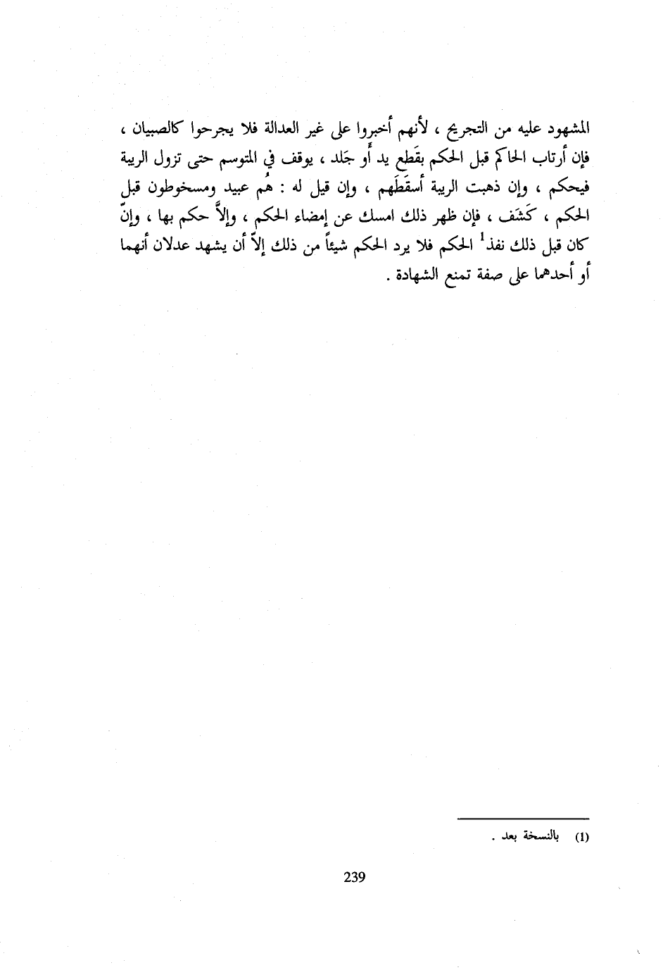 الْمَشْهُودُ عَلَيْهِ مِنَ التَّجْرِيحِ لِأَنَّهُمْ أَخْبَرُوا عَلَى غَيْرِ الْعَدَالَةِ فَلَا يُجَرَّحُوا كَالصِّبْيَانِ فَإِنِ ارْتَابَ الْحَاكِمُ قَبْلَ الْحُكْمِ بِقَطْعِ يَدٍ أَوْ جَلْدٍ يُوقَفُ فِي الْمُتَوَسَّمِ حَتَّى تَزُولَ الرِّيبَةُ فَيَحْكُمُ وَإِنْ ذَهَبَتِ الرِّيبَةُ أَسْقَطَهُمْ وَإِنْ قِيلَ لَهُ هُمْ عَبِيدٌ وَمَسْخُوطُونَ قَبْلَ الْحُكْمِ كَشَفَ فَإِنْ ظَهَرَ ذَلِكَ أَمْسَكَ عَنْ إِمْضَاءِ الْحُكْمِ وَإِلَّا حكم بهَا وان كَانَ قبل ذَلِك نفذ الحكم فَلَا يرد الحكم شَيْئًا مِنْ ذَلِكَ إِلَّا أَنْ يَشْهَدَ عَدْلَانِ أَنَّهُمَا أَوْ أَحَدَهُمَا عَلَى صِفَةٍ تَمْنَعُ الشَّهَادَةَ