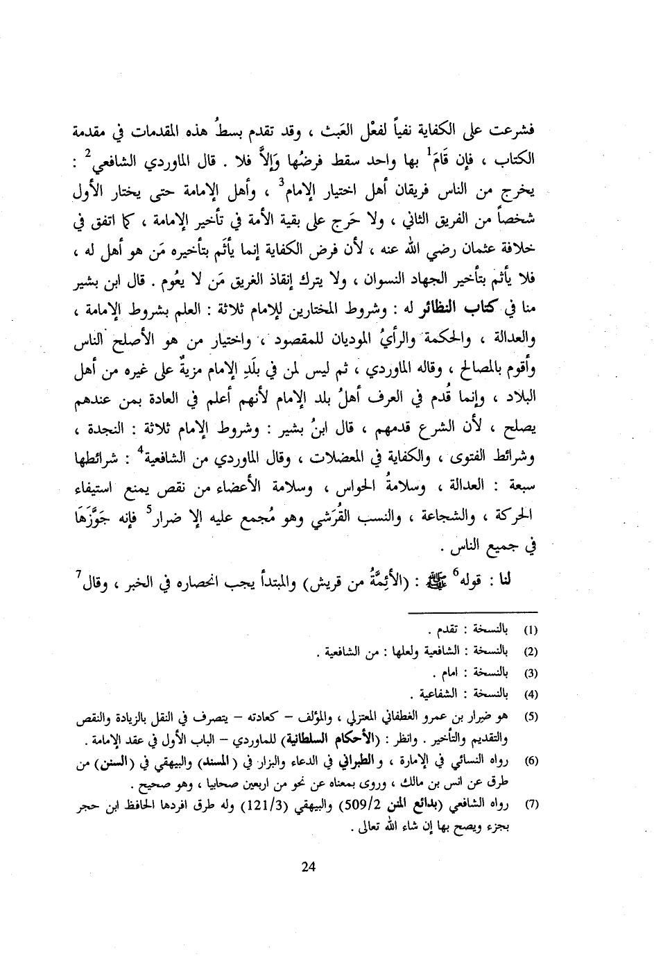 فَشُرِعَتْ عَلَى الْكِفَايَةِ نَفْيًا لِفِعْلِ الْعَبَثِ وَقَدْ تَقَدَّمَ بَسْطُ هَذِهِ الْمُقَدِّمَاتِ فِي مُقَدِّمَةِ الْكِتَابِ فَإِنْ قَامَ بِهَا وَاحِدٌ سَقَطَ فَرْضُهَا وَإِلَّا فَلَا قَالَ المواردي الشَّافِعِي يَخْرُجُ مِنَ النَّاسِ فَرِيقَانِ أَهْلُ اخْتِيَارِ الْإِمَامِ وَأَهْلُ الْإِمَامَةِ حَتَّى يَخْتَارَ الْأَوَّلُ شَخْصًا مِنَ الْفَرِيقِ الثَّانِي وَلَا حَرَجَ عَلَى بَقِيَّةِ الْأُمَّةِ فِي تَأْخِيرِ الْإِمَامَةِ كَمَا اتَّفَقَ فِي خِلَافَةِ عُثْمَانَ رَضِيَ اللَّهُ عَنْهُ لِأَنَّ فَرْضَ الْكِفَايَةِ إِنَّمَا يَأْثَمُ بِتَأْخِيرِهِ مَنْ هُوَ أَهْلٌ لَهُ فَلَا يَأْثَمُ بِتَأْخِيرِ الْجِهَادِ النِّسْوَانُ وَلَا يَتْرُكُ إِنْقَاذَ الْغَرِيقِ مَنْ لَا يَعُومُ قَالَ ابْنُ بَشِيرٍ مِنَّا فِي كِتَابِ النَّظَائِرِ لَهُ وَشُرُوطُ الْمُخْتَارِينَ لِلْإِمَامِ ثَلَاثَةٌ الْعِلْمُ بِشُرُوطِ الْإِمَامَةِ وَالْعَدَالَةُ وَالْحِكْمَةُ وَالرَّأْيُ الْمُوَدِّيَانِ لِلْمَقْصُودِ وَاخْتِيَارُ مَنْ هُوَ الْأَصْلَح النَّاس واقوم بالمصالح وَقَالَهُ المارودي ثُمَّ لَيْسَ لِمَنْ فِي بَلَدِ الْإِمَامِ مَزِيَّةٌ عَلَى غَيْرِهِ مِنْ أَهْلِ الْبِلَادِ وَإِنَّمَا قُدِّمَ فِي الْعُرْفِ أَهْلُ بَلَدِ الْإِمَامِ لِأَنَّهُمْ أَعْلَمُ فِي الْعَادَةِ بِمَنْ عِنْدَهُمْ يَصْلُحُ لِأَنَّ الشَّرْعَ قَدَّمَهُمْ قَالَ ابْنُ بَشِيرٍ وَشُرُوطُ الْإِمَامِ ثَلَاثَةٌ النَّجْدَةُ وَشَرَائِطُ الْفَتْوَى وَالْكِفَايَةُ فِي الْمُعْضِلَاتِ وَقَالَ المارودي مِنَ الشَّافِعِيَّةِ شَرَائِطُهَا سَبْعَةٌ الْعَدَالَةُ وَسَلَامَةُ الْحَوَاسِّ وَسَلَامَةُ الْأَعْضَاءِ مِنْ نَقْصٍ يَمْنَعُ اسْتِيفَاءَ الْحَرَكَةِ وَالشَّجَاعَةُ وَالنَّسَبُ الْقُرَشِيُّ وَهُوَ مُجْمَعٌ عَلَيْهِ إِلَّا ضِرَارٌ فَإِنَّهُ جَوَّزَهَا فِي جَمِيعِ النَّاسِ لَنَا قَوْله - صَلَّى اللَّهُ عَلَيْهِ وَسَلَّم َ - الْأَئِمَّةُ مِنْ قُرَيْشٍ وَالْمُبْتَدَأُ يَجِبُ انْحِصَارُهُ فِي الْخَبَر وَقَالَ